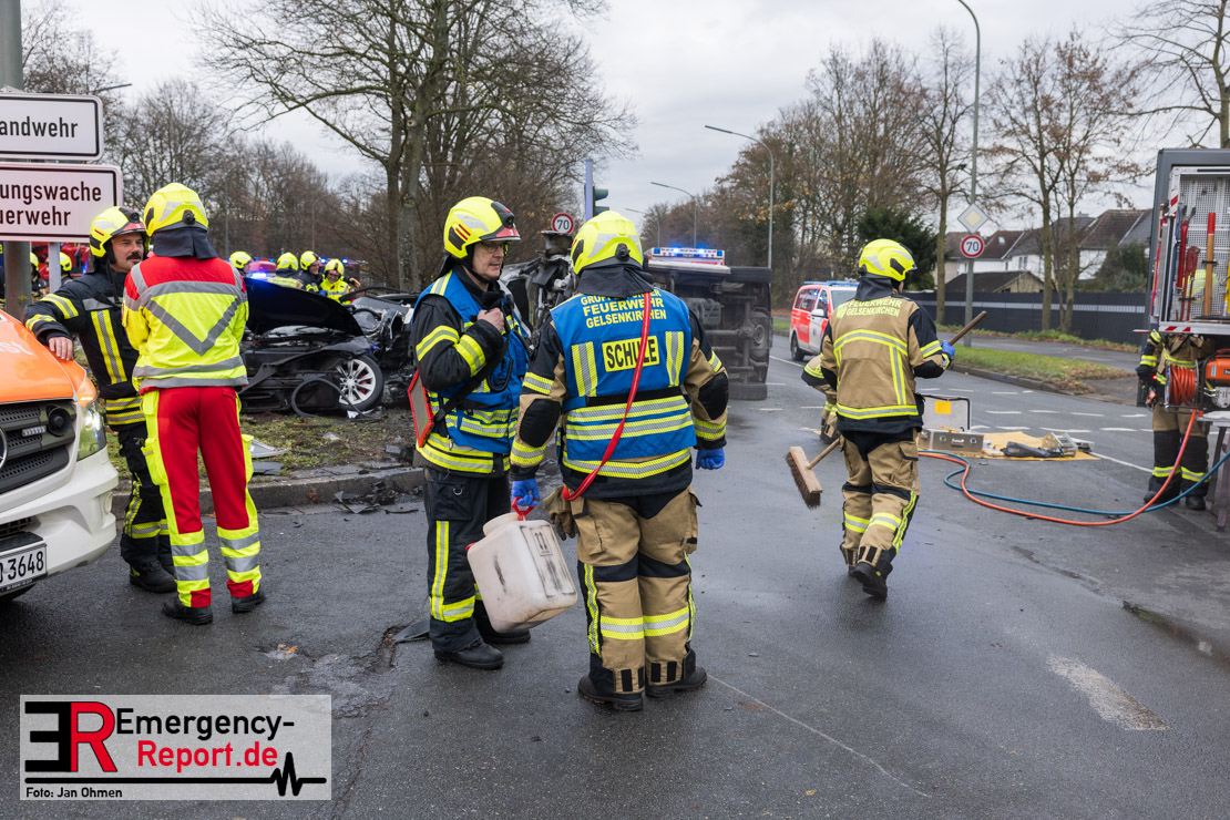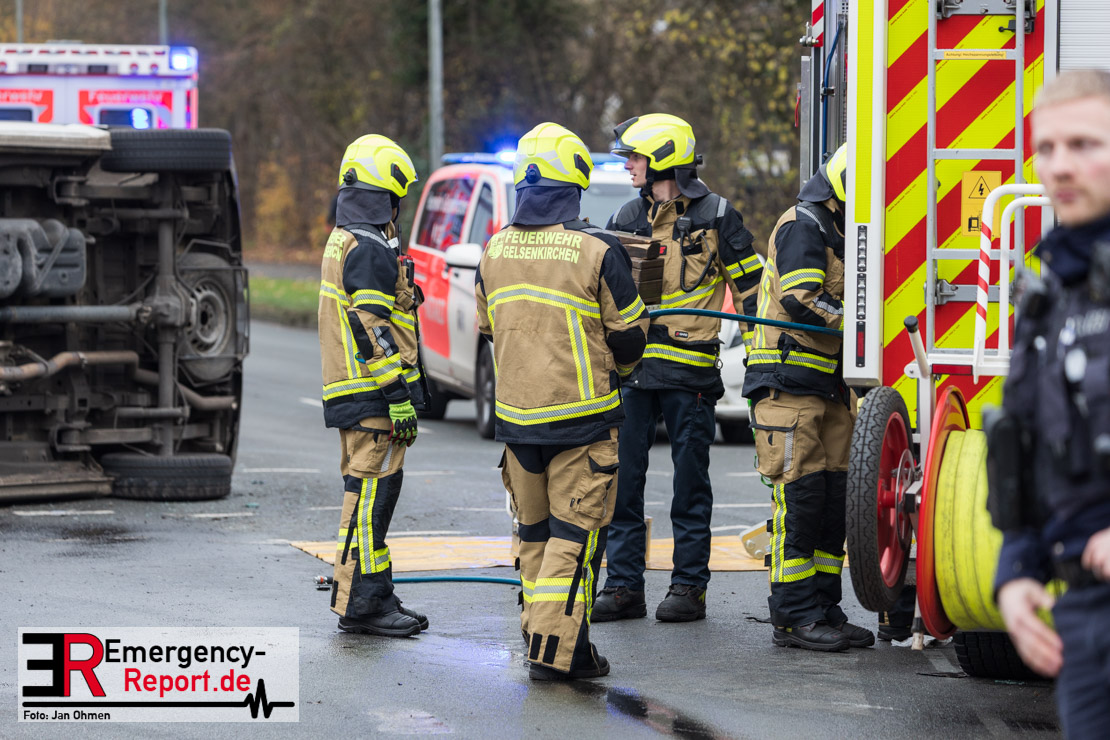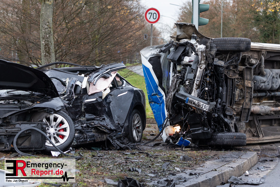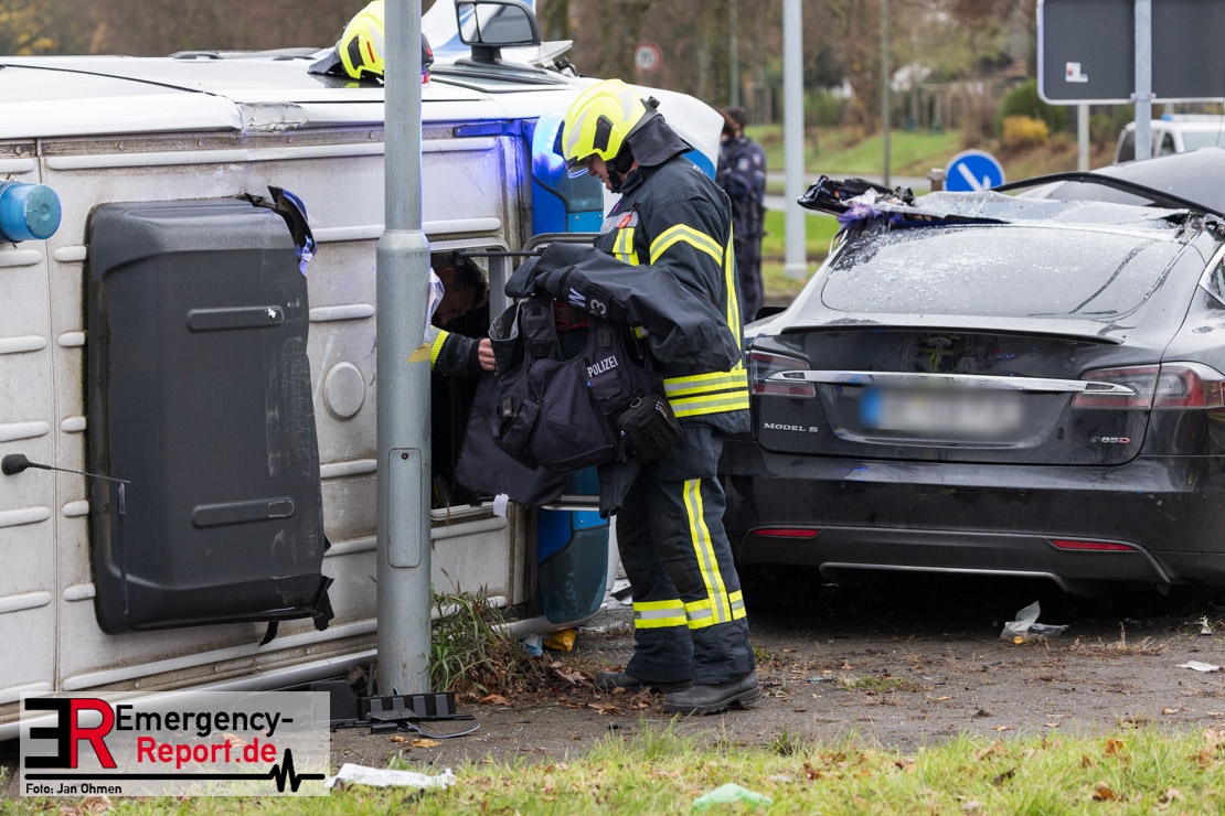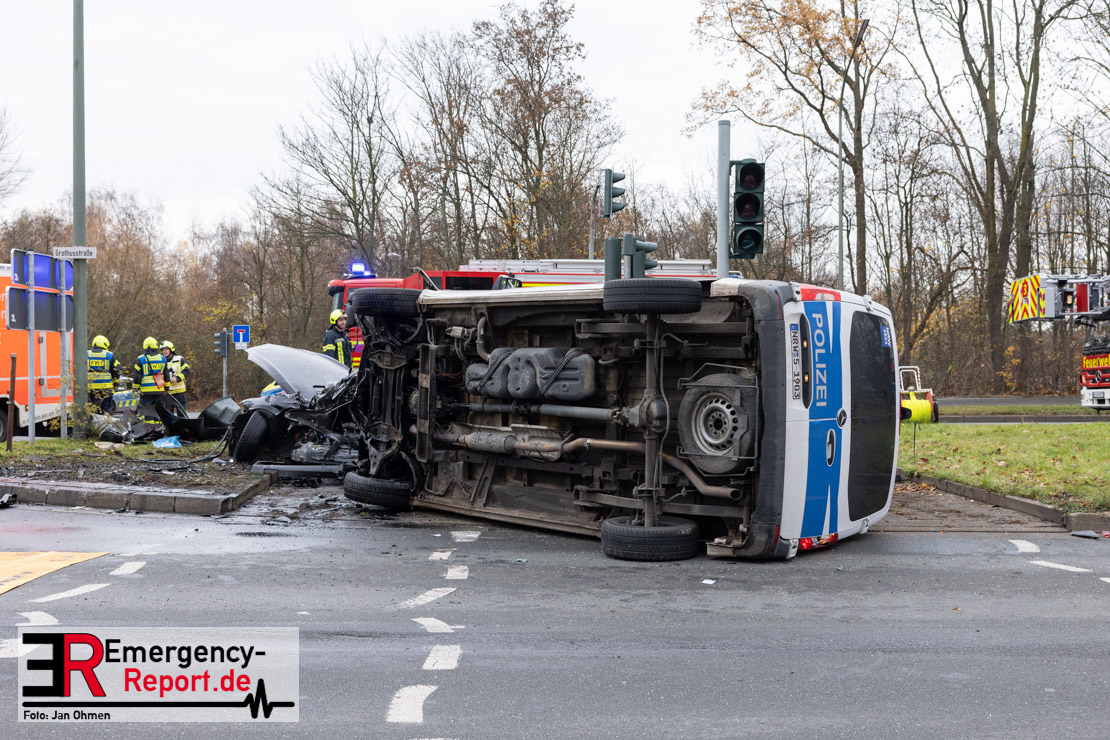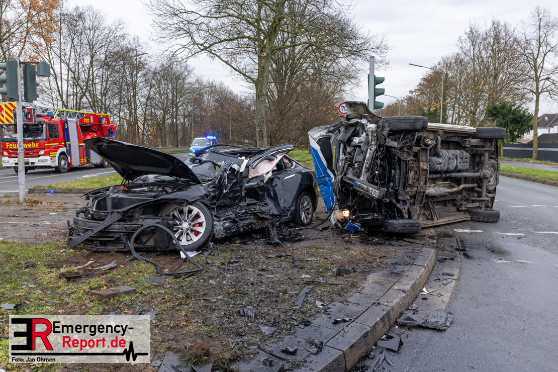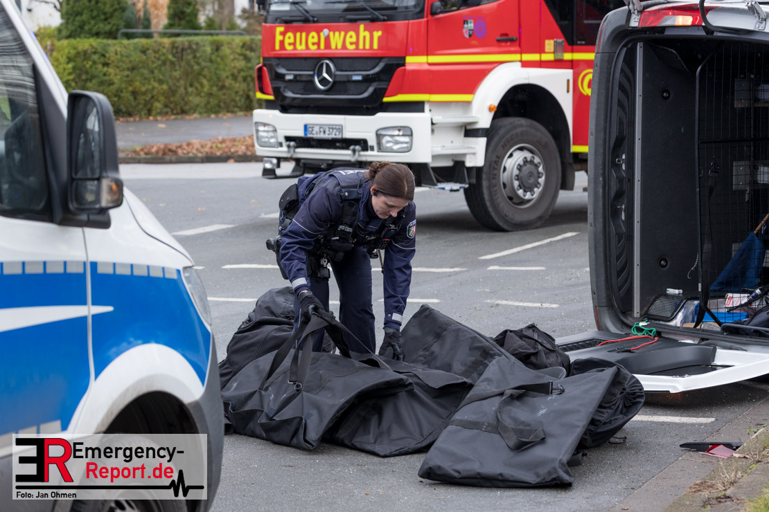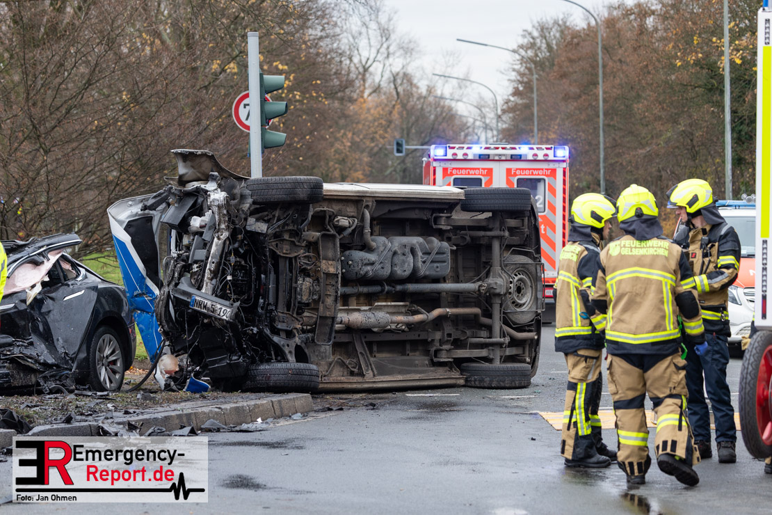 Erstmeldung: An der Kreuzung von Grothusstraße und „An der Landwehr“ sind am Mittwoch (3. Dezember 2025) in Gelsenkirchen ein Einsatzfahrzeug der Polizei und ein Pkw miteinander kollidiert. Gegen 10:15 Uhr hatte der Transporter mit drei Polizeibeamten die Kreuzung überquert und war beim Zusammenprall mit dem Pkw auf die Seite geschleudert worden. Nach aktuellem Stand wurden die drei Beamten verletzt, für den 52-jährigen Fahrer des Pkw besteht derzeit Lebensgefahr.