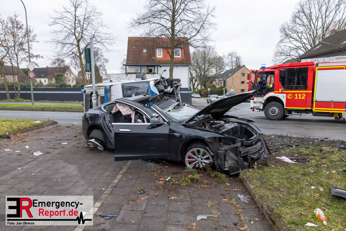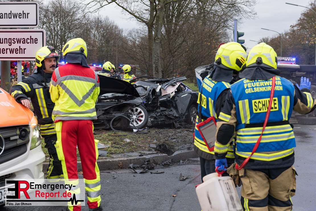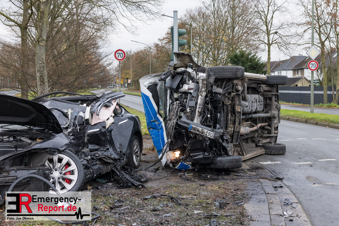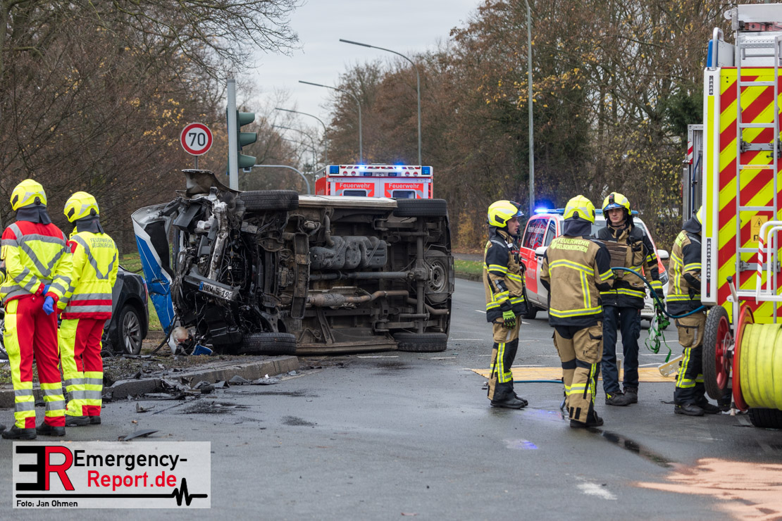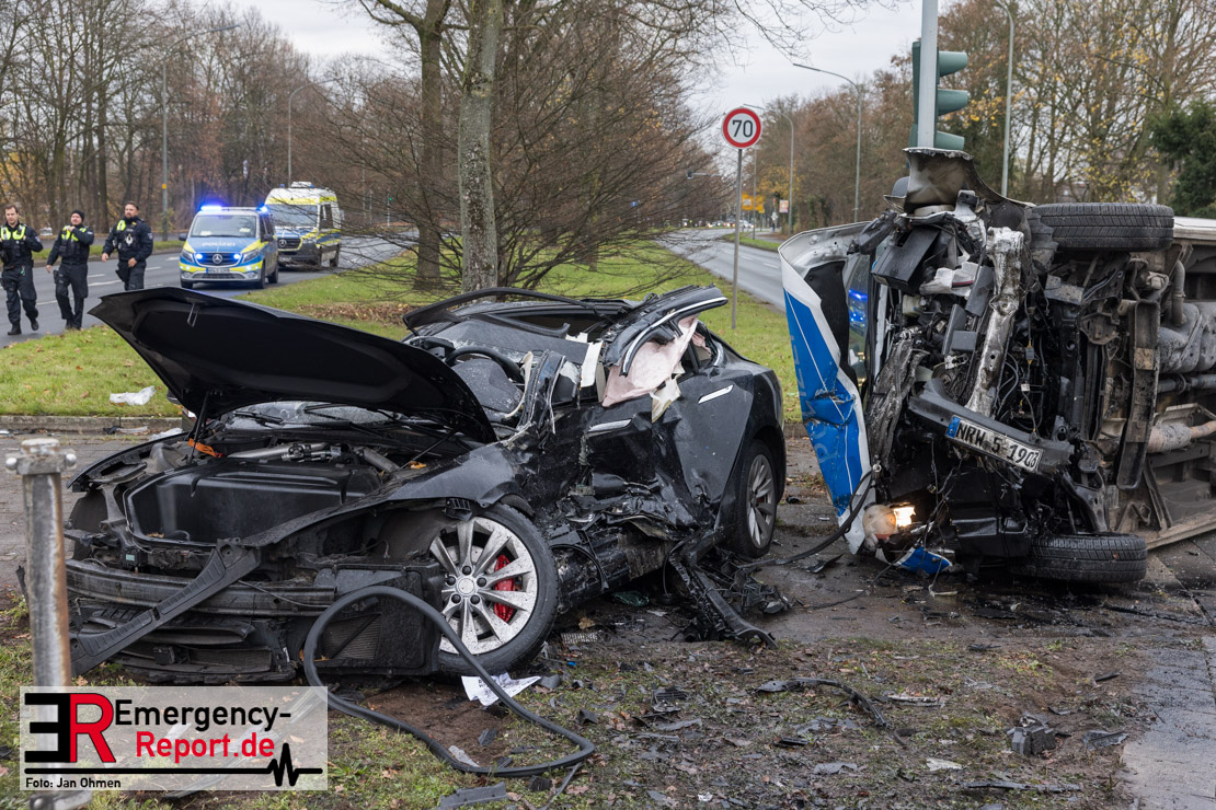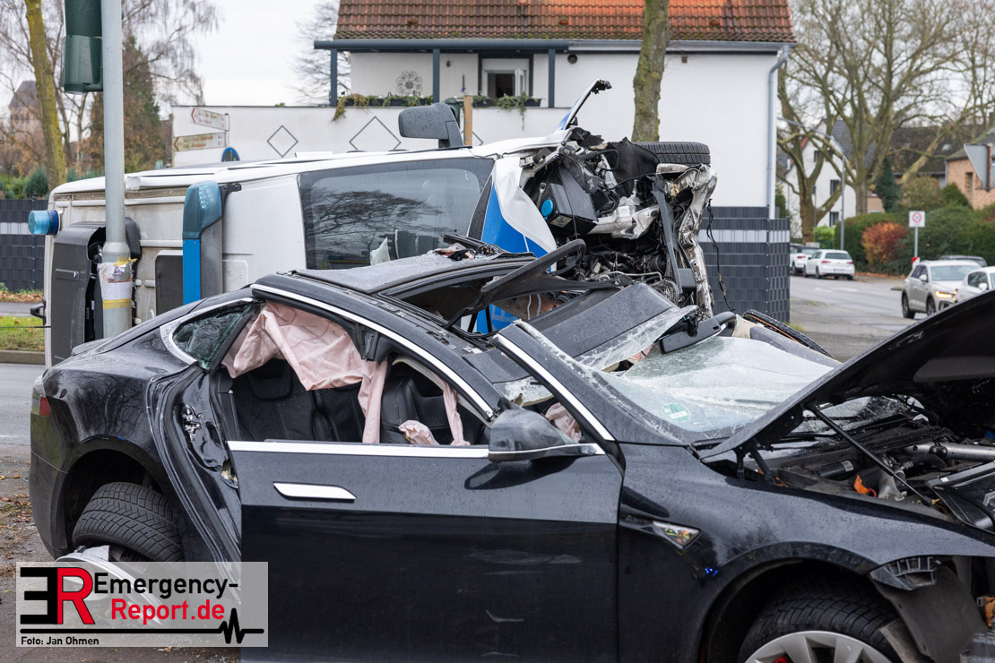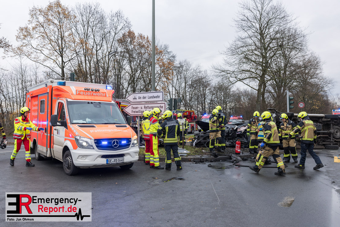 Erstmeldung: An der Kreuzung von Grothusstraße und „An der Landwehr“ sind am Mittwoch (3. Dezember 2025) in Gelsenkirchen ein Einsatzfahrzeug der Polizei und ein Pkw miteinander kollidiert. Gegen 10:15 Uhr hatte der Transporter mit drei Polizeibeamten die Kreuzung überquert und war beim Zusammenprall mit dem Pkw auf die Seite geschleudert worden. Nach aktuellem Stand wurden die drei Beamten verletzt, für den 52-jährigen Fahrer des Pkw besteht derzeit Lebensgefahr.