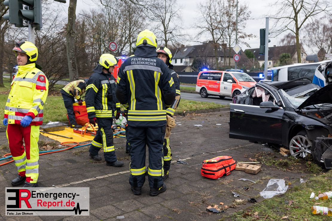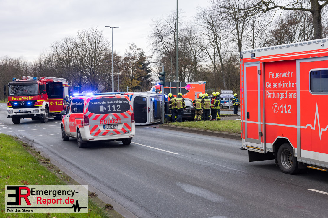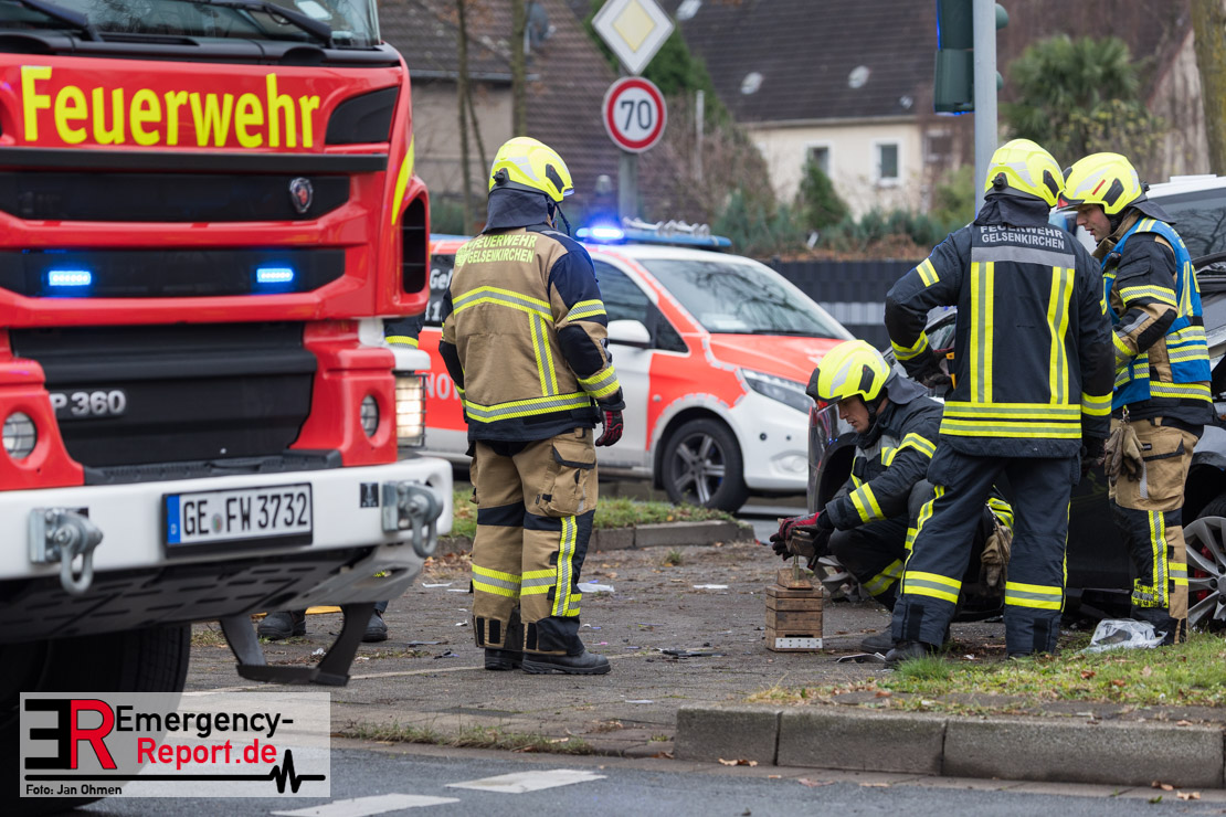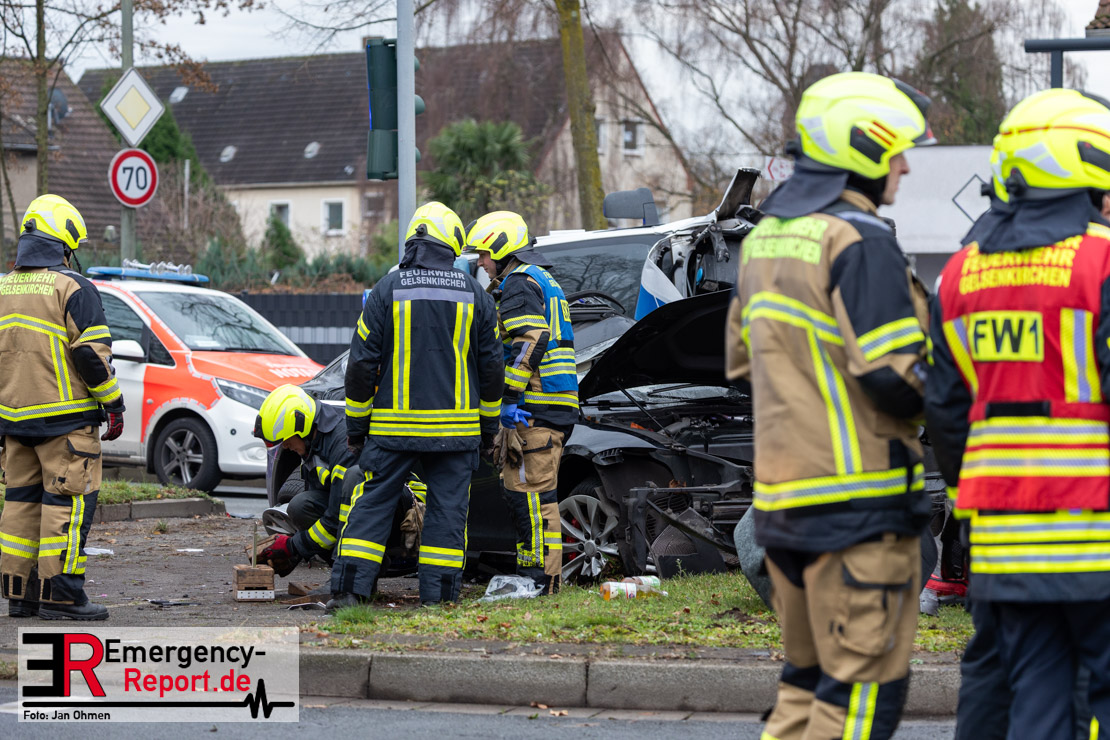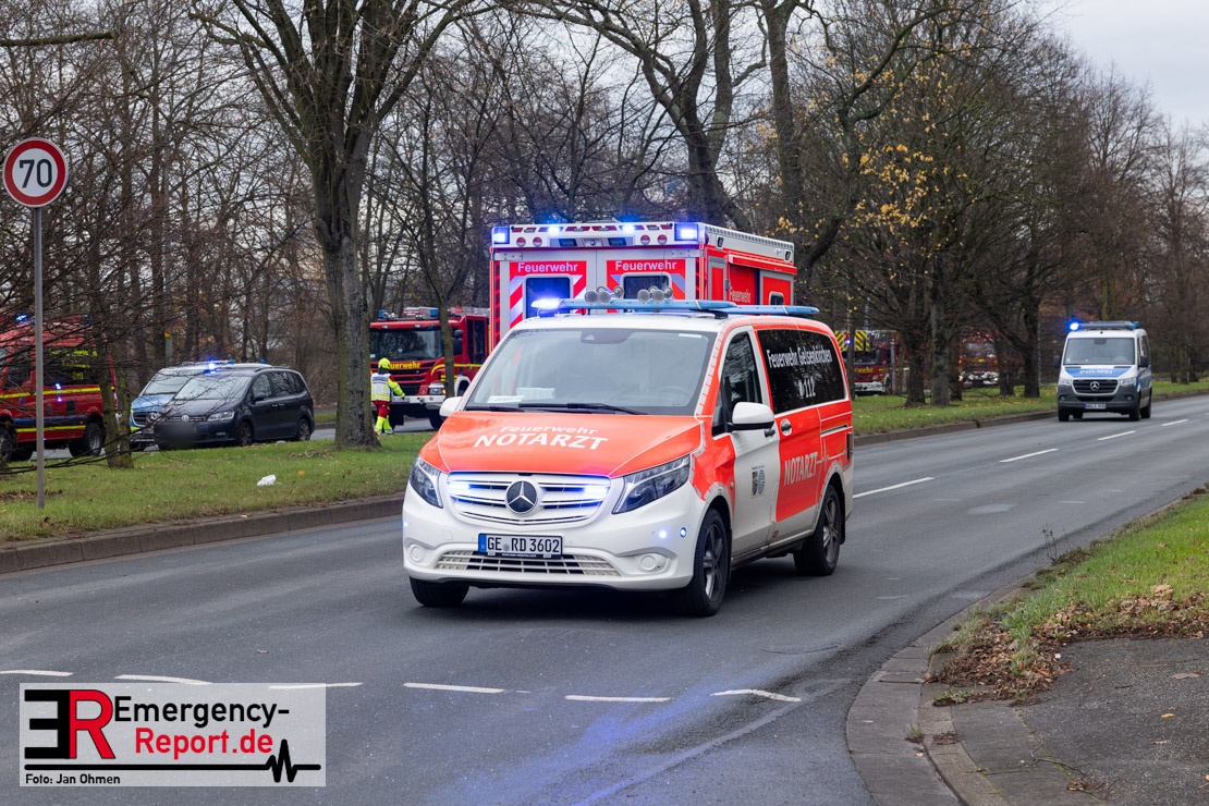 Gelsenkirchen (ots) – Am Mittwochmorgen, 03.12.2025, kam es im Kreuzungsbereich Grothusstraße/Verbindungsstraße zu einem Verkehrsunfall zwischen einem Pkw und einem Mannschaftstransportwagen der Polizei. Beim Eintreffen der Einsatzkräfte bestätigte sich die Meldung, dass mehrere Personen verletzt waren und eine davon in ihrem Fahrzeug eingeklemmt war. Insgesamt waren vier Personen verletzt.