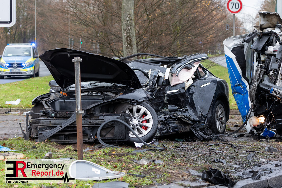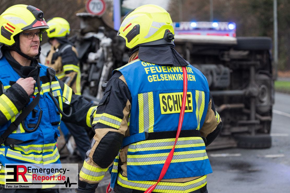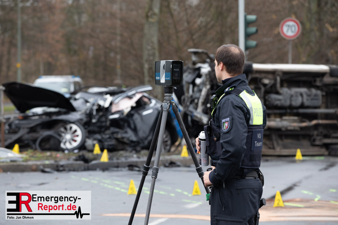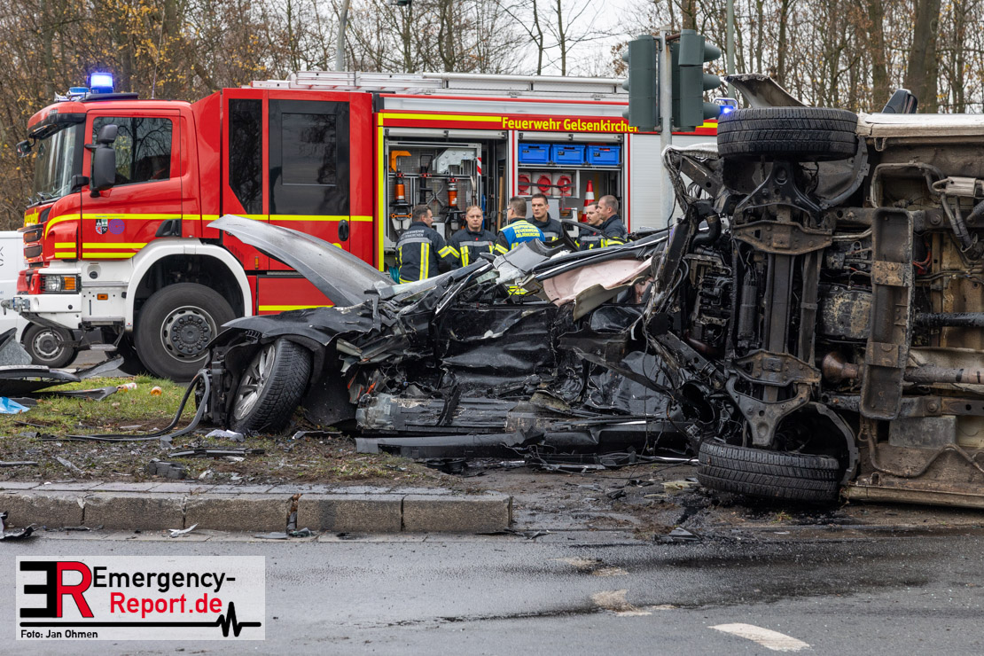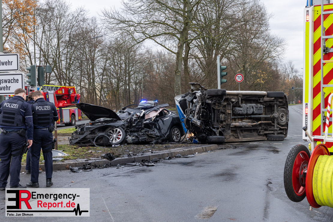 Erstmeldung: An der Kreuzung von Grothusstraße und „An der Landwehr“ sind am Mittwoch (3. Dezember 2025) in Gelsenkirchen ein Einsatzfahrzeug der Polizei und ein Pkw miteinander kollidiert. Gegen 10:15 Uhr hatte der Transporter mit drei Polizeibeamten die Kreuzung überquert und war beim Zusammenprall mit dem Pkw auf die Seite geschleudert worden. Nach aktuellem Stand wurden die drei Beamten verletzt, für den 52-jährigen Fahrer des Pkw besteht derzeit Lebensgefahr.