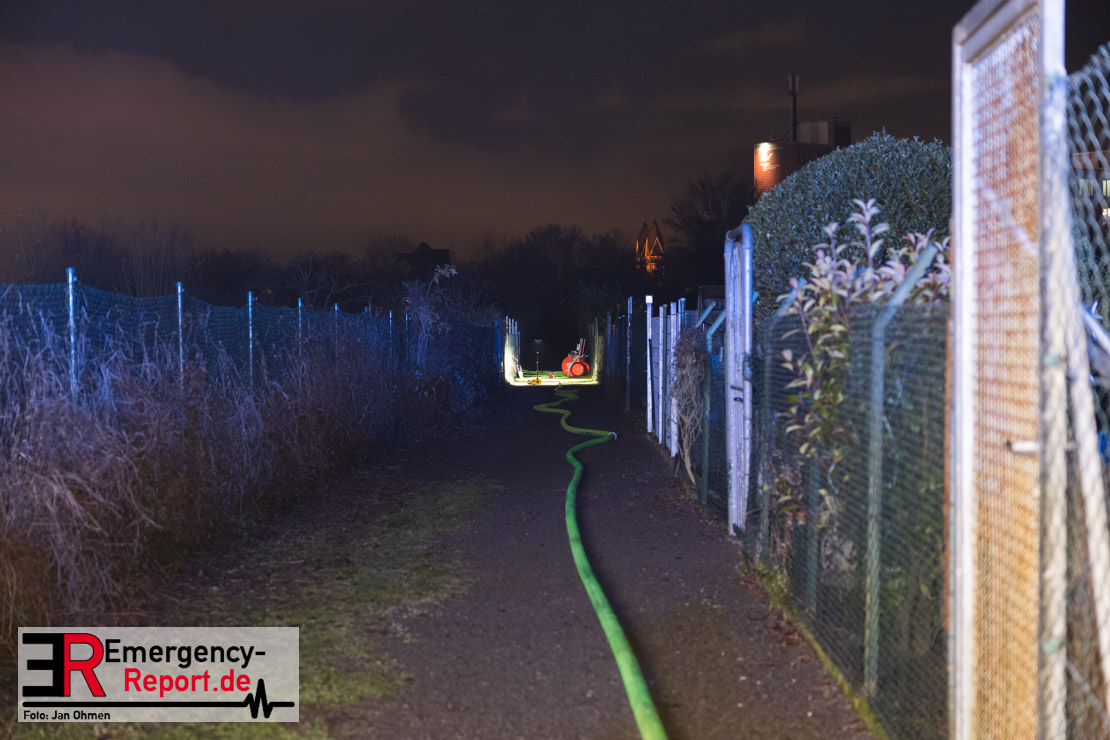 Die Feuerwehr Köln wurde am Freitagabend (04.12.2025) zu einer Feuermeldung in einer Kleingartenanlage auf den Dansweilerweg alarmiert. Bereits auf der Anfahrt bestätigte sich die Meldung durch deutlich sichtbaren Flammenschein sowie eine massive Rauchentwicklung. Beim Eintreffen der ersten Kräfte stand eine freistehende Gartenlaube im Vollbrand.