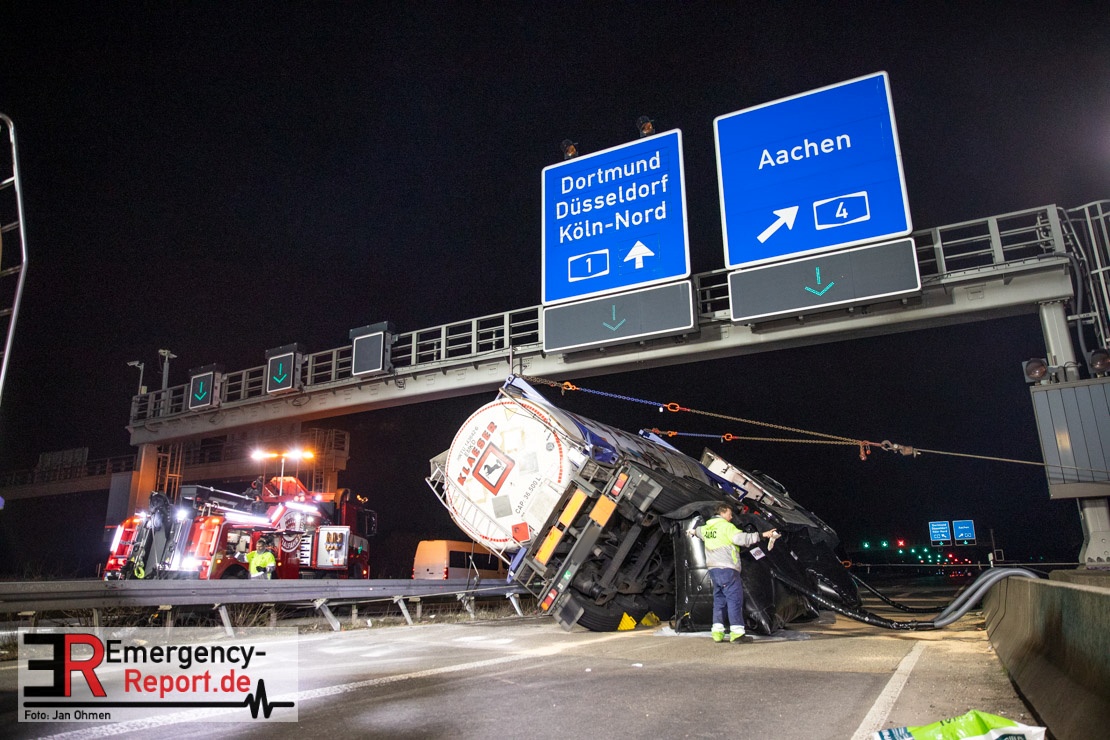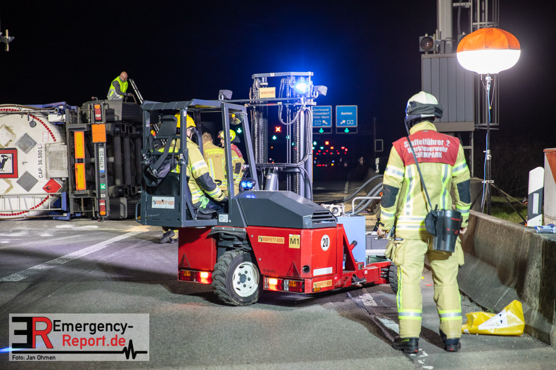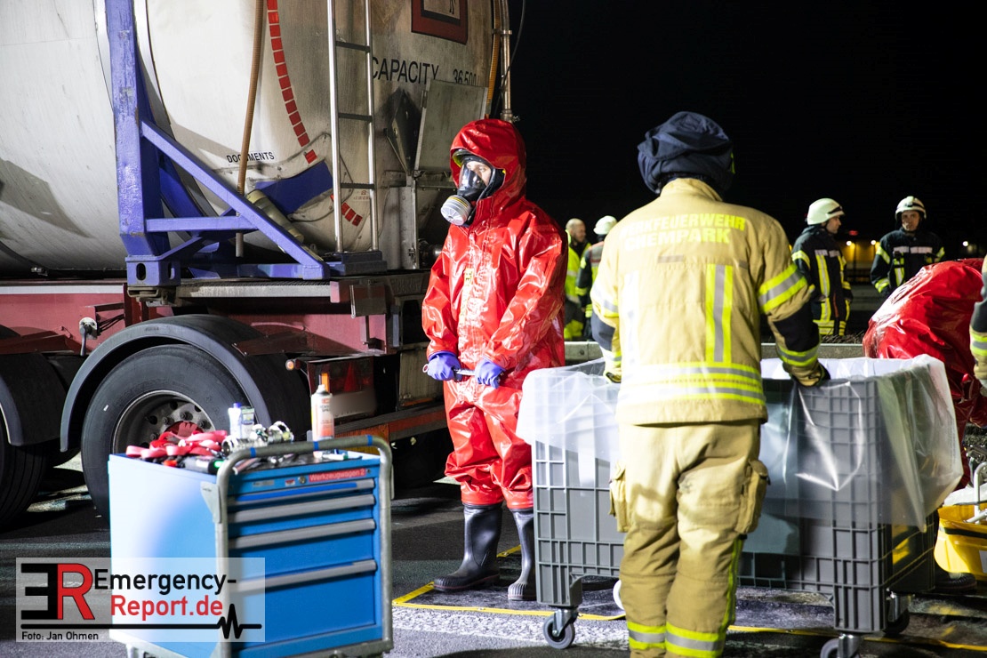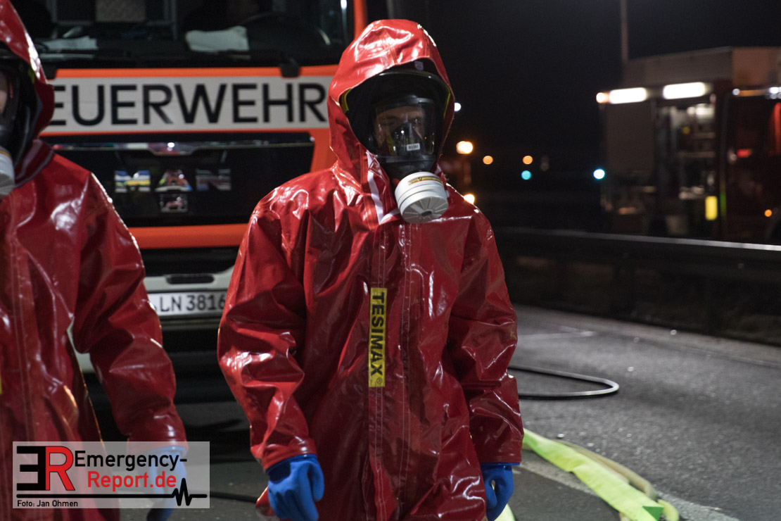 Die ersteintreffenden Einsatzkräfte fanden einen auf der Seite liegenden Sattelzug vor, der mit dem chemischen Lösungsmittel Butylacrylat beladen war. Hierbei handelt es sich um eine entzündbare und gesundheitsschädliche Flüssigkeit. Aufgrund dessen wurde das Einsatzstichwort auf „CHEMIE“ erhöht und so weitere Kräfte (unter anderem Spezialkräfte der Feuerwache 8 ) zur Einsatzstelle nachalarmiert.