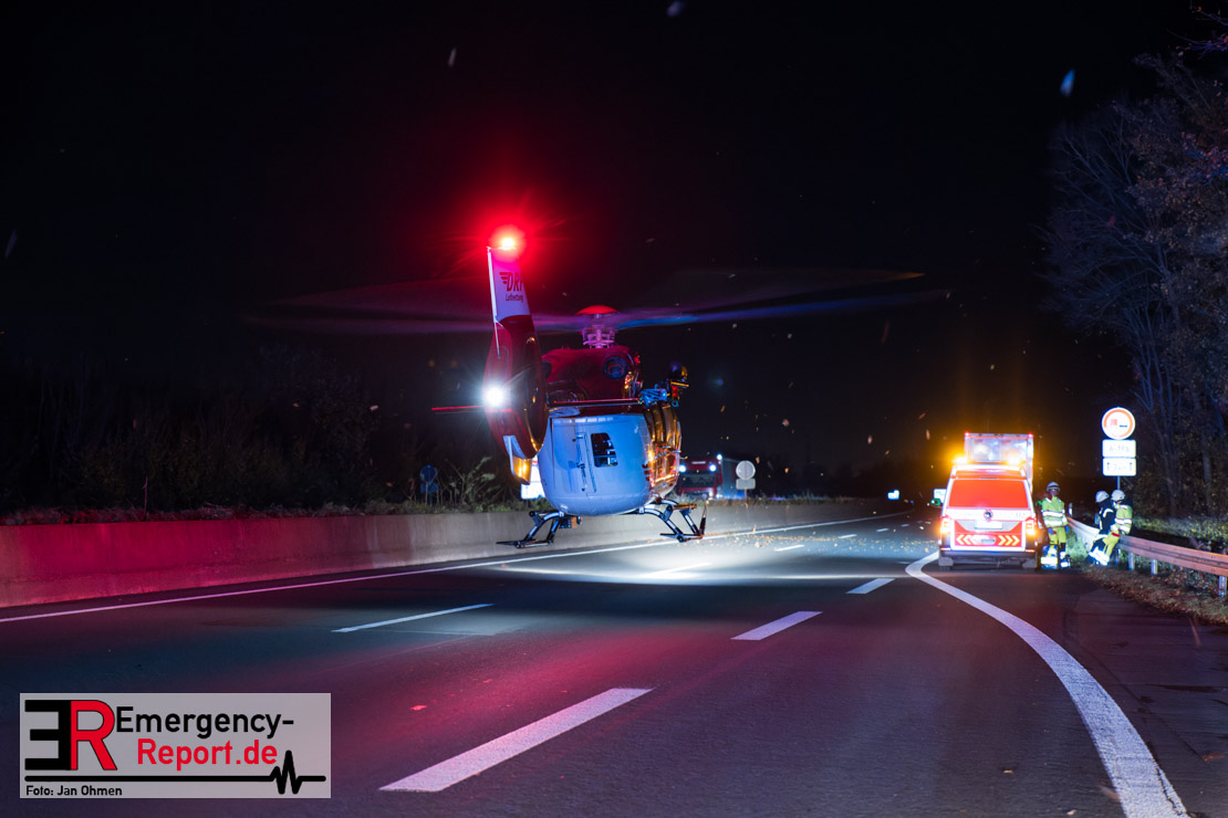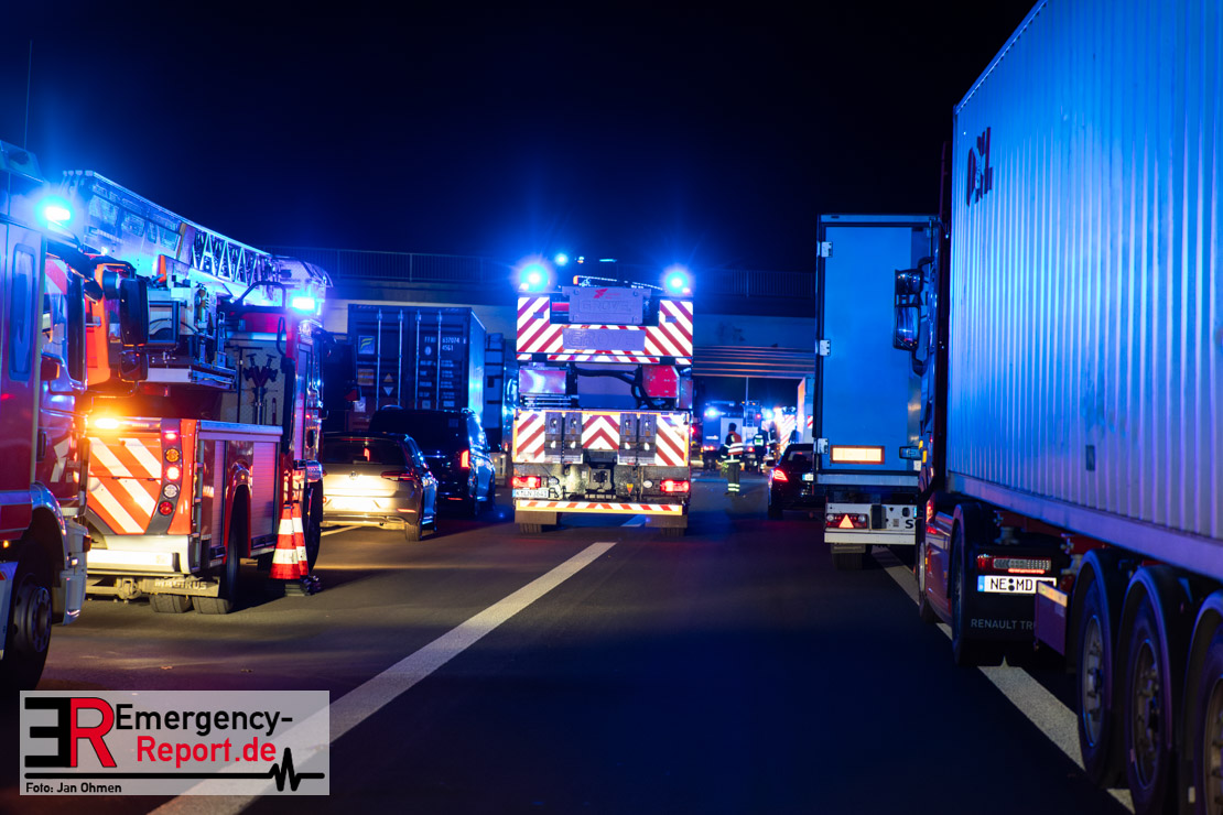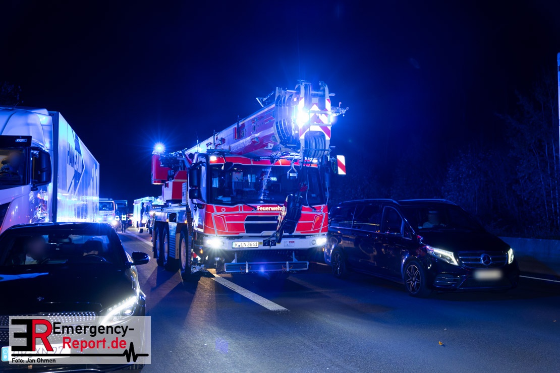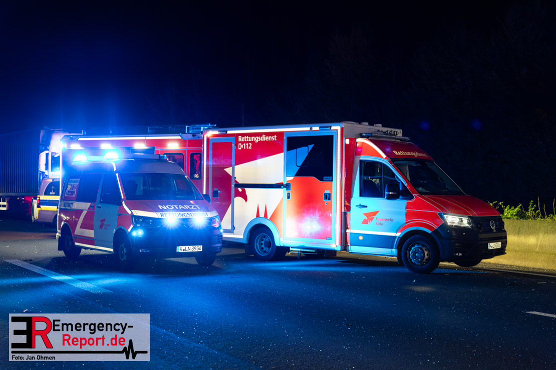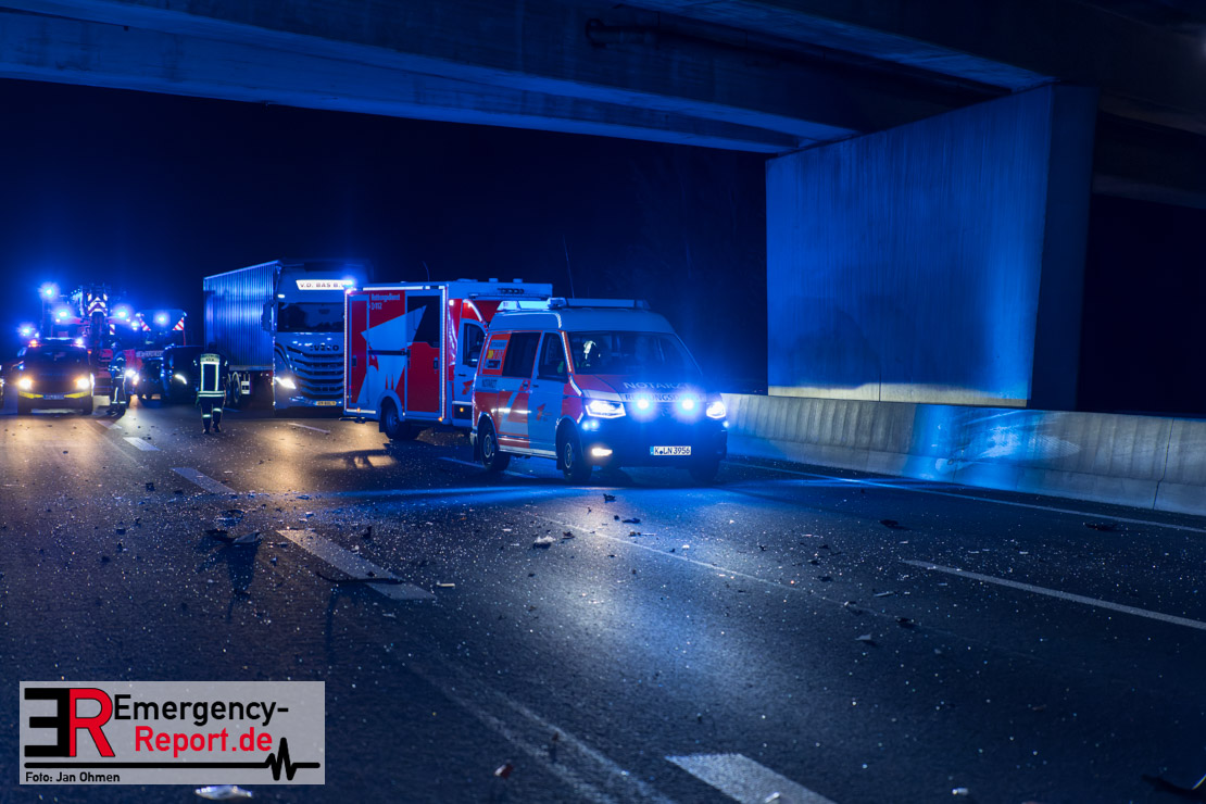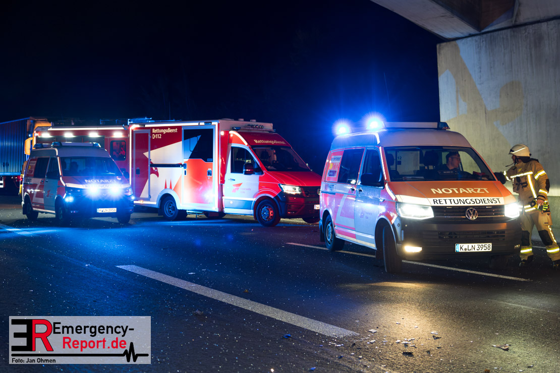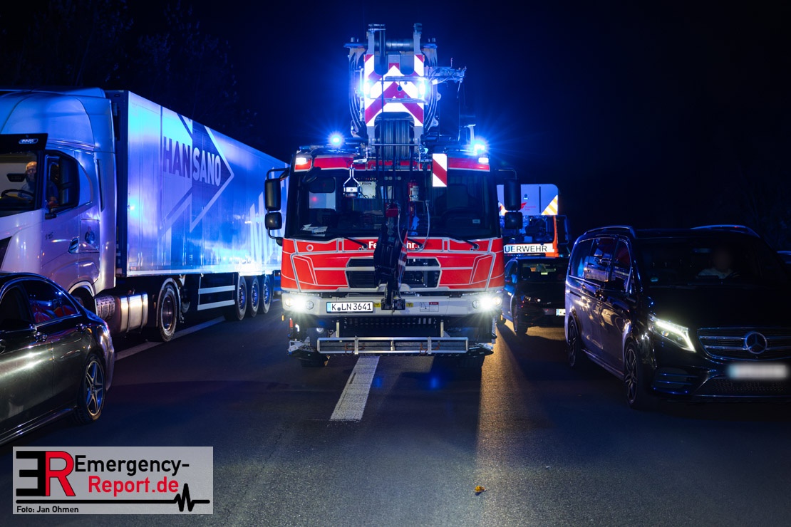 Gegen 20.15 Uhr (11.11.2025) gingen mehrere Notrufe in der Leitstelle zu einem Verkehrsunfall zwischen einem LKW und einem PKW auf der A57, Anschlussstelle Worringen, in Fahrtrichtung Köln ein. Einer davon schien direkt aus dem Unfallauto zu kommen, eine Kommunikation mit dem Anrufenden war seitens des Leitstellendisponenten aber nicht möglich. Die parallel einlaufenden Notrufe berichteten währenddessen von einer eingeklemmten Person in einem PKW. Als die Rettungskräfte am Einsatzort eintrafen, lag das Fahrzeug auf der Seite. Ersthelfer, zwei Mitarbeiter einer Hilfsorganisation, die mit einem Krankentransportwagen unterwegs waren, kümmerten sich bereits um den Verletzten, als die ersten Einsatzkräfte, Rettungsdienst und die Freiwillige Feuerwehr aus Worringen, den Unfallort erreichten. Sofort begannen die Rettungskräfte den schwerverletzten Fahrer zu versorgen und die Rettung einzuleiten. Dazu wurde das Fahrzeug zurück auf die Räder gestellt, das Dach geöffnet und der Patient schnellstmöglich aus dem Fahrzeug befreit. Zur medizinischen Unterstützung wurde ein Rettungshubschrauber angefordert. Alarmiert wurde der ITH aus Dortmund. Nach der Erstversorgung wurde der Schwerverletzte schließlich mit dem Rettungswagen ins Krankenhaus transportiert.