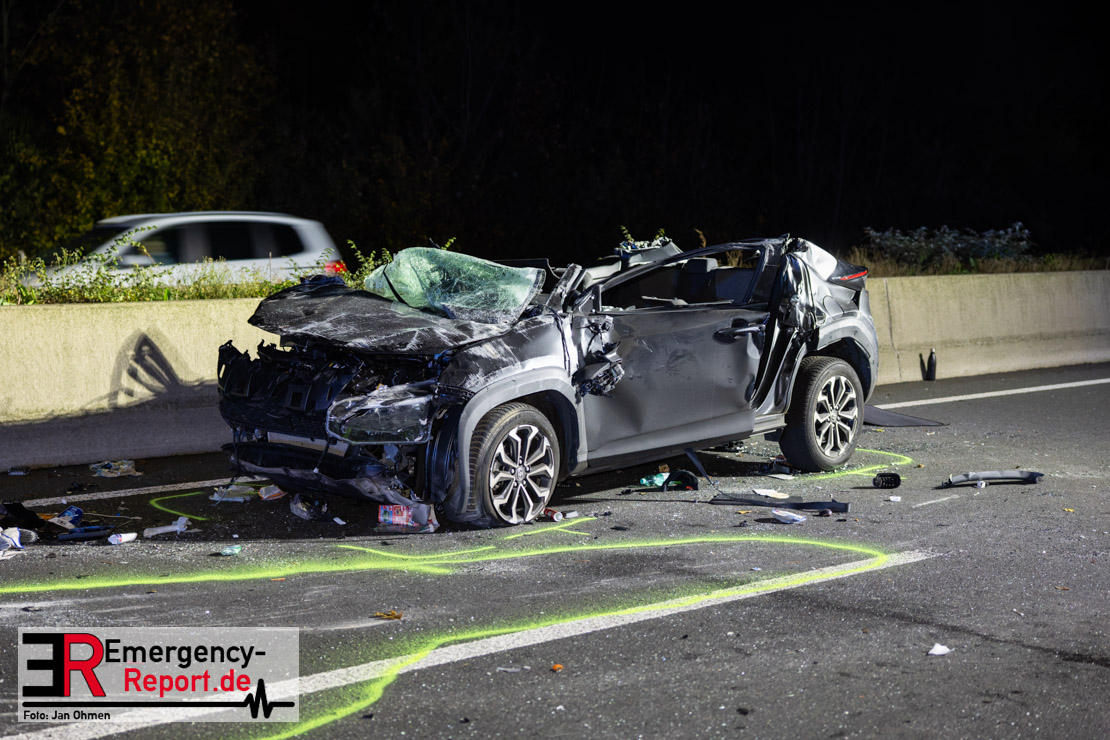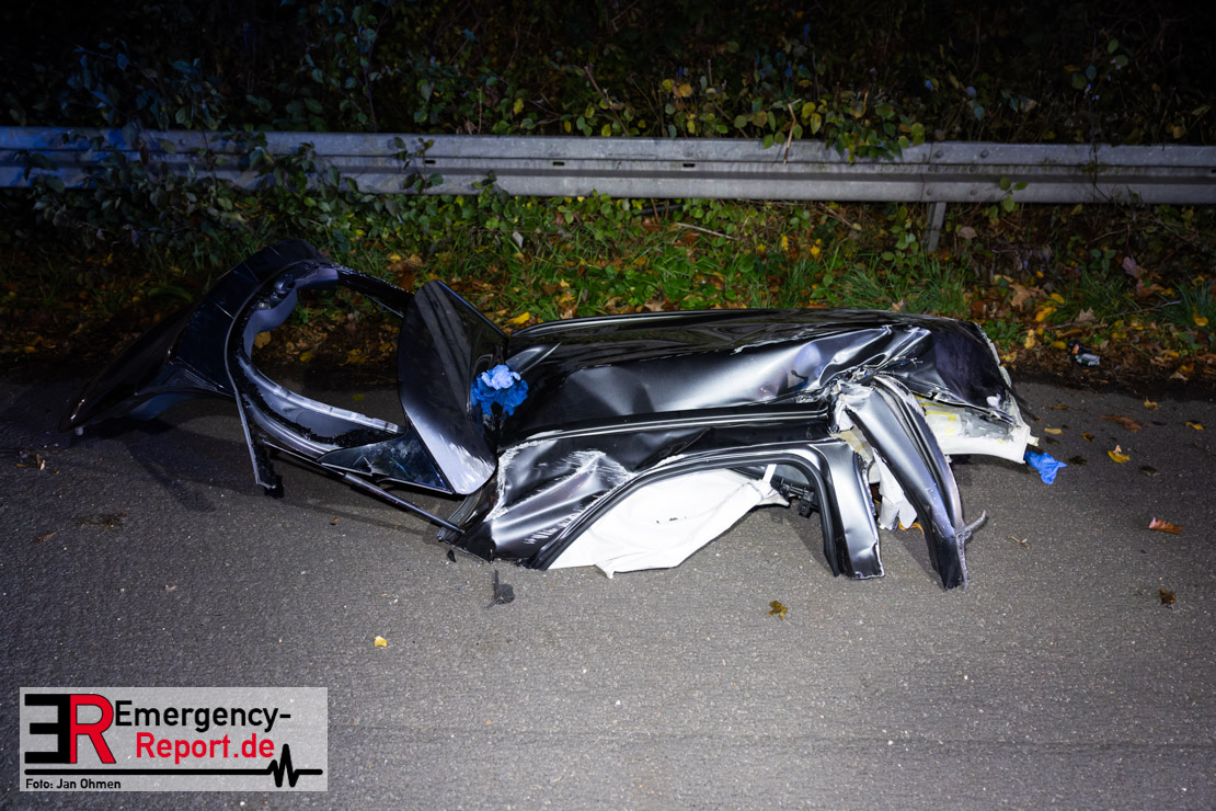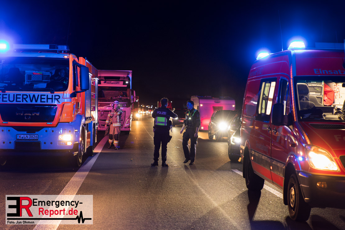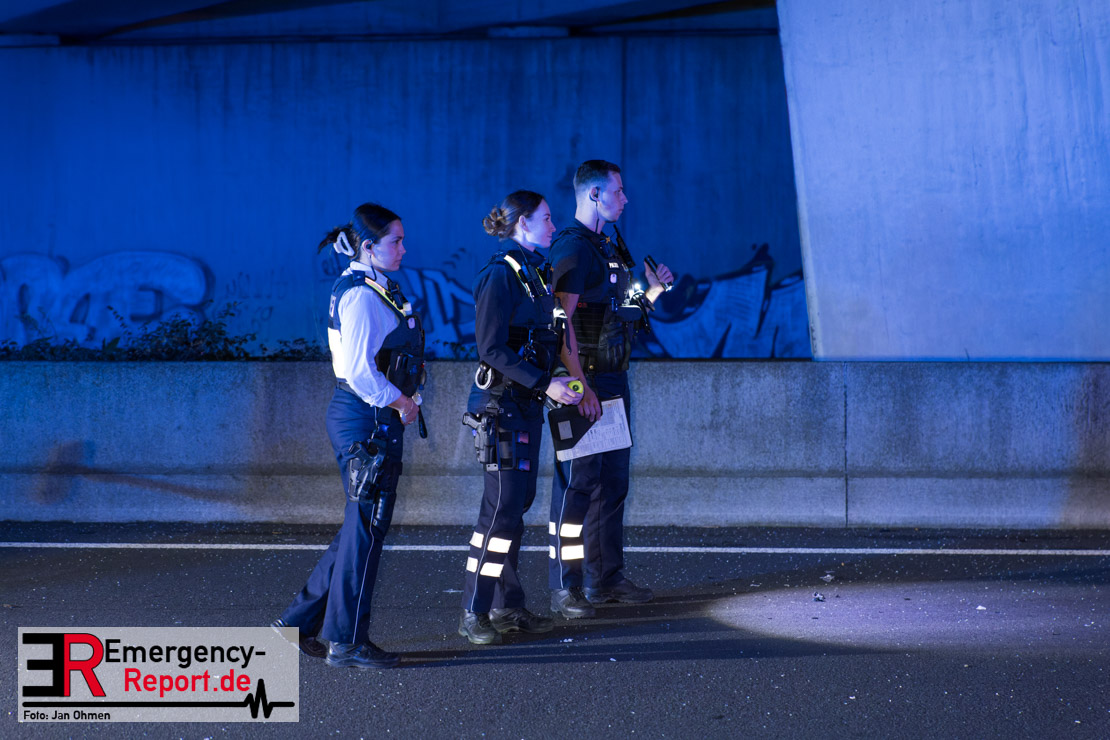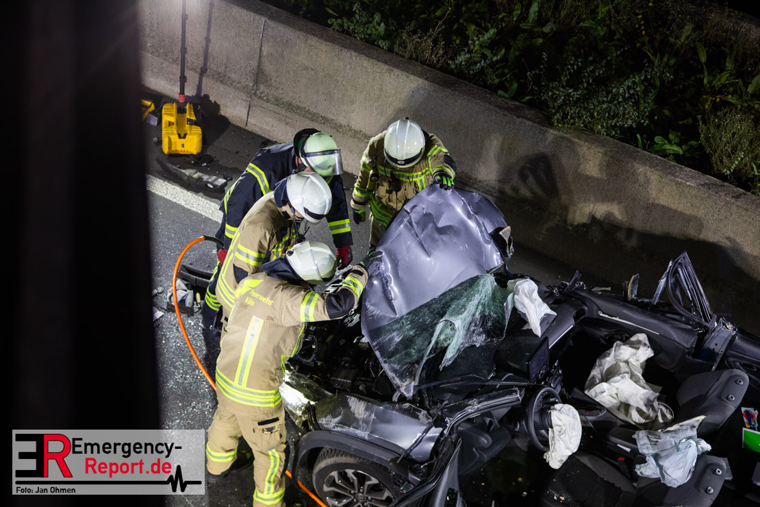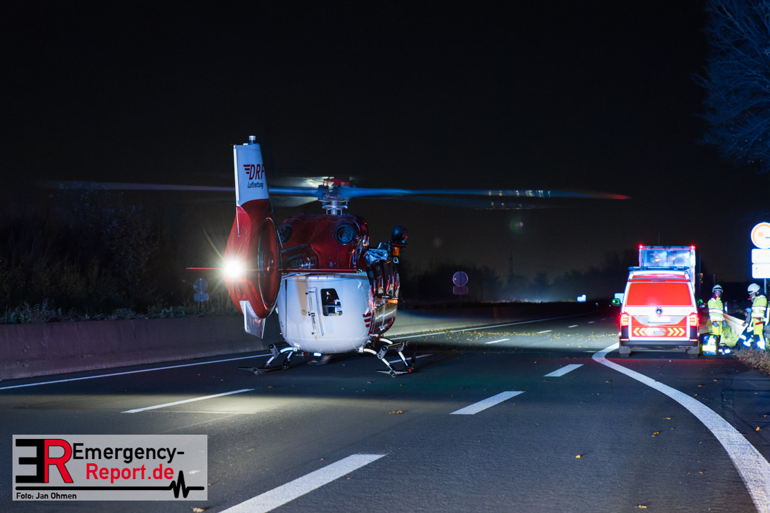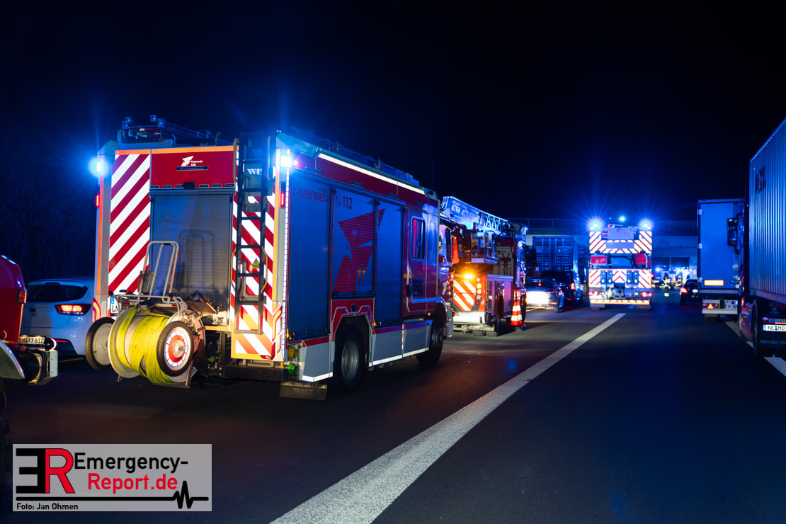 Gegen 20.15 Uhr (11.11.2025) gingen mehrere Notrufe in der Leitstelle zu einem Verkehrsunfall zwischen einem LKW und einem PKW auf der A57, Anschlussstelle Worringen, in Fahrtrichtung Köln ein. Einer davon schien direkt aus dem Unfallauto zu kommen, eine Kommunikation mit dem Anrufenden war seitens des Leitstellendisponenten aber nicht möglich. Die parallel einlaufenden Notrufe berichteten währenddessen von einer eingeklemmten Person in einem PKW. Als die Rettungskräfte am Einsatzort eintrafen, lag das Fahrzeug auf der Seite. Ersthelfer, zwei Mitarbeiter einer Hilfsorganisation, die mit einem Krankentransportwagen unterwegs waren, kümmerten sich bereits um den Verletzten, als die ersten Einsatzkräfte, Rettungsdienst und die Freiwillige Feuerwehr aus Worringen, den Unfallort erreichten. Sofort begannen die Rettungskräfte den schwerverletzten Fahrer zu versorgen und die Rettung einzuleiten. Dazu wurde das Fahrzeug zurück auf die Räder gestellt, das Dach geöffnet und der Patient schnellstmöglich aus dem Fahrzeug befreit. Zur medizinischen Unterstützung wurde ein Rettungshubschrauber angefordert. Alarmiert wurde der ITH aus Dortmund. Nach der Erstversorgung wurde der Schwerverletzte schließlich mit dem Rettungswagen ins Krankenhaus transportiert.