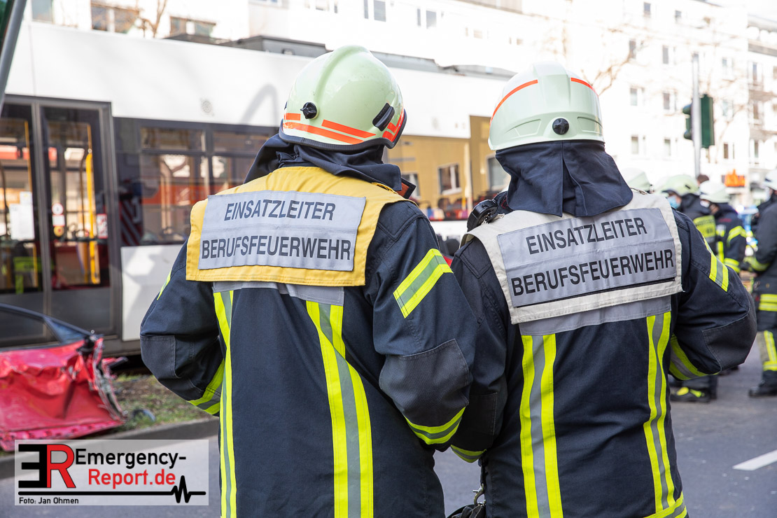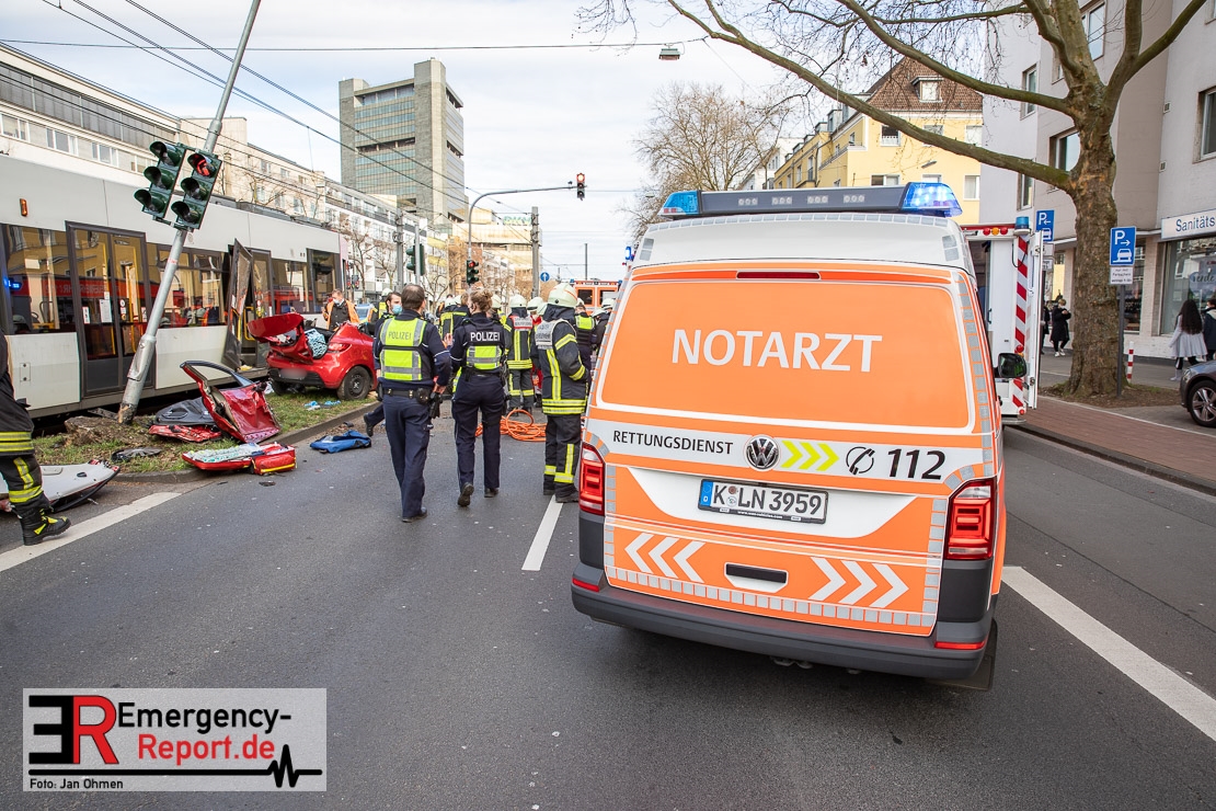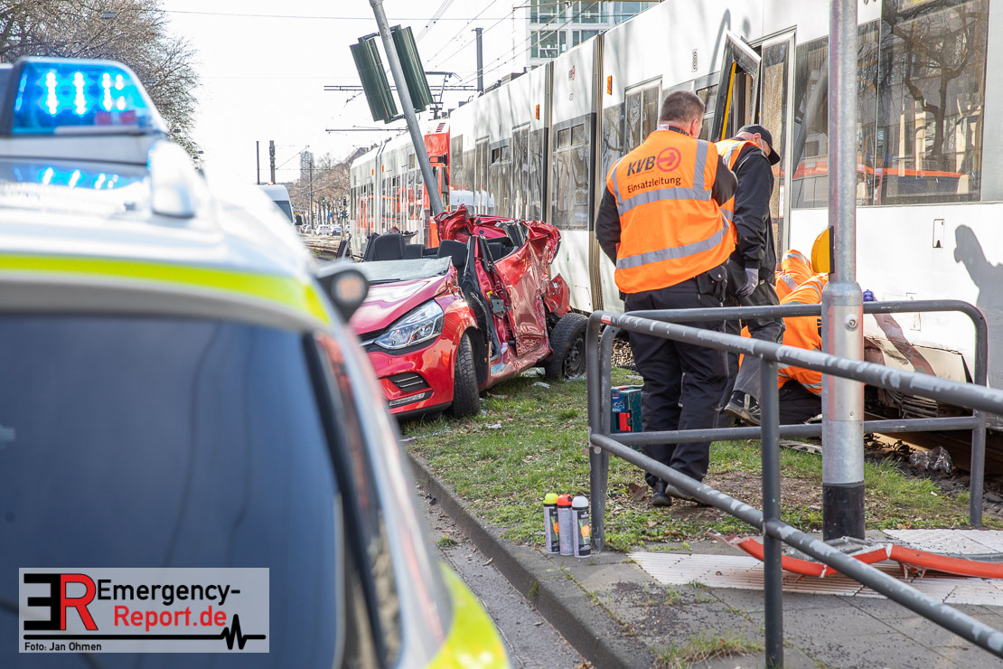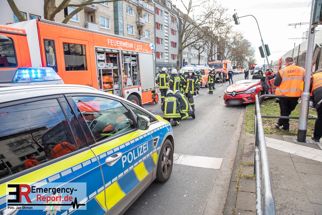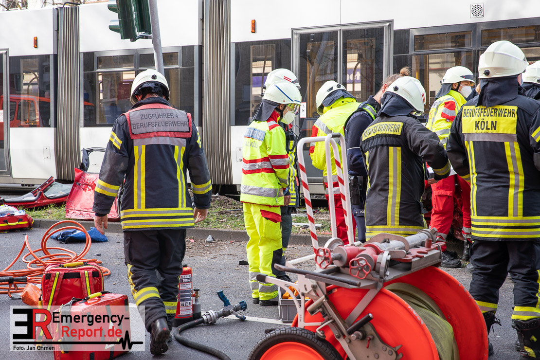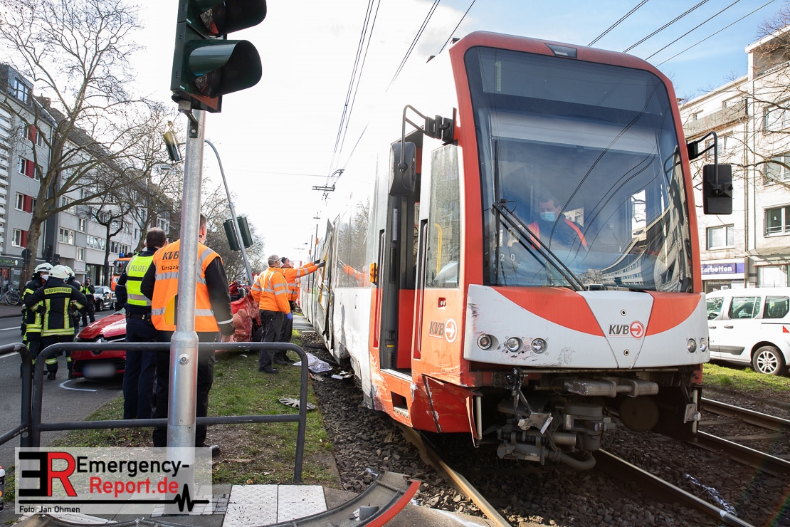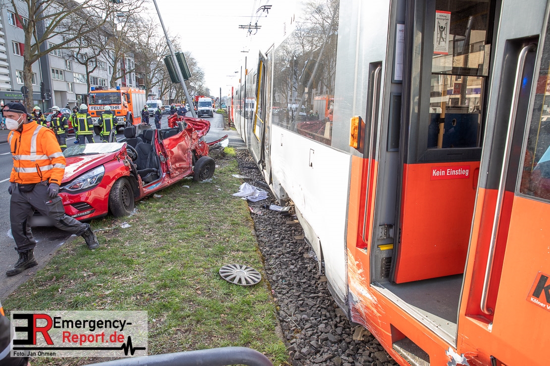 Die Feuerwehr Köln wurde am Nachmittag, gegen 15:10 Uhr zu einem Verkehrsunfall mit eingeklemmter Person auf die Aachener Straße in den Stadtteil Braunsfeld alarmiert. In Höhe der Hausnummer 457 kam es zu einem Zusammenstoß zwischen einem, mit zwei Insassen besetzten PKW und einer Straßenbahn der KVB. In der Straßenbahn befanden sich außer dem Fahrer, der sich leicht verletzte, keine weiteren Personen mehr. Der PKW wurde bei dem Unfall so stark deformiert, dass zwei Personen durch die Feuerwehr, mit schwerem hydraulischem Gerät gerettet, werden mussten. Beide Insassinnen des PKWs wurden unter notärztlicher Versorgung und umliegende Krankenhäuser transportiert. Auch der Fahrer der Straßenbahn wurde in ein Krankenhaus transportiert. Die Polizei hat den Unfall aufgenommen und Ermittelt nun den genauen Unfallhergang. Nach ersten Erkenntnissen fuhr der PKW, über eine rot zeigende Lichtzeichenanlage.
