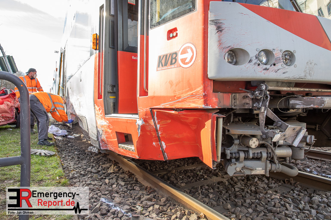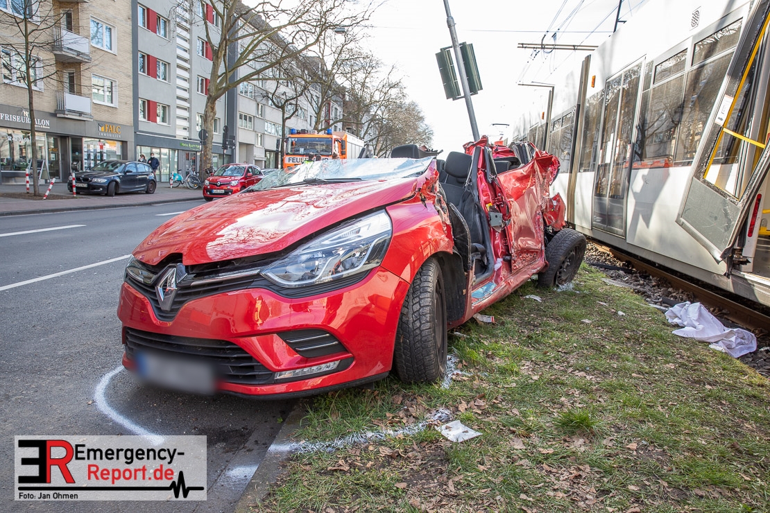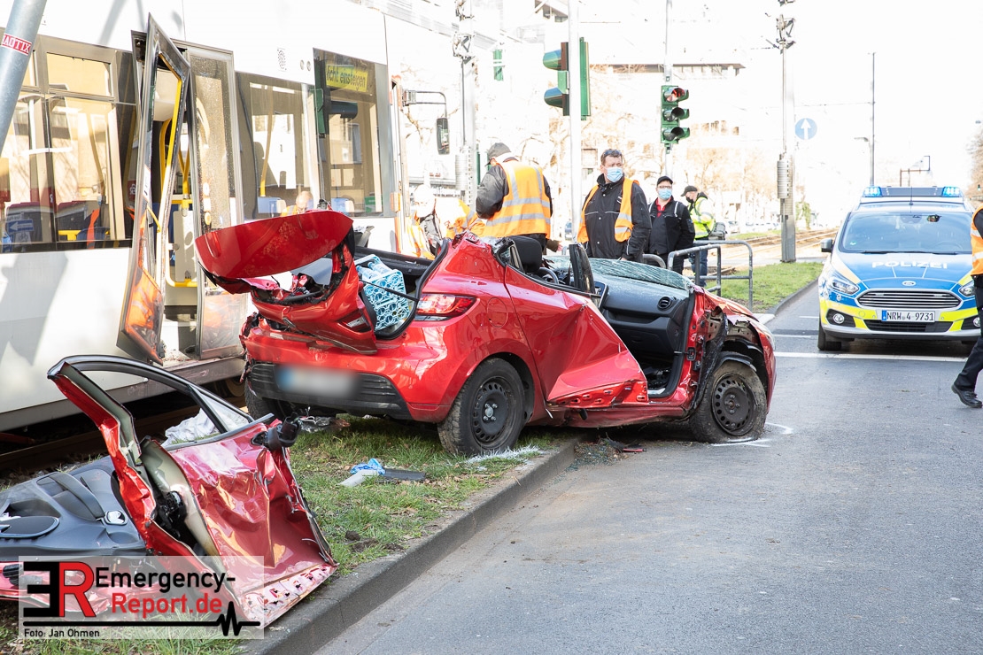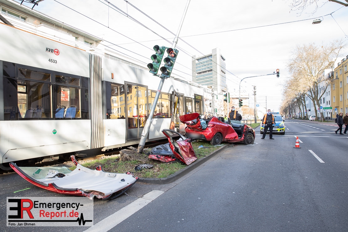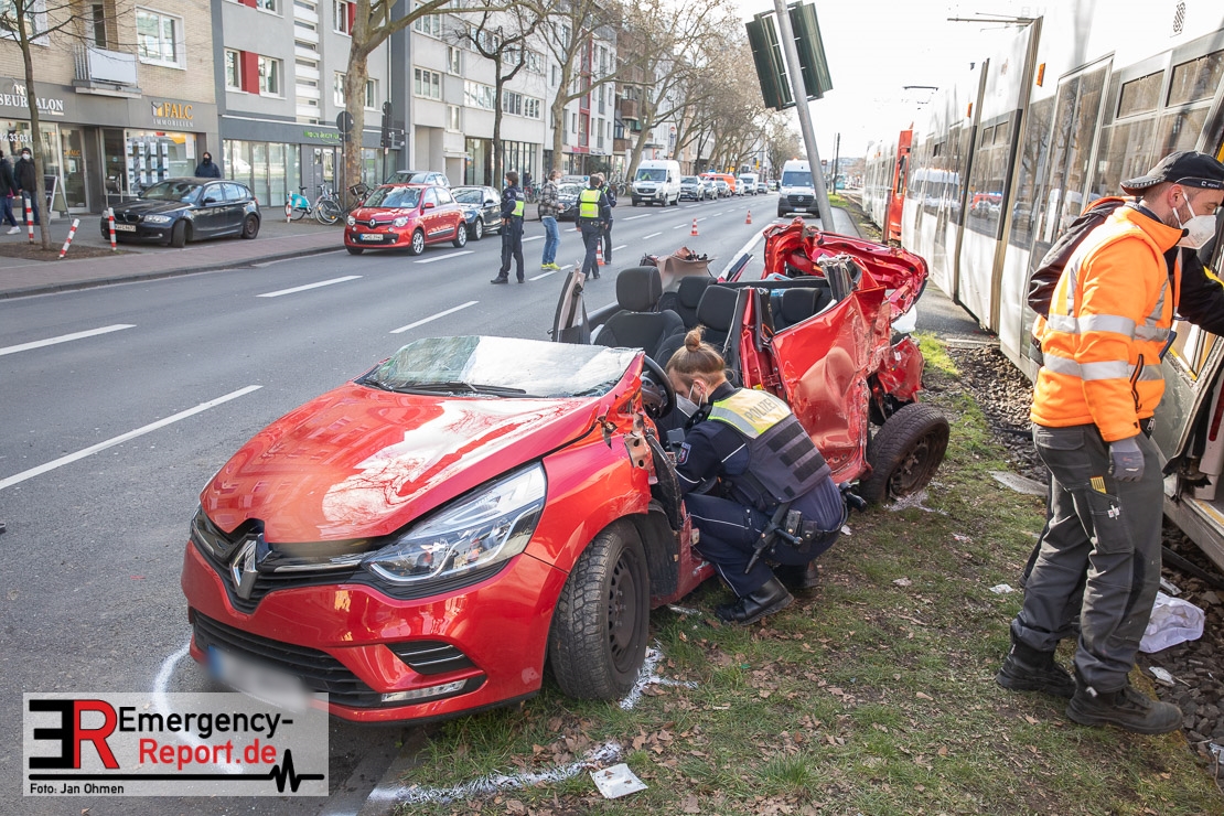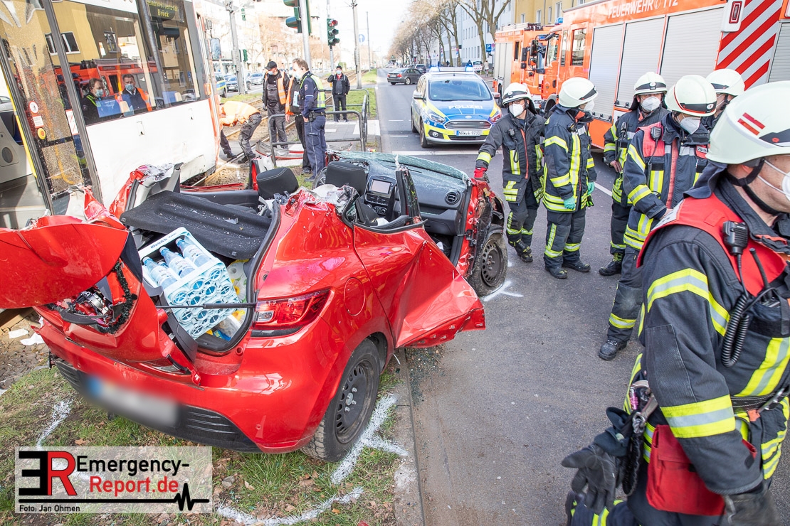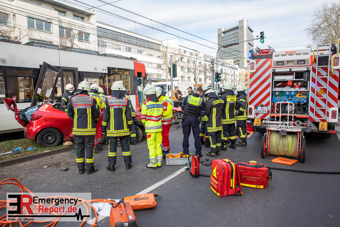 Die Feuerwehr Köln wurde am Nachmittag, gegen 15:10 Uhr zu einem Verkehrsunfall mit eingeklemmter Person auf die Aachener Straße in den Stadtteil Braunsfeld alarmiert. In Höhe der Hausnummer 457 kam es zu einem Zusammenstoß zwischen einem, mit zwei Insassen besetzten PKW und einer Straßenbahn der KVB. In der Straßenbahn befanden sich außer dem Fahrer, der sich leicht verletzte, keine weiteren Personen mehr. Der PKW wurde bei dem Unfall so stark deformiert, dass zwei Personen durch die Feuerwehr, mit schwerem hydraulischem Gerät gerettet, werden mussten. Beide Insassinnen des PKWs wurden unter notärztlicher Versorgung und umliegende Krankenhäuser transportiert. Auch der Fahrer der Straßenbahn wurde in ein Krankenhaus transportiert. Die Polizei hat den Unfall aufgenommen und Ermittelt nun den genauen Unfallhergang. Nach ersten Erkenntnissen fuhr der PKW, über eine rot zeigende Lichtzeichenanlage.