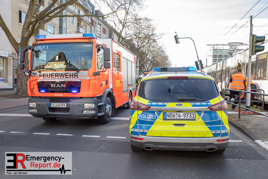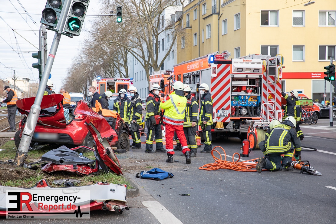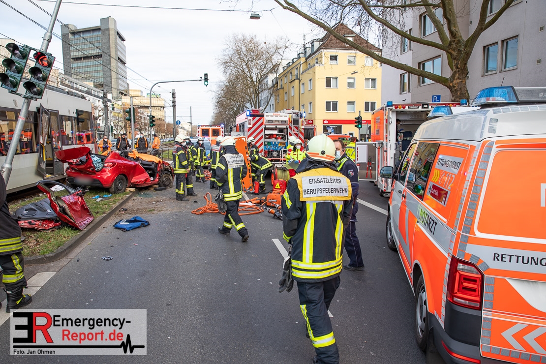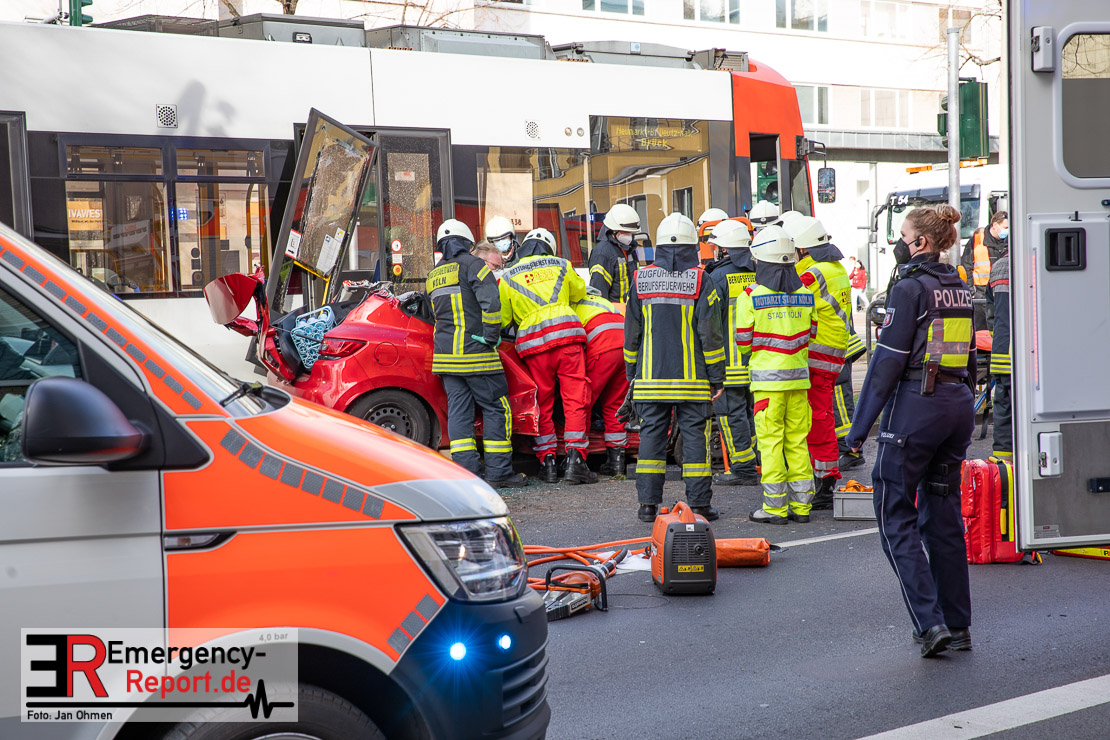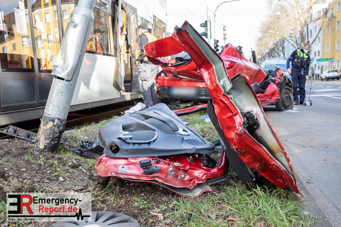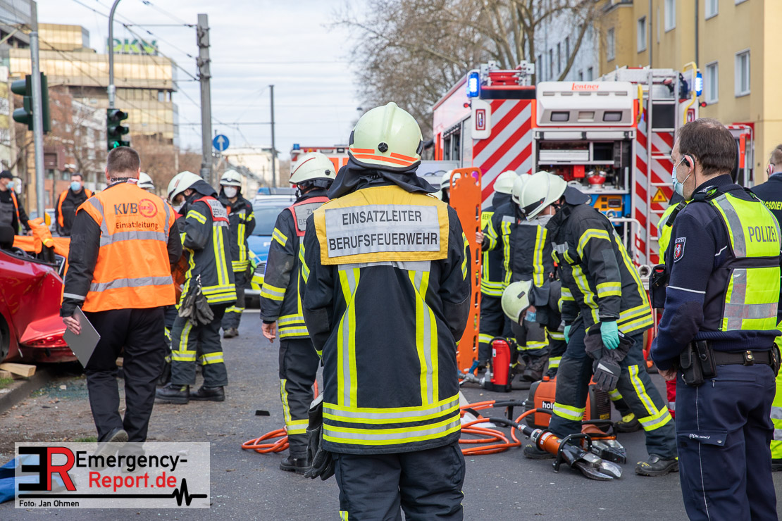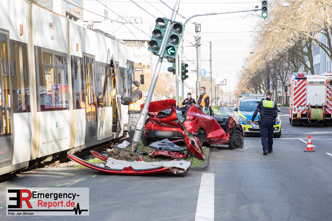Die Feuerwehr Köln wurde am Nachmittag, gegen 15:10 Uhr zu einem Verkehrsunfall mit eingeklemmter Person auf die Aachener Straße in den Stadtteil Braunsfeld alarmiert. In Höhe der Hausnummer 457 kam es zu einem Zusammenstoß zwischen einem, mit zwei Insassen besetzten PKW und einer Straßenbahn der KVB. In der Straßenbahn befanden sich außer dem Fahrer, der sich leicht verletzte, keine weiteren Personen mehr. Der PKW wurde bei dem Unfall so stark deformiert, dass zwei Personen durch die Feuerwehr, mit schwerem hydraulischem Gerät gerettet, werden mussten. Beide Insassinnen des PKWs wurden unter notärztlicher Versorgung und umliegende Krankenhäuser transportiert. Auch der Fahrer der Straßenbahn wurde in ein Krankenhaus transportiert. Die Polizei hat den Unfall aufgenommen und Ermittelt nun den genauen Unfallhergang. Nach ersten Erkenntnissen fuhr der PKW, über eine rot zeigende Lichtzeichenanlage.