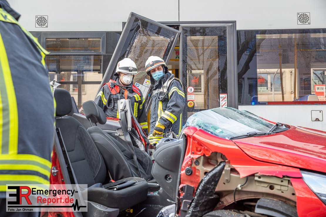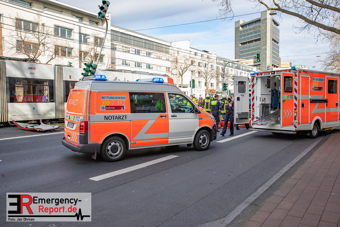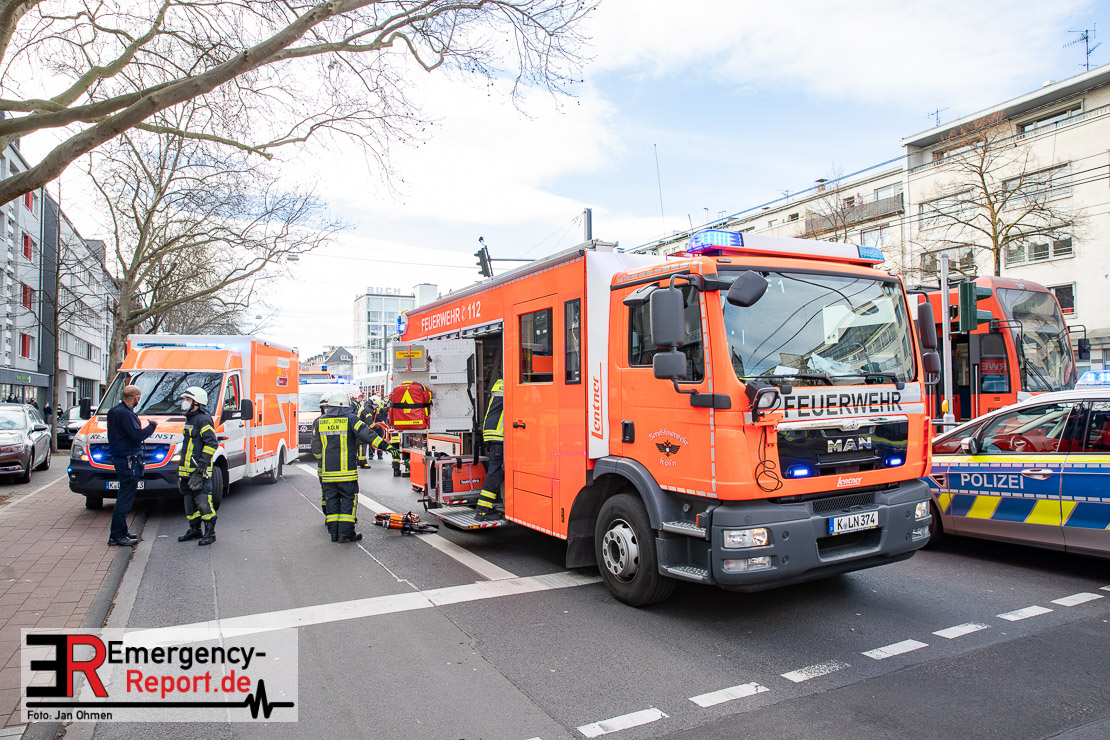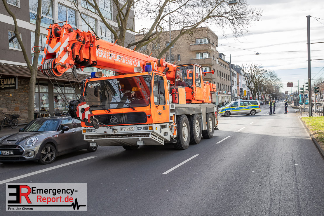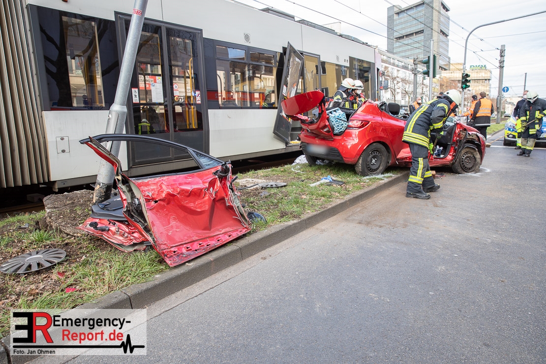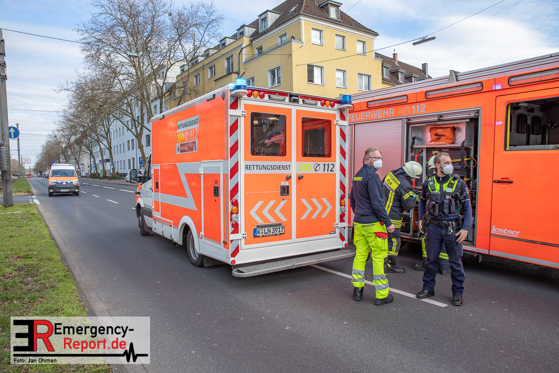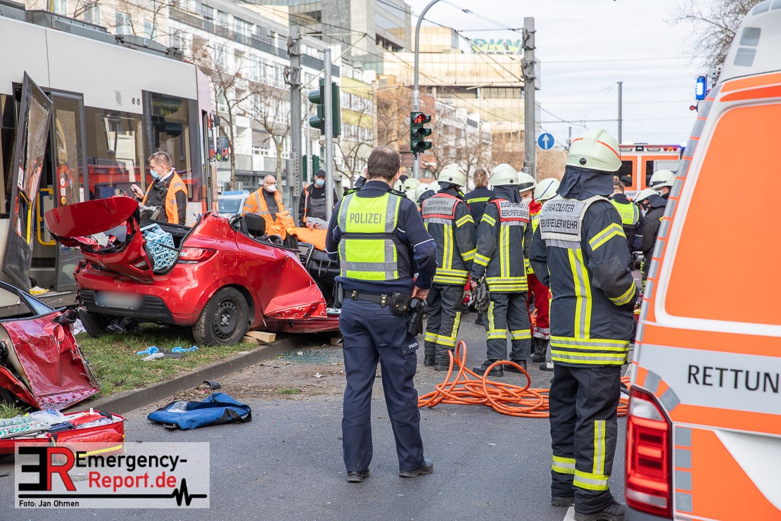 Die Feuerwehr Köln wurde am Nachmittag, gegen 15:10 Uhr zu einem Verkehrsunfall mit eingeklemmter Person auf die Aachener Straße in den Stadtteil Braunsfeld alarmiert. In Höhe der Hausnummer 457 kam es zu einem Zusammenstoß zwischen einem, mit zwei Insassen besetzten PKW und einer Straßenbahn der KVB. In der Straßenbahn befanden sich außer dem Fahrer, der sich leicht verletzte, keine weiteren Personen mehr. Der PKW wurde bei dem Unfall so stark deformiert, dass zwei Personen durch die Feuerwehr, mit schwerem hydraulischem Gerät gerettet, werden mussten. Beide Insassinnen des PKWs wurden unter notärztlicher Versorgung und umliegende Krankenhäuser transportiert. Auch der Fahrer der Straßenbahn wurde in ein Krankenhaus transportiert. Die Polizei hat den Unfall aufgenommen und Ermittelt nun den genauen Unfallhergang. Nach ersten Erkenntnissen fuhr der PKW, über eine rot zeigende Lichtzeichenanlage.