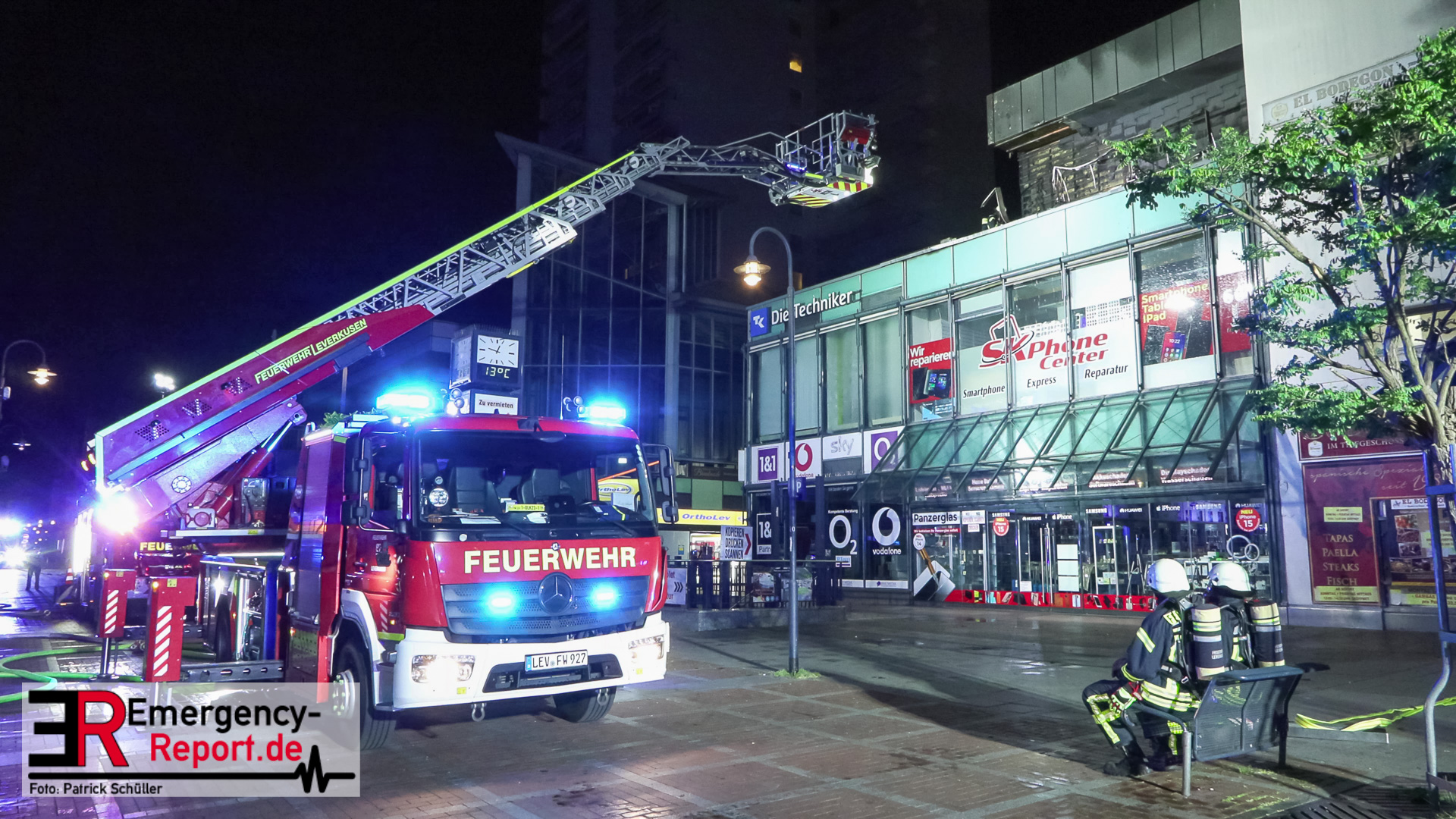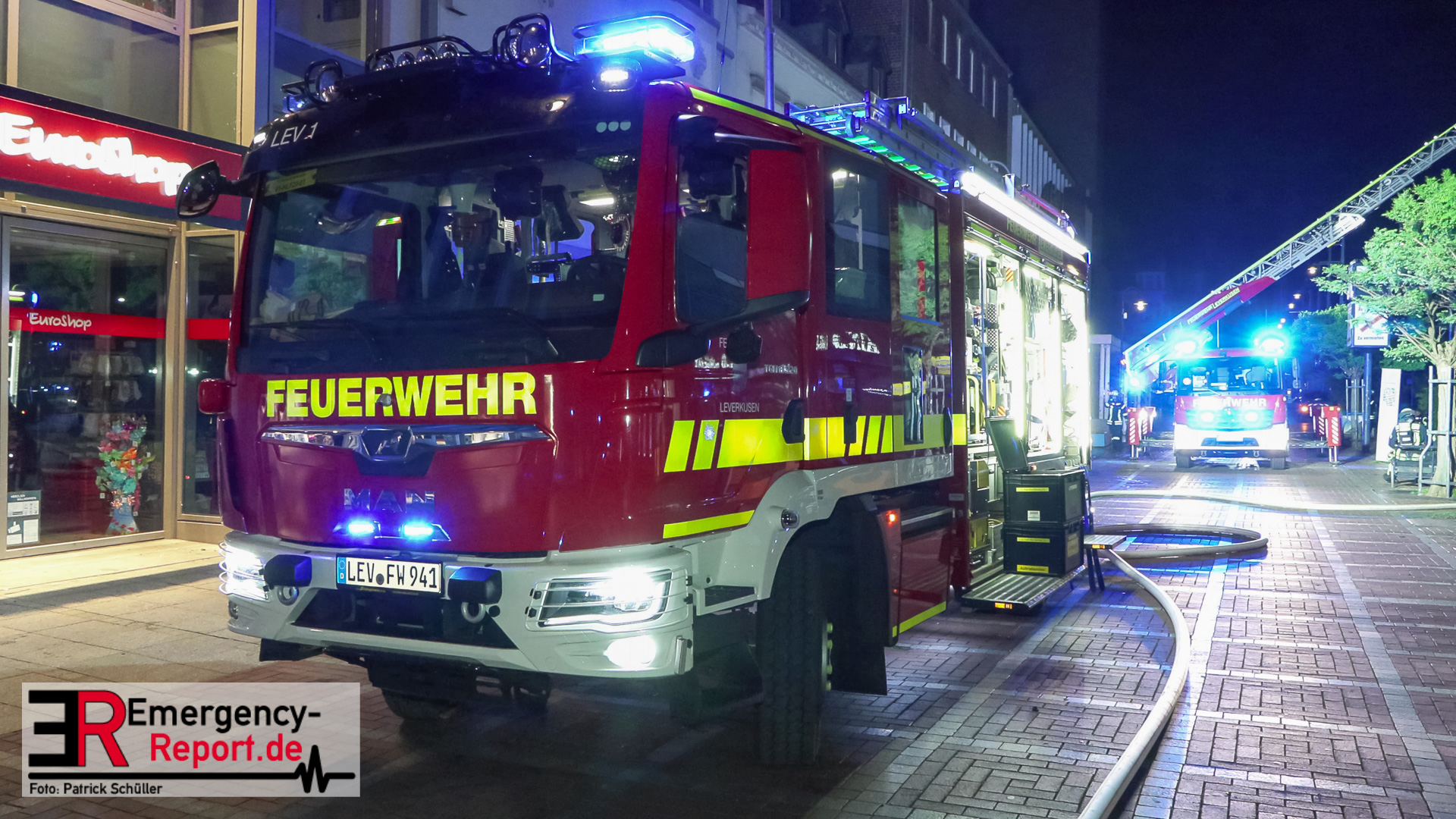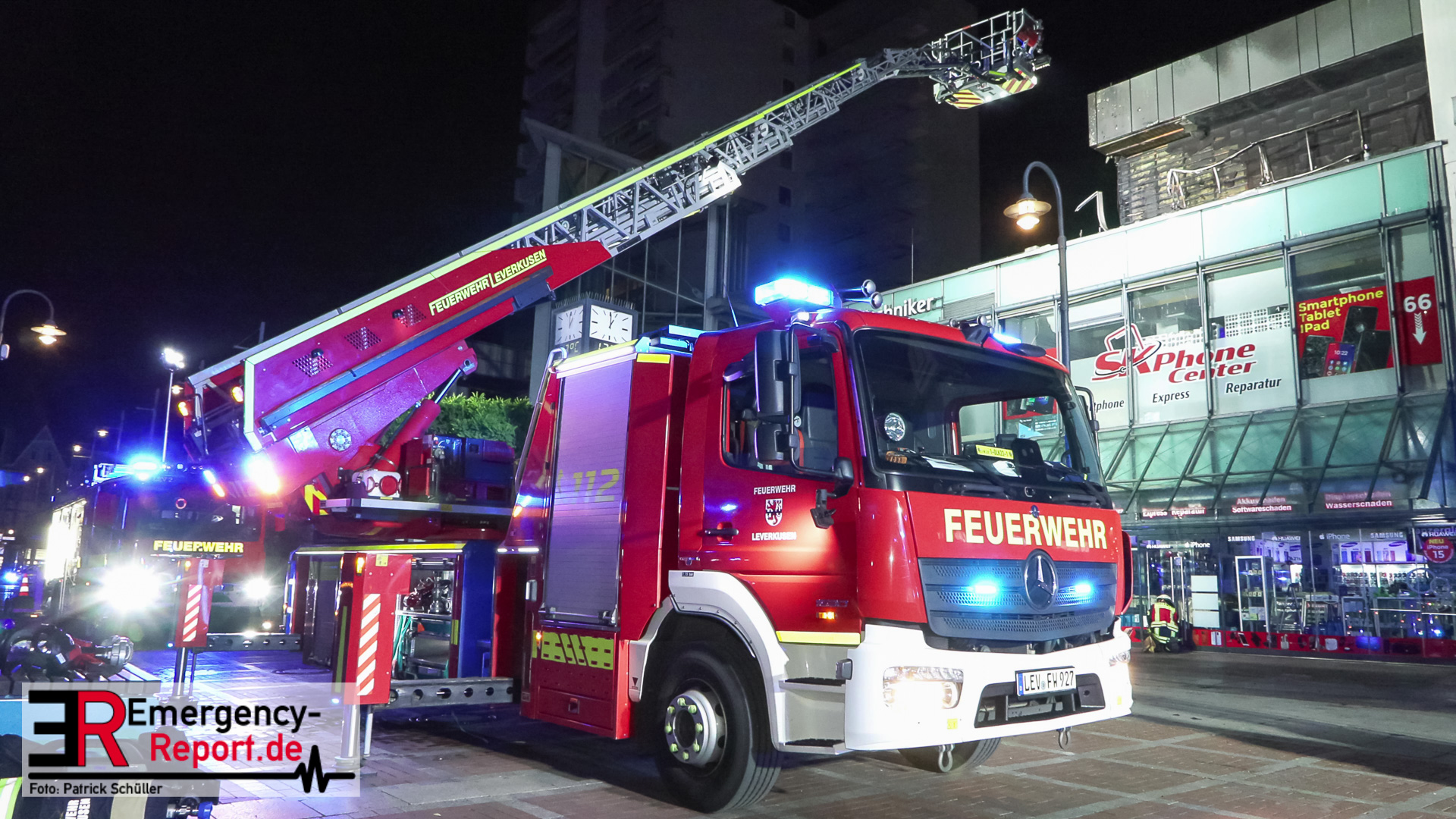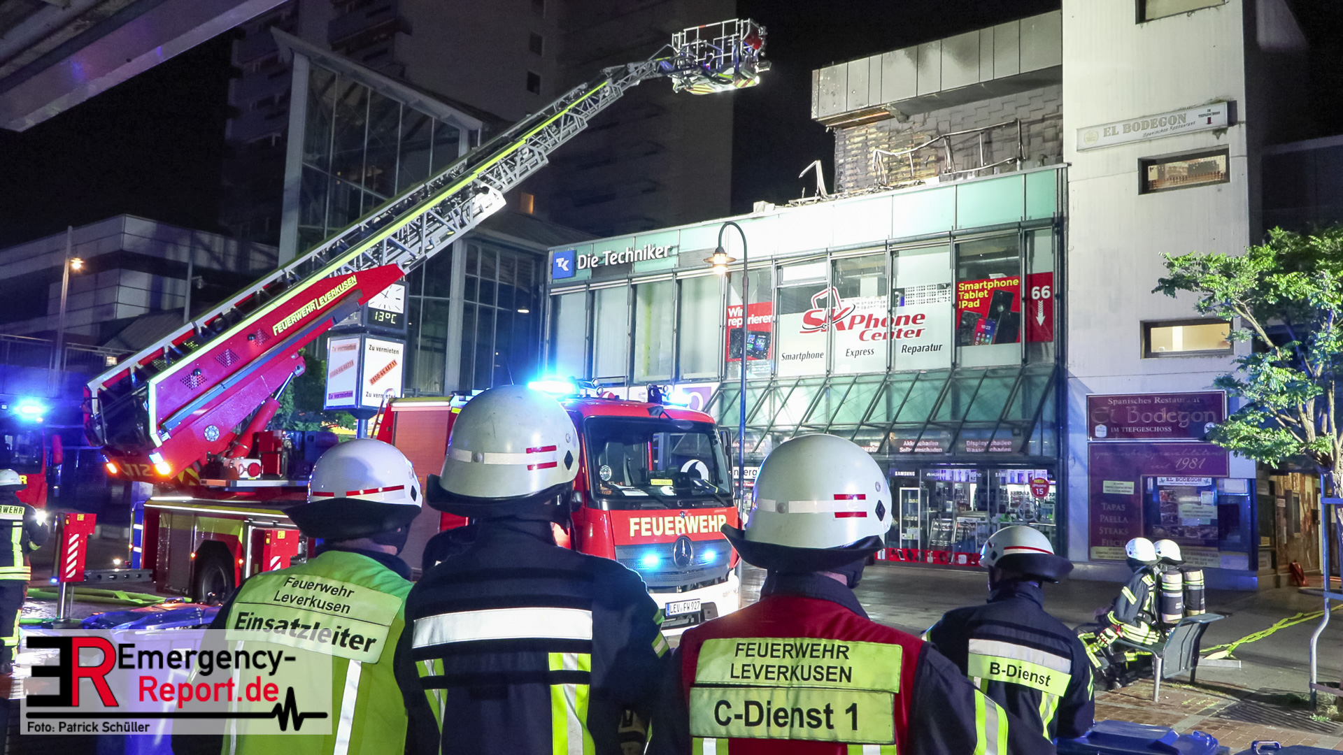 Leverkusen (ots) – Am 21.05.2025 um 23:51 Uhr wurde die Feuerwehr Leverkusen durch mehrere Anrufer über eine Rauchentwicklung im Bereich des Daches eines Geschäftsgebäudes in der Wiesdorfer Fußgängerzone informiert. Aufgrund der Vielzahl eingehen-der Notrufe wurde das Einsatzstichwort bereits auf der Anfahrt erhöht und Einsatzkräfte beider Berufsfeuerwehrwachen, die Einheiten Wiesdorf, Bürrig und Schlebusch der Freiwilligen Feuerwehr sowie Kräfte des Rettungsdienstes zur Einsatzstelle alarmiert. Vor Ort bestätigte sich die Meldung. Die Dachterrasse eines mehr-geschossigen Geschäftsgebäudes brannte.