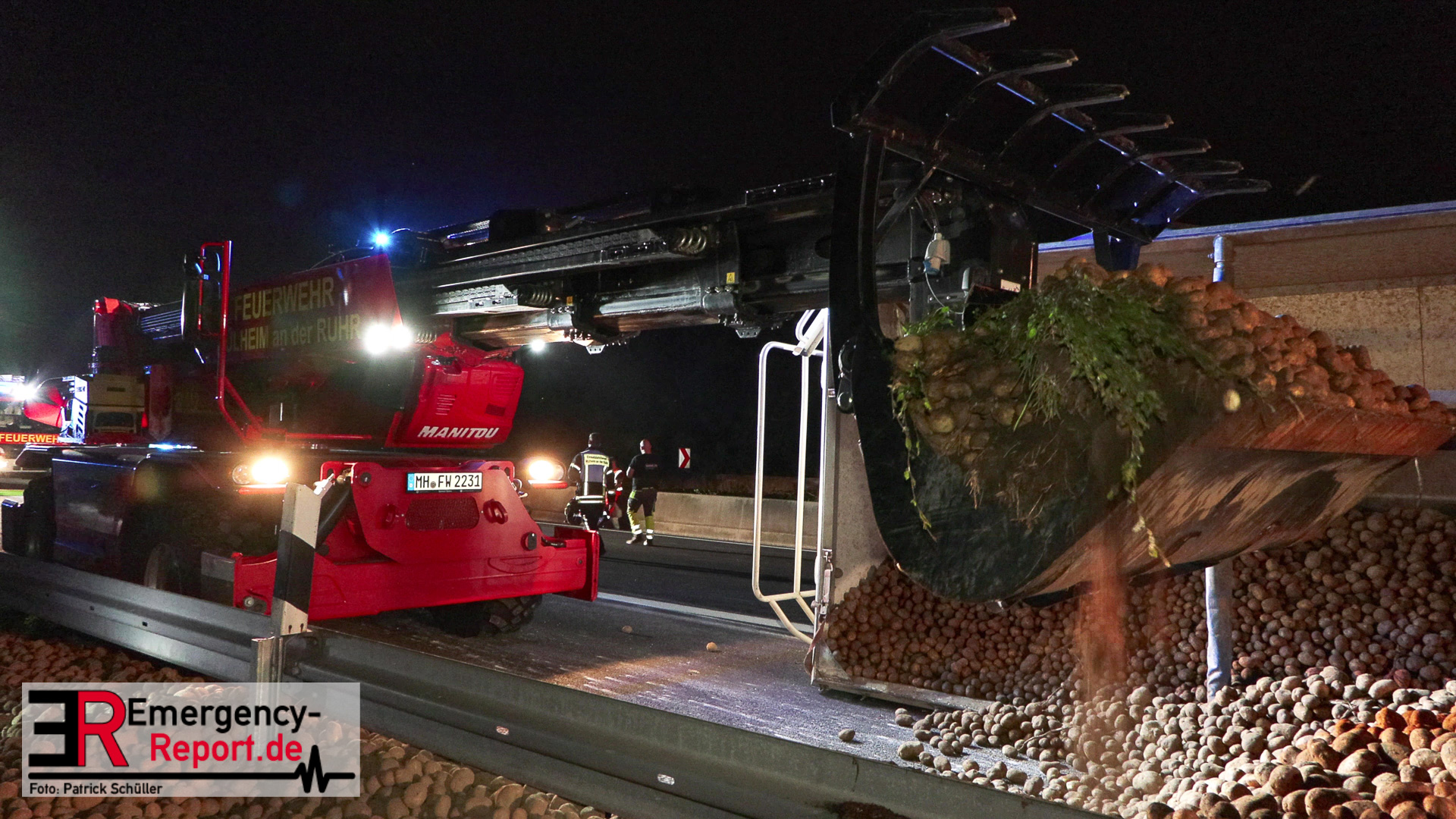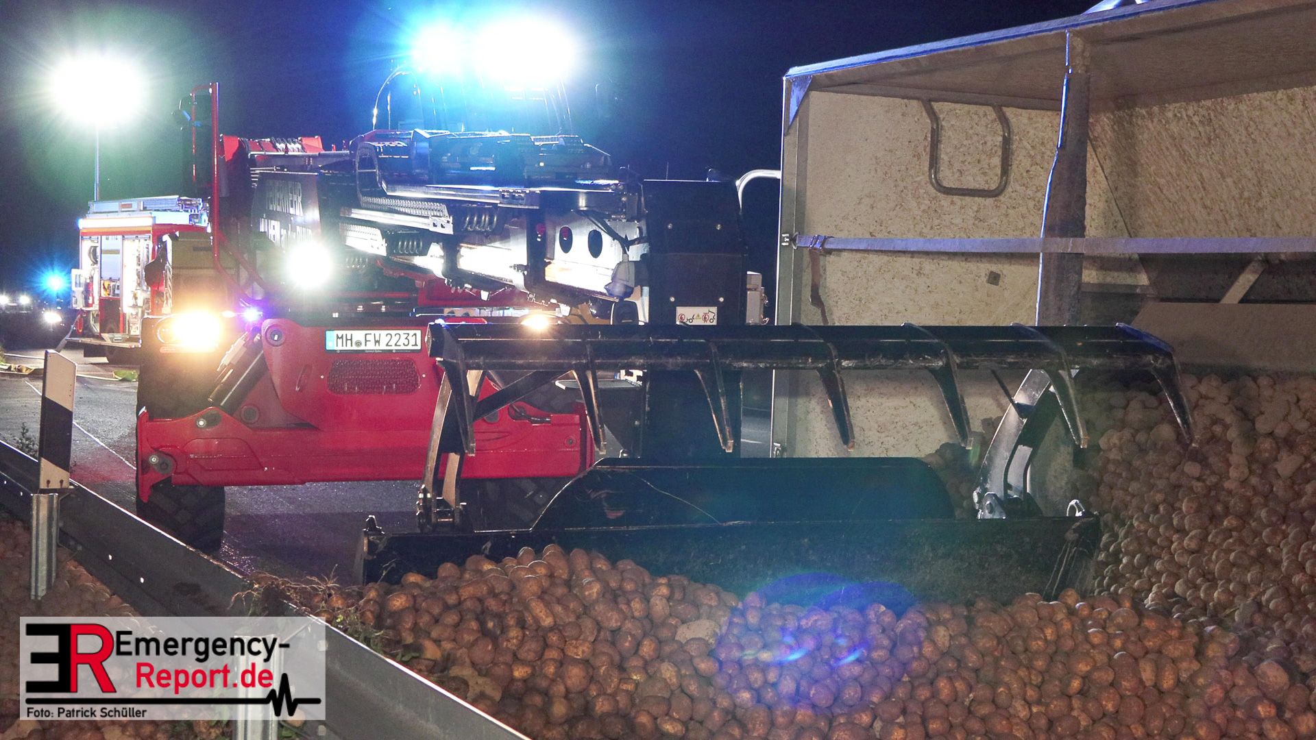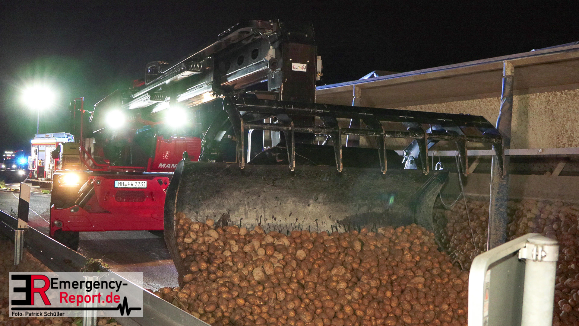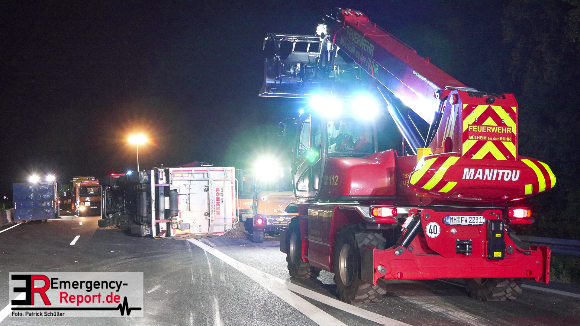 Am Sonntagabend (02.07.2023) wurde die Feuerwehr Mülheim an der Ruhr gegen 20:30 Uhr zu einem Verkehrsunfall auf der Autobahn A 40 in Fahrtrichtung Duisburg gerufen. Augenzeugen meldeten der Leitstelle einen auf die Seite gestürzten und mit Kartoffeln beladenen Sattelzug im Bereich der Anschlussstelle Dümpten.