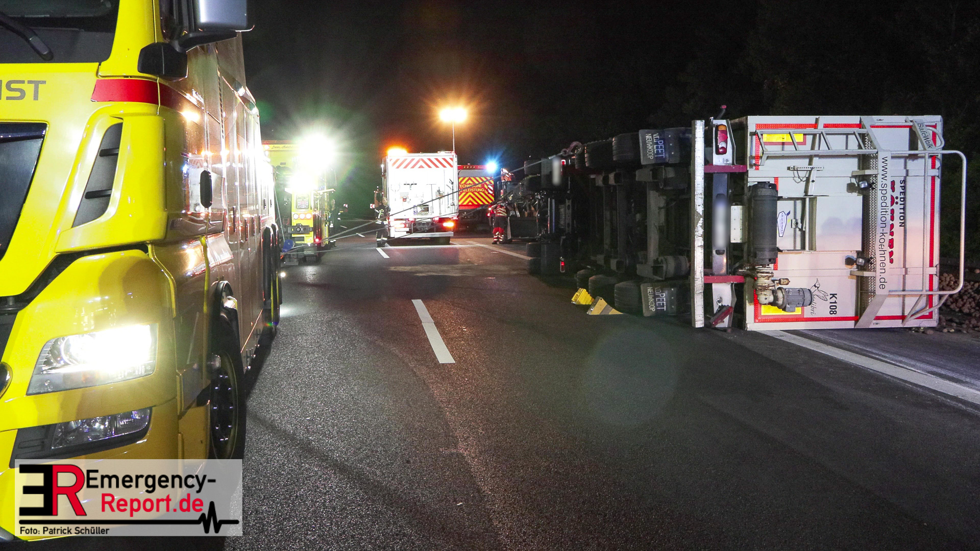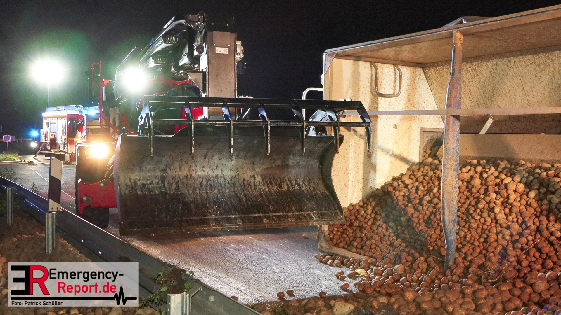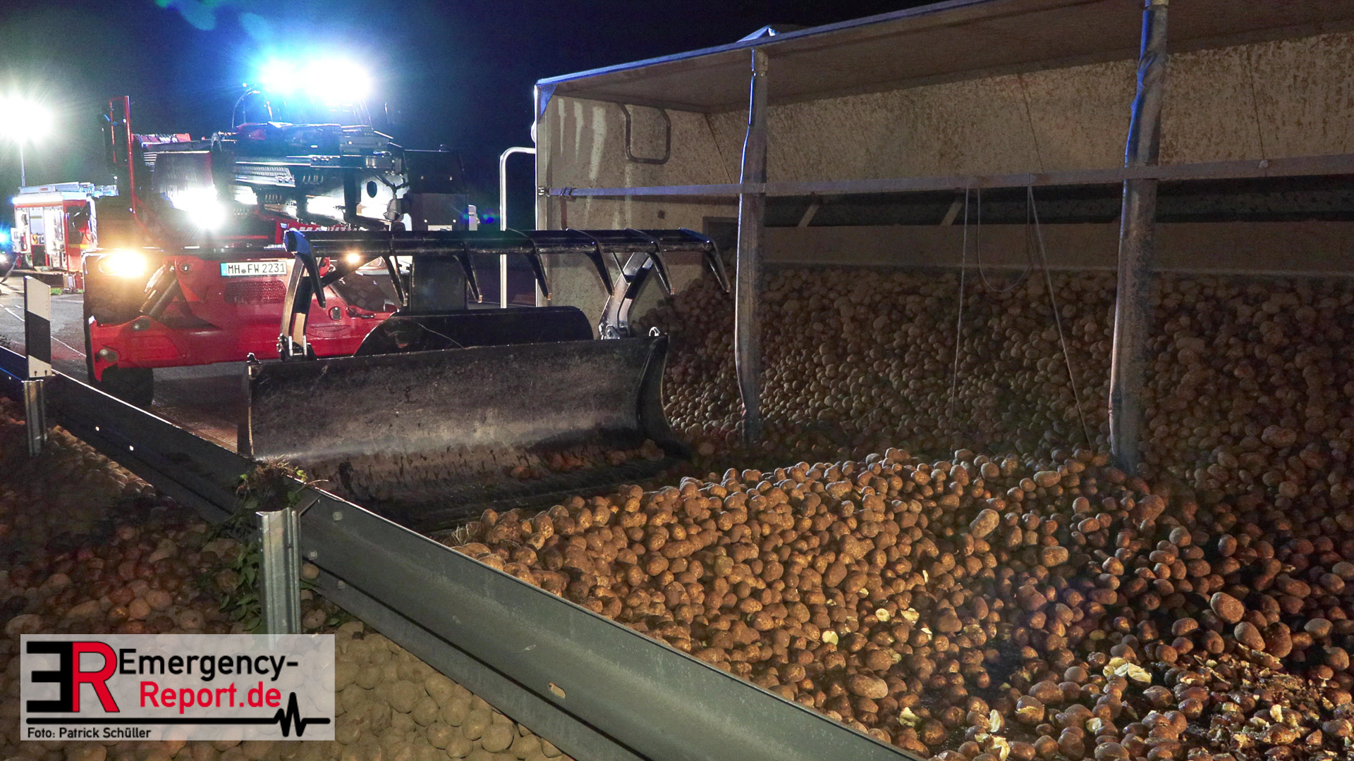 Am Sonntagabend (02.07.2023) wurde die Feuerwehr Mülheim an der Ruhr gegen 20:30 Uhr zu einem Verkehrsunfall auf der Autobahn A 40 in Fahrtrichtung Duisburg gerufen. Augenzeugen meldeten der Leitstelle einen auf die Seite gestürzten und mit Kartoffeln beladenen Sattelzug im Bereich der Anschlussstelle Dümpten.