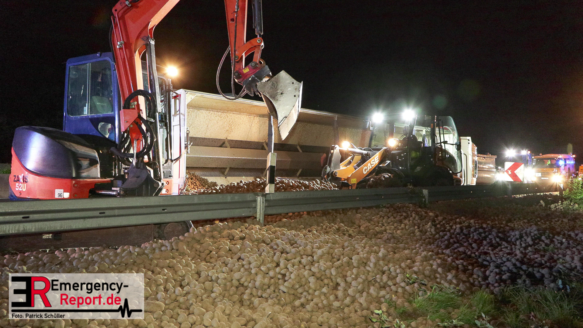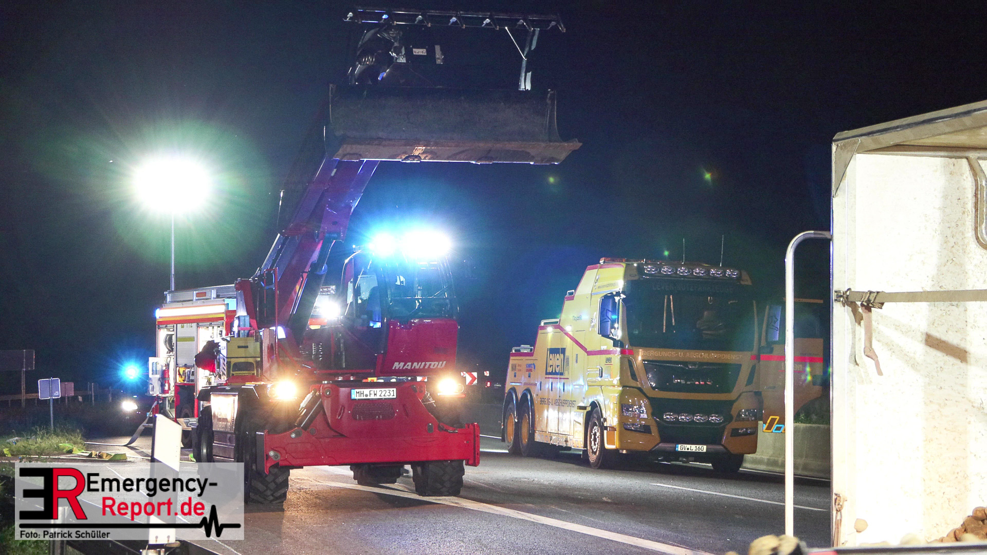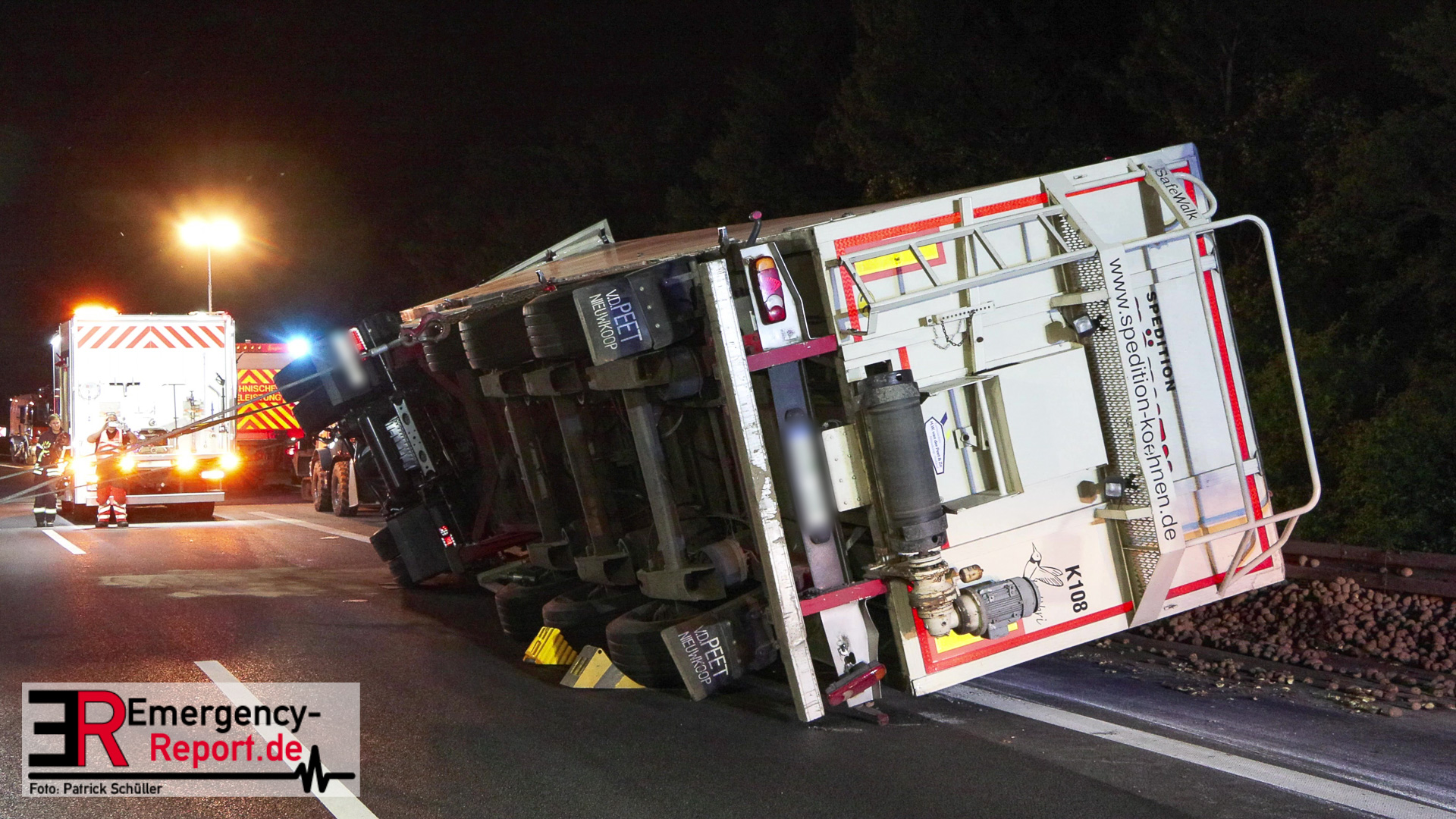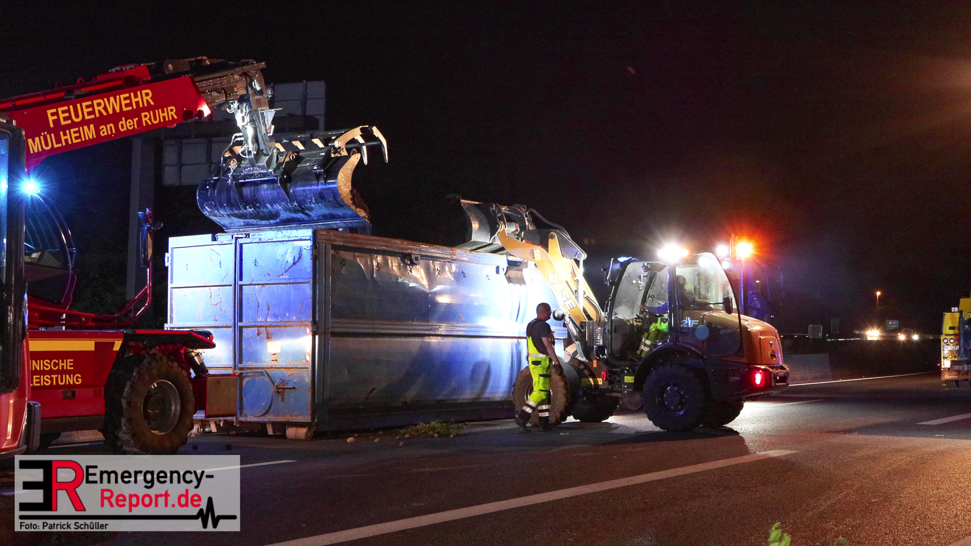 Am Sonntagabend (02.07.2023) wurde die Feuerwehr Mülheim an der Ruhr gegen 20:30 Uhr zu einem Verkehrsunfall auf der Autobahn A 40 in Fahrtrichtung Duisburg gerufen. Augenzeugen meldeten der Leitstelle einen auf die Seite gestürzten und mit Kartoffeln beladenen Sattelzug im Bereich der Anschlussstelle Dümpten.