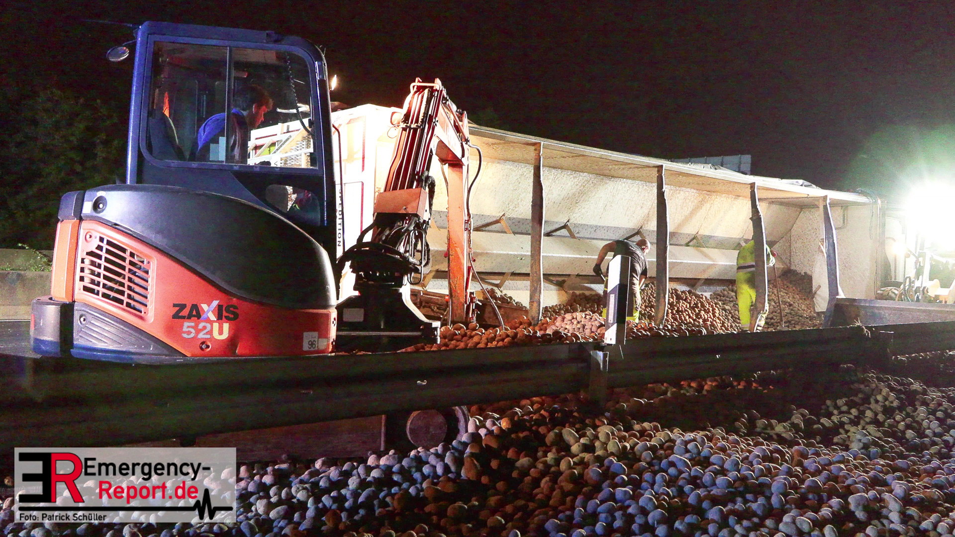 Die Einsatzkräfte der Feuerwehr dichteten zunächst den leckgeschlagenen Dieseltank des Sattelzuges ab und stellten den Brandschutz an der Einsatzstelle sicher. Im weiteren Verlauf wurden die Maßnahmen des hinzugezogenen Bergungsunternehmens unterstützt. Dazu wurde die Einsatzstelle großflächig ausgeleuchtet. Zum Aufrichten des Sattelzuges mussten zunächst rund 25 Tonnen Kartoffeln aus dem Sattelauflieger entladen werden. Hierzu kam unter anderem Räumgerät der Feuerwehr zum Einsatz.