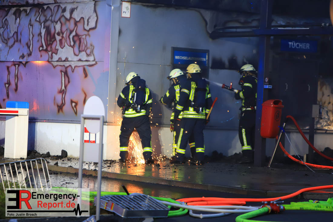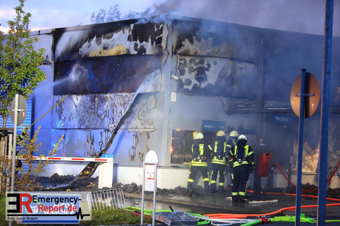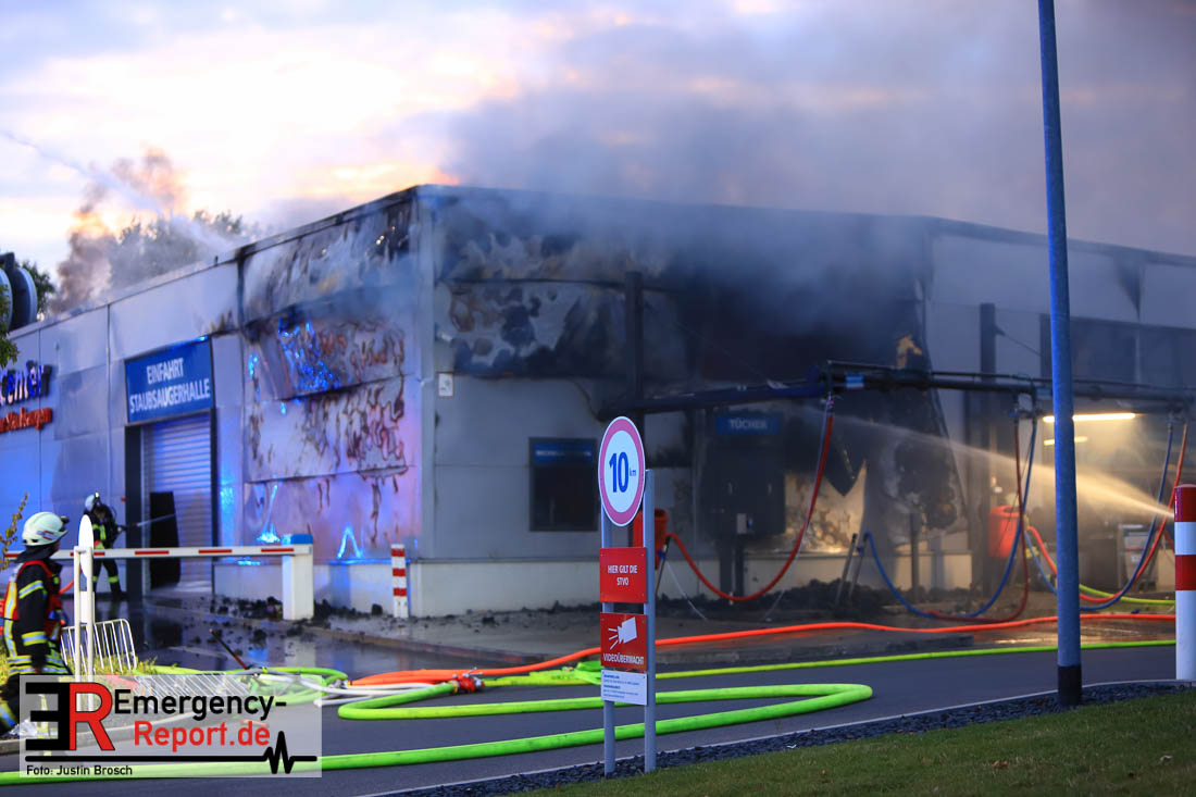Am Montagabend (05.08.) um zirka 20.50 Uhr erreichten eine Vielzahl von Notrufen die Leitstelle der Feuerwehr Mülheim. Im Bereich Mannesmannallee sollte eine große Waschstraße brennen. Sofort rückten zwei Löschzüge der Berufsfeuerwehr aus. Schon auf der Anfahrt war eine starke Rauchentwicklung zu erkennen. Daraufhin wurde auch die Freiwillige Feuerwehr zur Einsatzstelle alarmiert. In einer Waschstraße von zirka 30 mal 100 Meter stand ein seperater Technikraum im Vollbrand. Auch auf das Dach hatte das Feuer schon übergegriffen. Durch den sofortigen Einsatz von zwei Wenderohren über Drehleitern, sowie vier weiteren Löschrohren konnte ein weiteres Übergreifen des Feuers auf das Dach verhindert werden. Durch eine sogenannte Riegelstellung konnte das Übergreifen des Feuers auf den Einfahrtbereich der Waschstraße verhindert werden. Zur Zeit (22.45 Uhr) ist das Feuer unter Kontrolle und es laufen noch Nachlöscharbeiten. Die Polizei ist vor Ort und hat mit den Ermittlungen zur Brandursache begonnen.