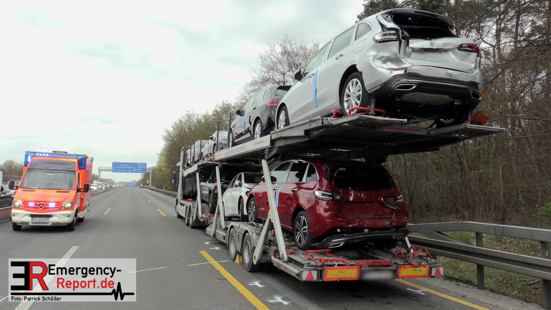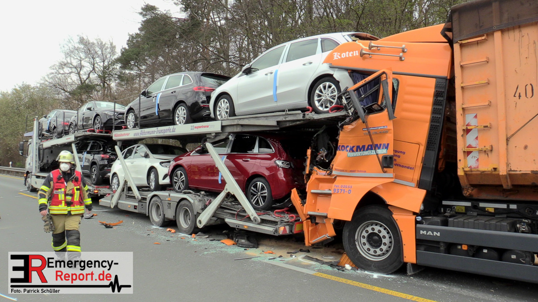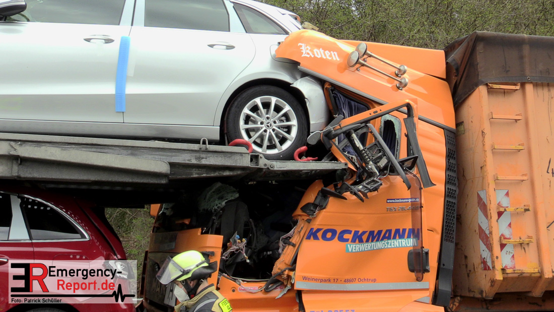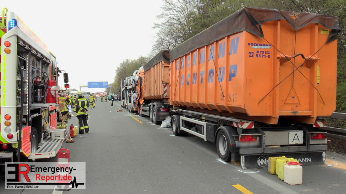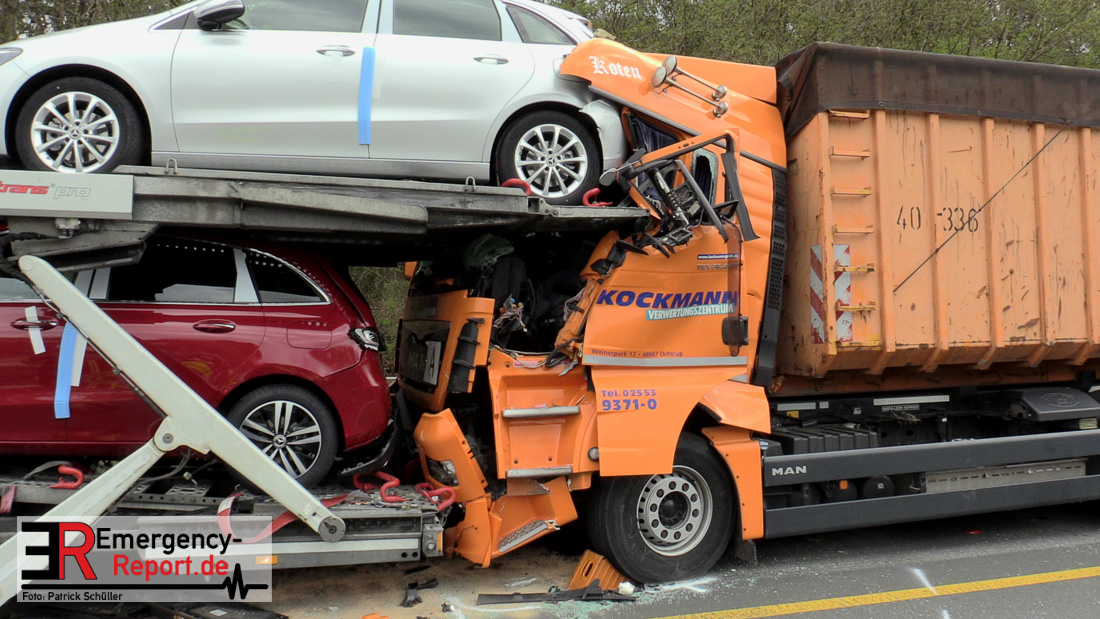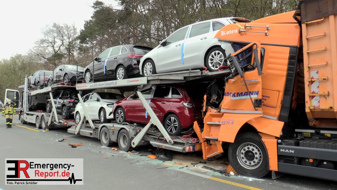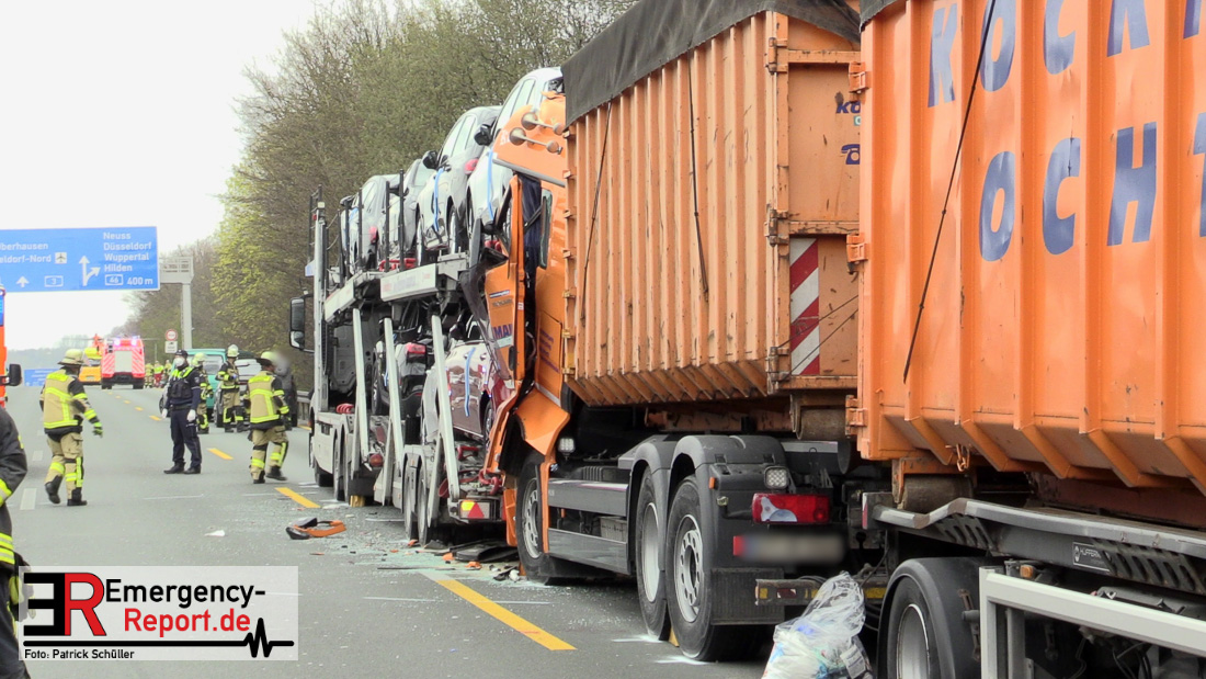 Eine schwer verletzte Person, hoher Sachschaden und starke Verkehrsbeeinträchtigungen sind die Bilanz eines Verkehrsunfalls von heute Vormittag auf der A 3 in Richtung Duisburg zwischen dem Dreieck Langenfeld und dem Kreuz Hilden. Den ersten Ermittlungen zufolge fuhr eine 25-Jährige aus Wiesmoor mit ihrem Autotransporter auf dem rechten Fahrstreifen in Richtung Duisburg. Hier musste sie verkehrsbedingt abbremsen. Ein 31-jähriger Lkw-Fahrer aus Ochtrop erkannte die Situation offenkundig zu spät und fuhr frontal auf das Lkw Gespann der 25-Jährigen auf. Durch den Aufprall zog sich der 31-Jährige schwerste Verletzungen zu. Ein Rettungshubschrauber flog den Mann in eine Klinik. Nach ersten Aussagen der Notärzte kann eine Lebensgefahr derzeit nicht ausgeschlossen werden. Momentan ist die A3 in Fahrtrichtung Duisburg aufgrund von Fahrbahnreinigungsarbeiten noch gesperrt. Der Fahrzeugverkehr wird über die A542 auf die A3 Richtung Köln abgeleitet. Das Verkehrsunfallaufnahmeteam der Polizei Düsseldorf sicherte vor Ort die Unfallspuren. Der Verkehr staut sich hinter der Unfallstelle bislang auf zehn Kilometer zurück. Den Sachschaden schätzt die Polizei auf 600.000 Euro.