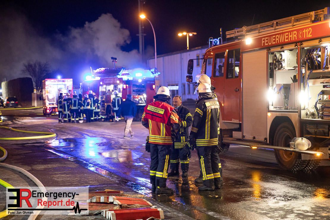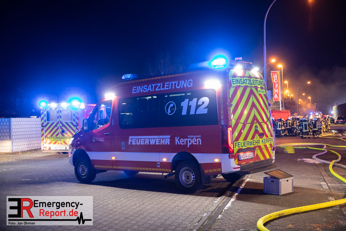 Am gestrigen Donnerstag wurde die Feuerwehr Kerpen gegen 17:15 Uhr zu einem Großbrand in die Daimlerstraße in Kerpen-Sindorf in das dortige Industriegebiet alarmiert. Beim Eintreffen der ersten Einsatzkräfte stand ein rund 200 Quadratmeter großer Hallenkomplex eines Autoverwertungsbetriebes im Vollbrand. Der Brand hatte zudem bereits auf die ca. 400 Quadratmeter große Lagerhalle eines unmittelbar angrenzenden Zimmereibetriebes übergegriffen. In der Anfangsphase waren mehrere Explosionen zu hören.