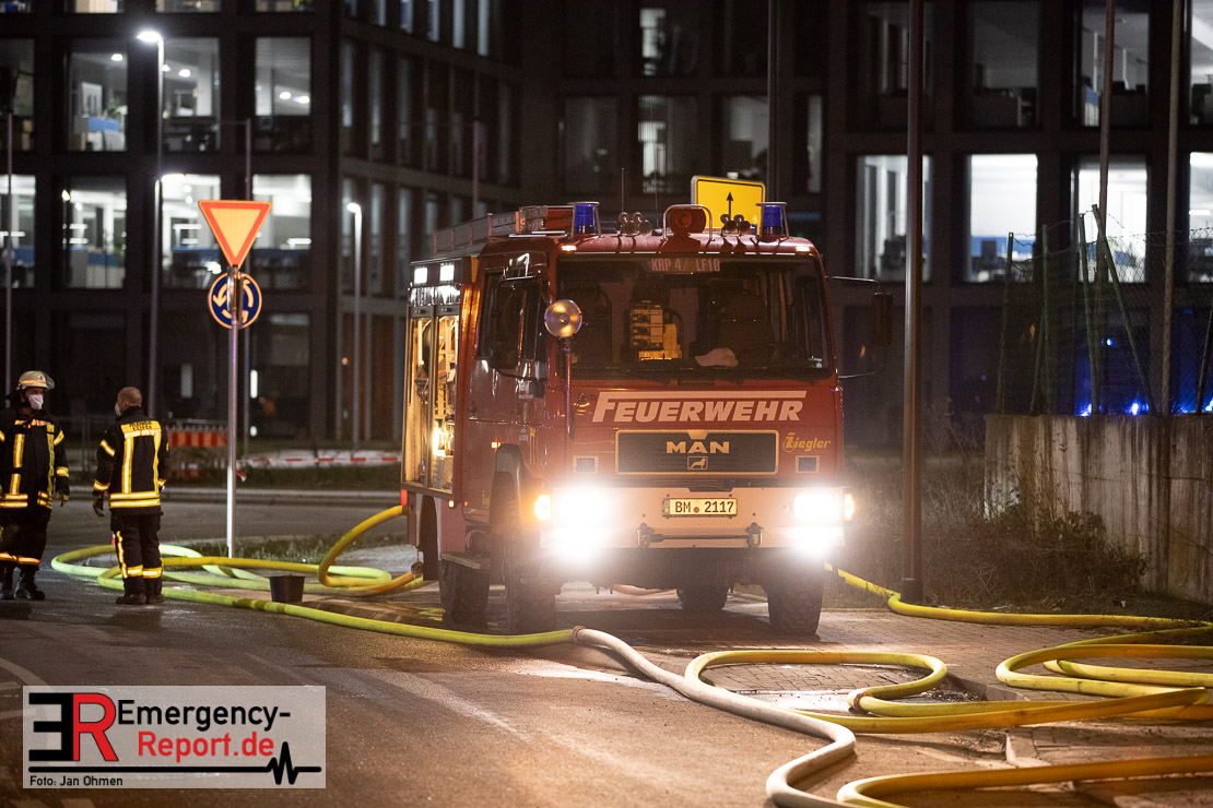 Durch die Einsatzleiterin der Feuerwehr Kerpen, Brandoberinspektorin Wiebke Lubnau, wurden umgehend weitere Einheiten zur Einsatzstelle alarmiert und die Brandbekämpfung im Außenangriff eingeleitet. Mittels mehrerer Riegelstellungen konnte ein weiteres Übergreifen des Brandes auf einen benachbarten Papierverarbeitungsbetrieb verhindert werden. Sowohl über die Teleskopmastbühne der Feuerwehr Kerpen als auch über die zusätzlich alarmierte Drehleiter der Feuerwehr Bergheim wurden Wenderohre zur Brandbekämpfung eingesetzt. Zur Sicherstellung des großen Löschwasserbedarfes wurden mehrere hundert Meter Schlauchleitung von verschiedenen Hydranten aufgebaut. Neben den beiden Wenderohren der Hubrettungsgeräte setzten die Einsatzkräfte unter schwerem Atemschutz weitere sieben Strahlrohre im Außenangriff zur Brandbekämpfung ein.