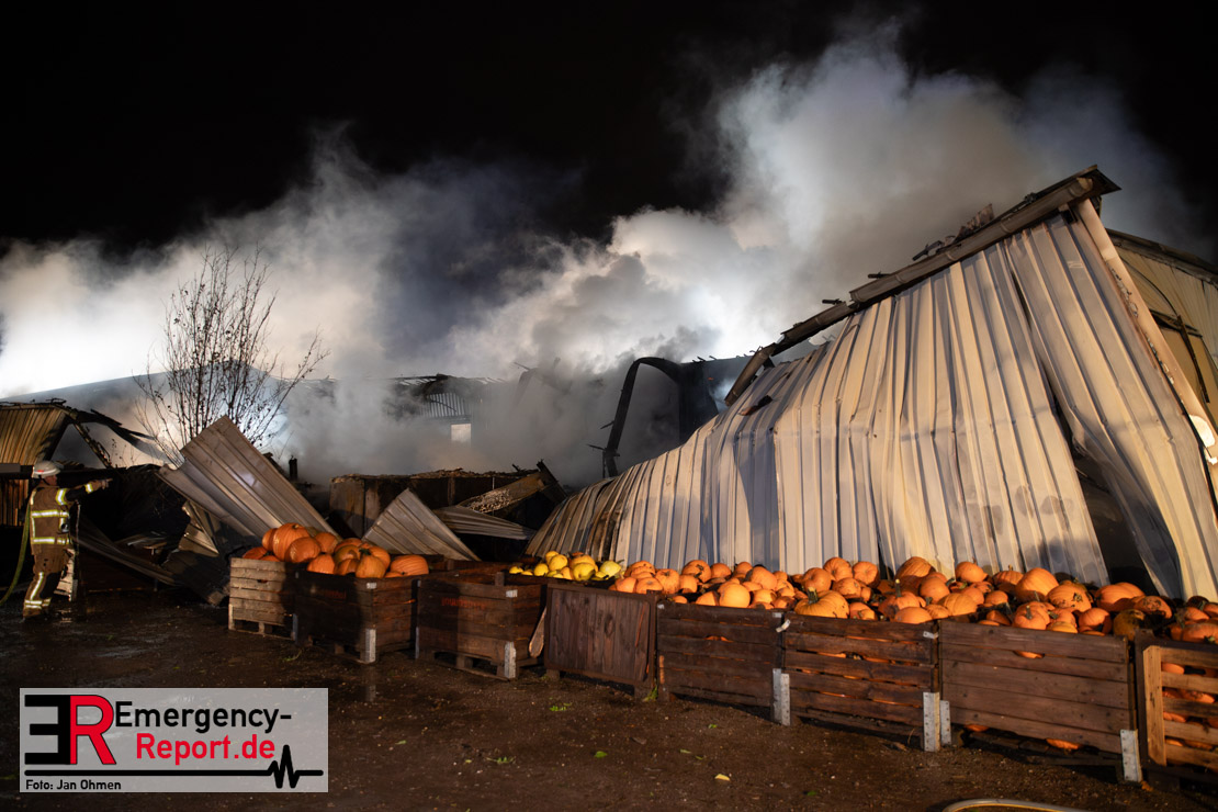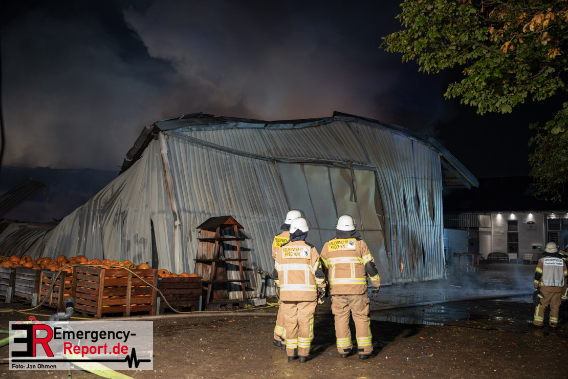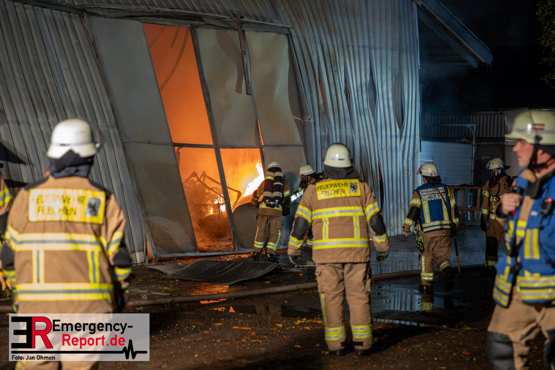 Laut ersten Erkenntnissen soll der Brand gegen 17.50 Uhr auf dem Gelände an der Bonnstraße zwischen den Ortschaften Königsdorf, Buschbell und Köln-Weiden ausgebrochen sein. In der Lagerhalle sollen sich Verpackungsmaterialien, Arbeitsmaschinen und ein Dieseltank befunden haben. Eine hochwertige Erntemaschine, die in unmittelbarer Nähe abgestellt war, wurde durch das Feuer ebenfalls stark beschädigt. Gemeinsam mit Unterstützungskräften der Bereitschaftspolizei Köln sperrten Polizisten Teile der Aachener Straße und der Bonnstraße komplett ab. Gegen 23.30 Uhr hoben sie alle Sperrungen wieder auf.