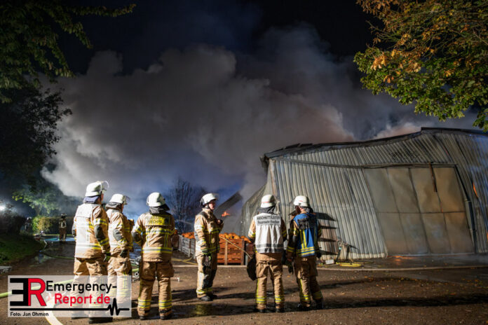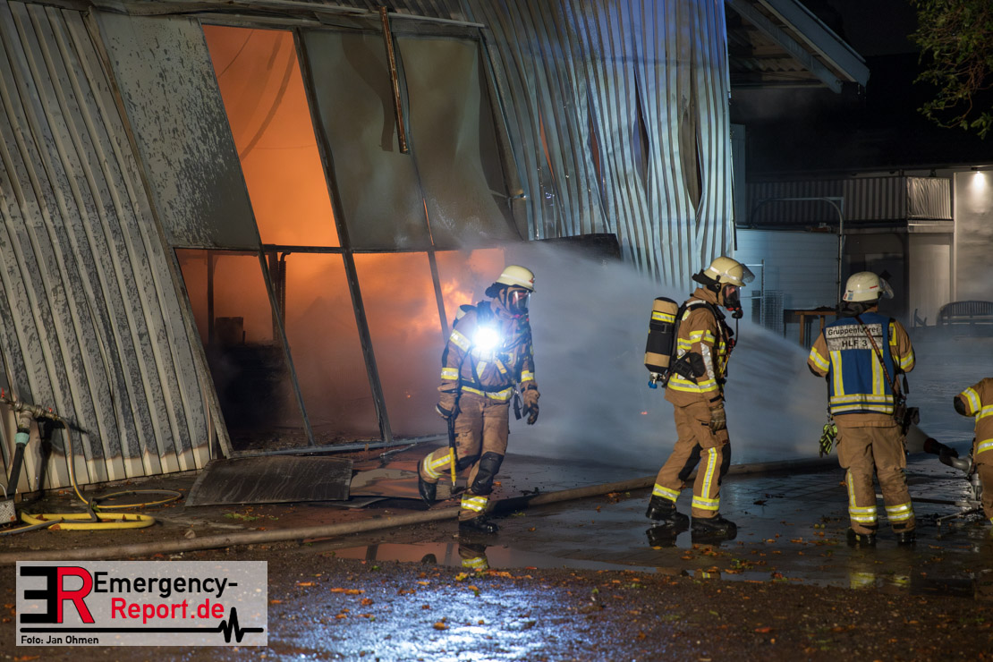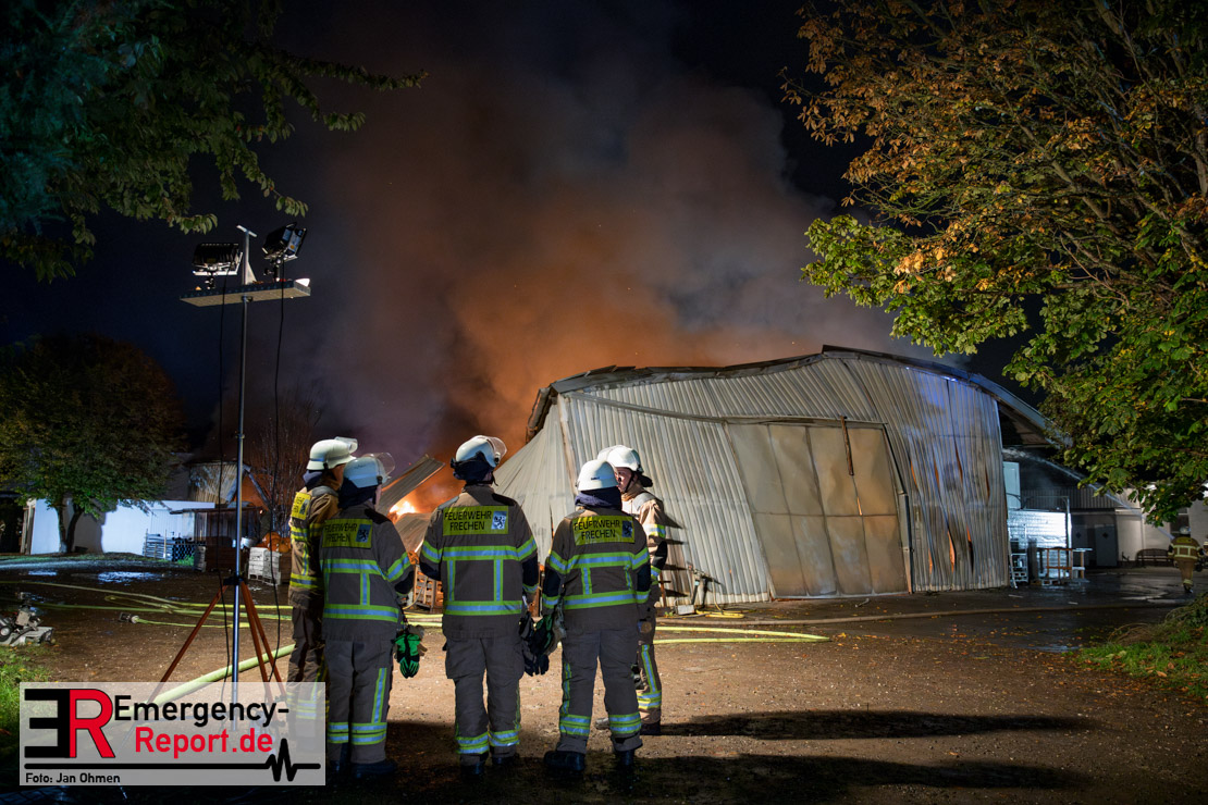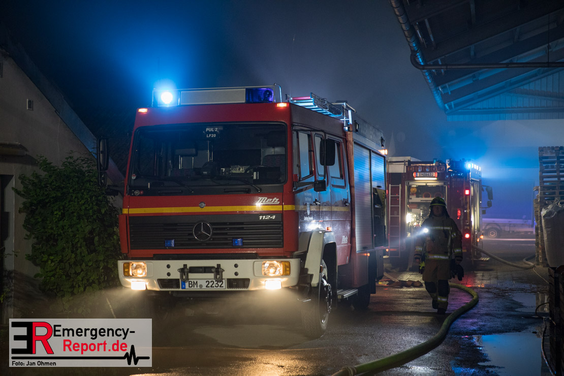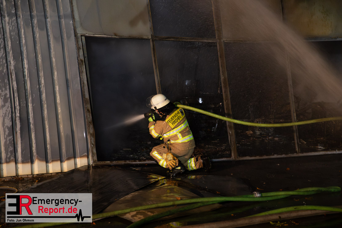 Aufgrund der Ortskenntnisse und der massiven Rauchentwicklung wurde bereits auf der Anfahrt nochmals eine Alarmerhöhung durchgeführt. Beim Eintreffen nach kurzer Zeit brannte eine Lagerhalle von zirka 1.000 Quadratmetern bereits in voller Ausdehnung. Neben der sofort eingeleiteten Räumung der direkt anliegenden Wohneinheiten und Gebäuden wurde zum Schutz der angrenzenden Bebauung eine Riegelstellung aufgebaut, um diese vor einer Brandausbreitung zu schützen. Parallel wurde ein massiver Löschangriff vorgenommen.
