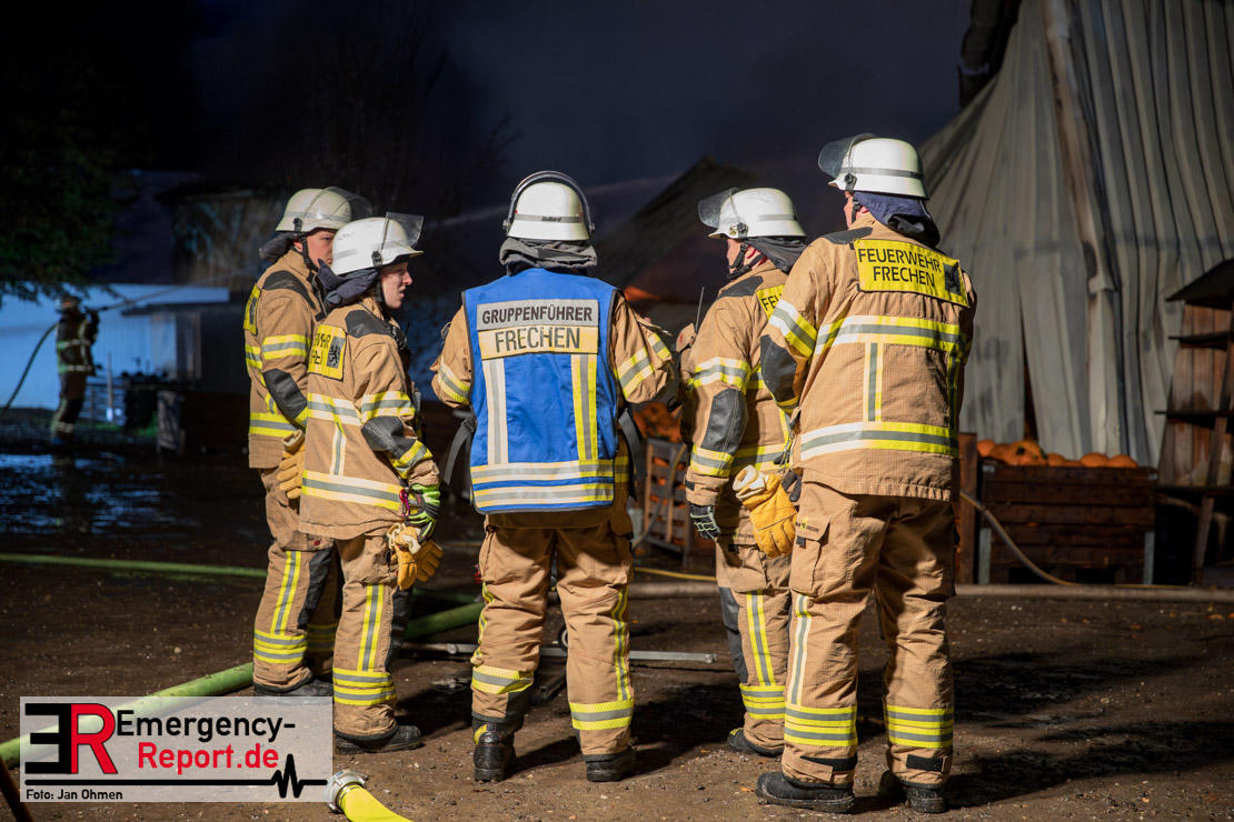 Zahlreiche Notrufe bestätigten das gut sichtbare Brandereignis, so dass die Leitstelle vor dem Ausrücken der ersten Kräfte eine Alarmerhöhung durchführte und die gesamte Feuerwehr der Stadt Frechen, die hauptamtlichen Wache, den Löschzug Frechen und den Löschzug Habbelrath alarmierte.
