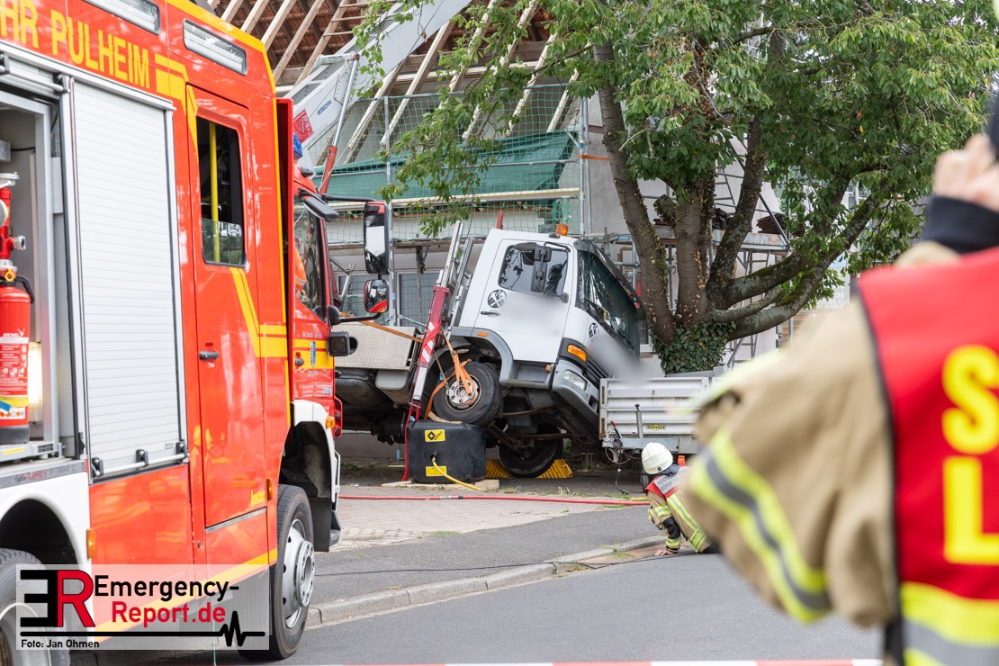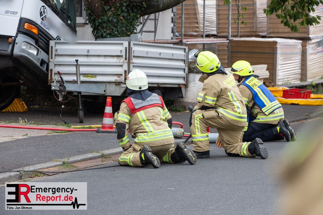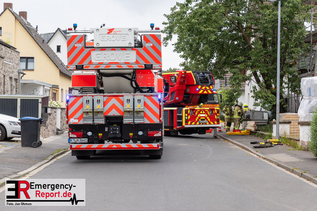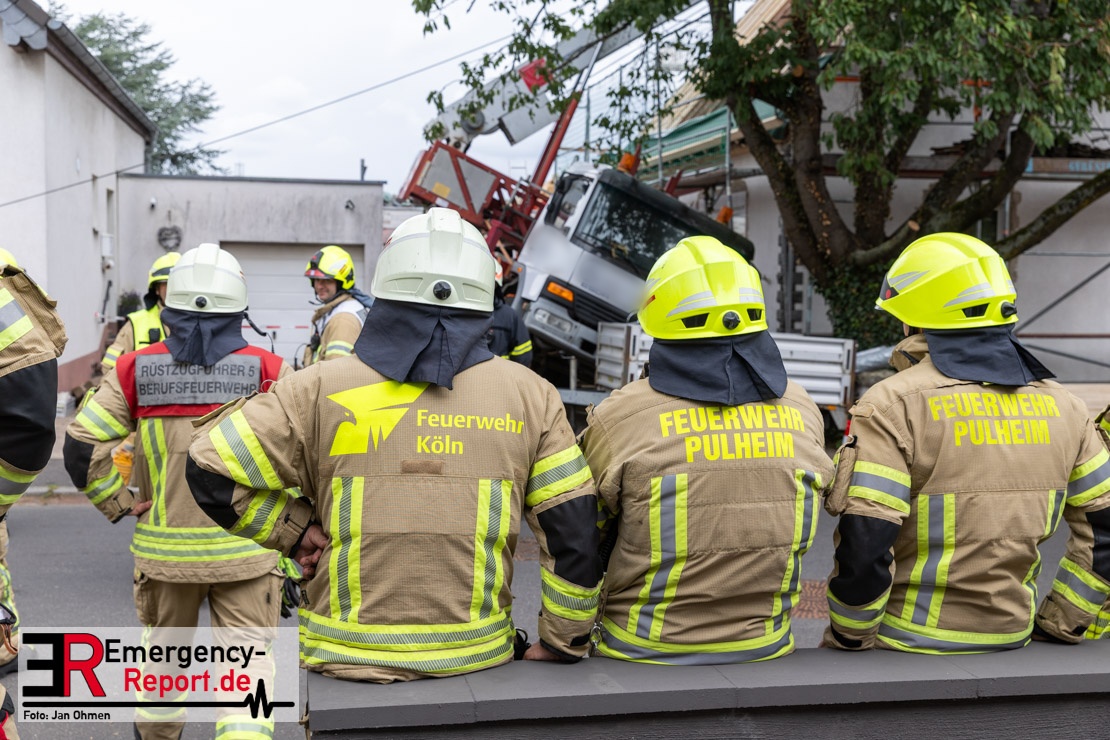 Um kurz vor halb elf wurden die Löschzüge aus Pulheim, Stommeln und Geyen mit den hauptamtlichen Kräften und dem Rettungsdienst in die Steinackerstraße gerufen. Hier sollte ein Baukran auf ein Haus gestürzt sein. Bei Eintreffen der ersten Kräfte fanden diese einen mobilen Baukran einer Dachdeckerfirma vor, der bei seinen Arbeiten seitlich umgekippt war und dessen Ausleger auf dem Dachfirst eines zu renovierenden Dachstuhls zum Liegen gekommen war. An dem Ausleger befand sich eine mit alten Ziegeln gefüllte Mulde, die beim Kippen des Auslegers auf gut zwei Quadratmeter die äußere Dachschicht des Nachbarhauses zerstörte. Eine erste Erkundung ergab, dass das Haus, auf dem der Kran lag, zur Zeit nicht bewohnt war. Die Bewohner des Nachbarhauses kamen mit einem großen Schrecken davon, zumal sich diese im Moment als die Mulde das Haus traf, im Bereich des Schadensortes aufhielten.