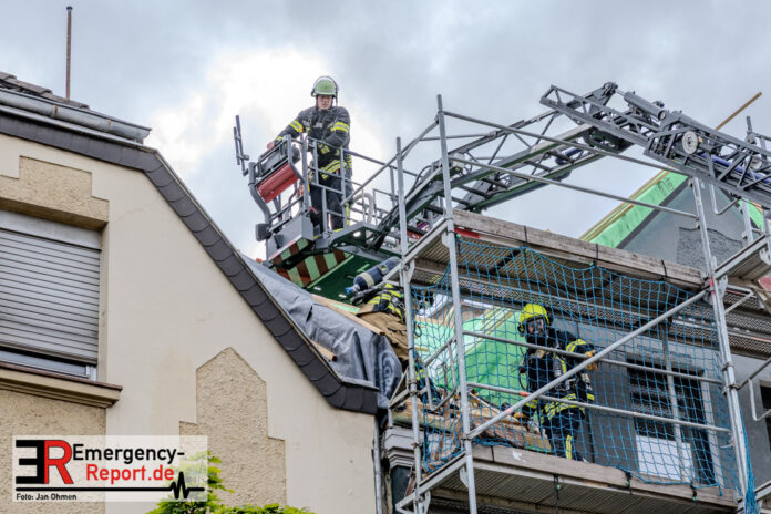 Bereits beim Eintreffen der ersten Kräfte war eine deutliche Rauchentwicklung im Bereich des Dachstuhls eines mehrgeschossigen Wohngebäudes sichtbar, an dem zurzeit Renovierungsarbeiten stattfinden. Umgehend wurde ein Löschangriff eingeleitet. Ein Team ging über die Drehleiter, ein weiteres über ein vorhandenes Baugerüst zur Brandbekämpfung im 3. Obergeschoss vor.