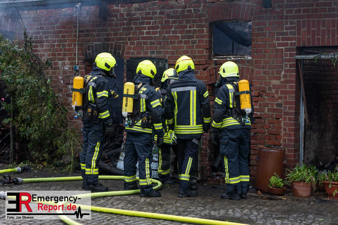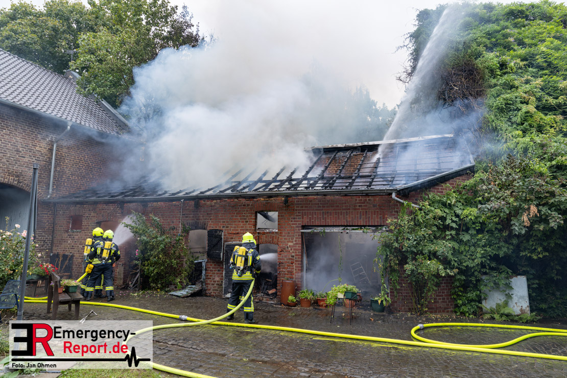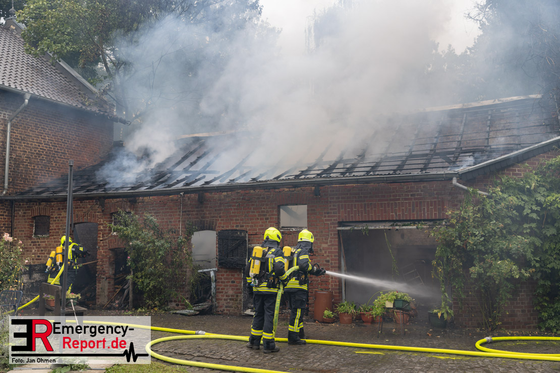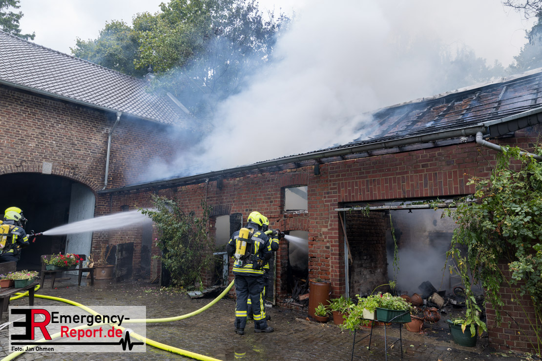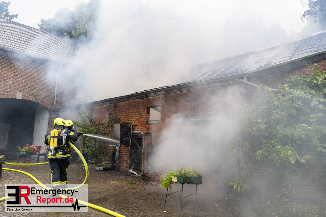 Bereits auf der Anfahrt stellten die Einsatzkräfte eine teils immense Rauchentwicklung fest und konnten beim Eintreffen an der Einsatzstelle bestätigen, dass eine Scheune von ca. 15 mal 5 Meter in Vollbrand stand. Da das Feuer drohte auf eine weitere Scheune im rückwärtigen Bereich und ein an der Straße gelegenes Wohngebäude überzugreifen, wurde direkt ein umfangreicher Löschangriff gestartet, der im Einsatzverlauf auf 4 C-Rohre (hiervon eines vom Korb der Drehleiter) ausgeweitet wurde. Zur Vorhaltung personeller Ressourcen an der Einsatzstelle wurde ebenfalls in der ersten Einsatzphase der sog. „Stadtalarm“ für alle Einheiten der Feuerwehr Jüchen ausgelöst.