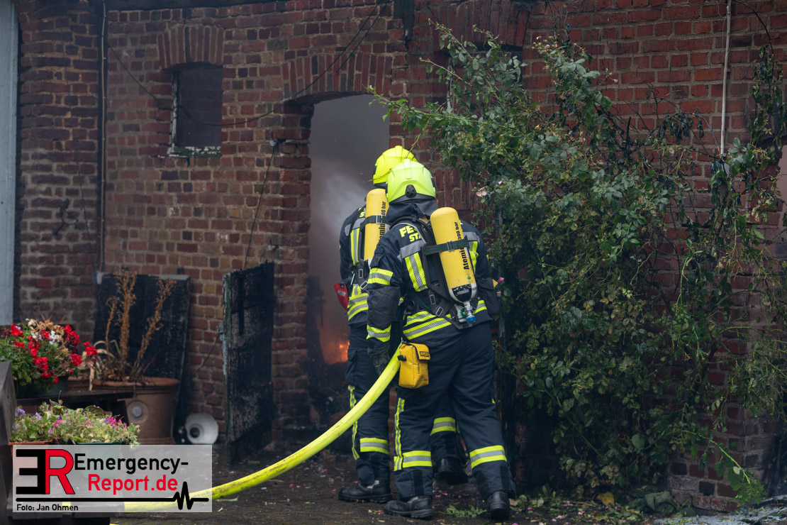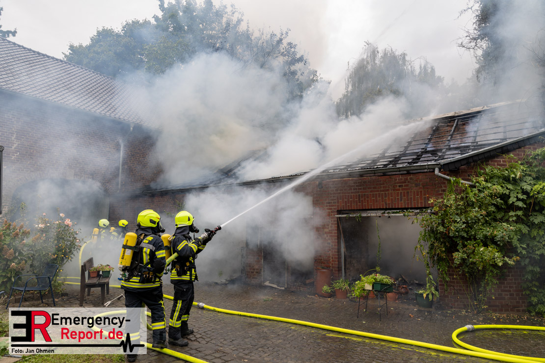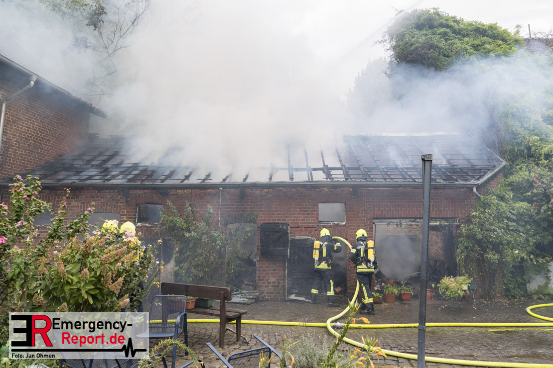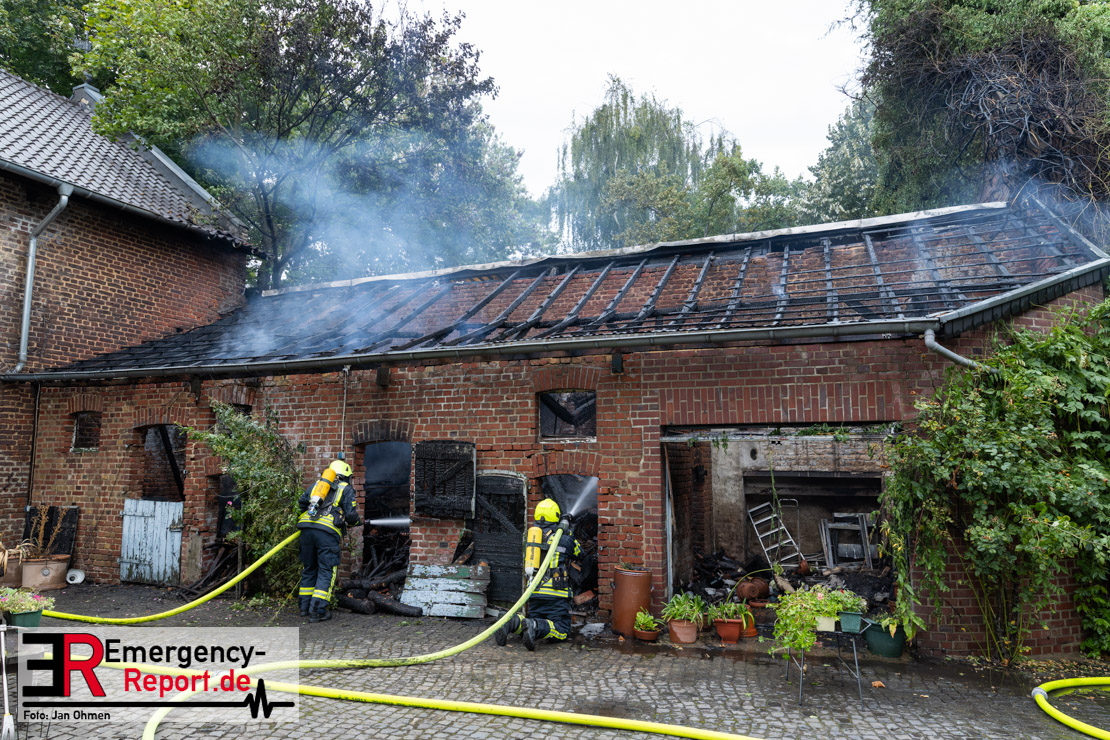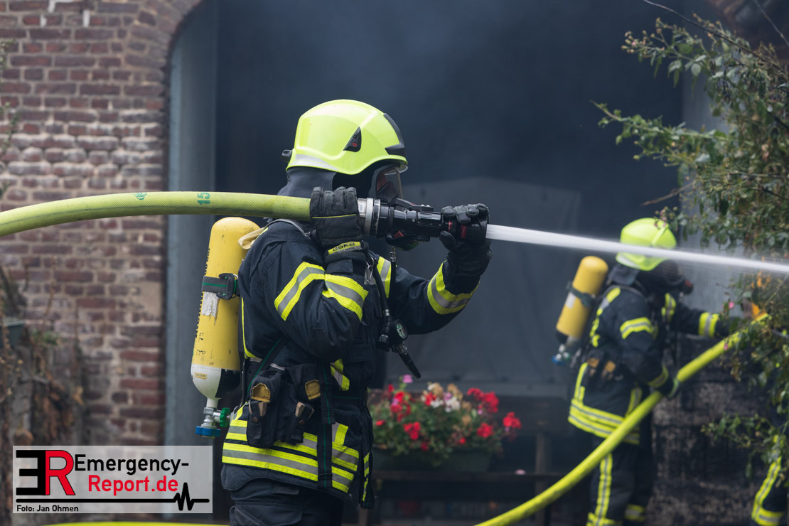 Bereits auf der Anfahrt stellten die Einsatzkräfte eine teils immense Rauchentwicklung fest und konnten beim Eintreffen an der Einsatzstelle bestätigen, dass eine Scheune von ca. 15 mal 5 Meter in Vollbrand stand. Da das Feuer drohte auf eine weitere Scheune im rückwärtigen Bereich und ein an der Straße gelegenes Wohngebäude überzugreifen, wurde direkt ein umfangreicher Löschangriff gestartet, der im Einsatzverlauf auf 4 C-Rohre (hiervon eines vom Korb der Drehleiter) ausgeweitet wurde. Zur Vorhaltung personeller Ressourcen an der Einsatzstelle wurde ebenfalls in der ersten Einsatzphase der sog. „Stadtalarm“ für alle Einheiten der Feuerwehr Jüchen ausgelöst.