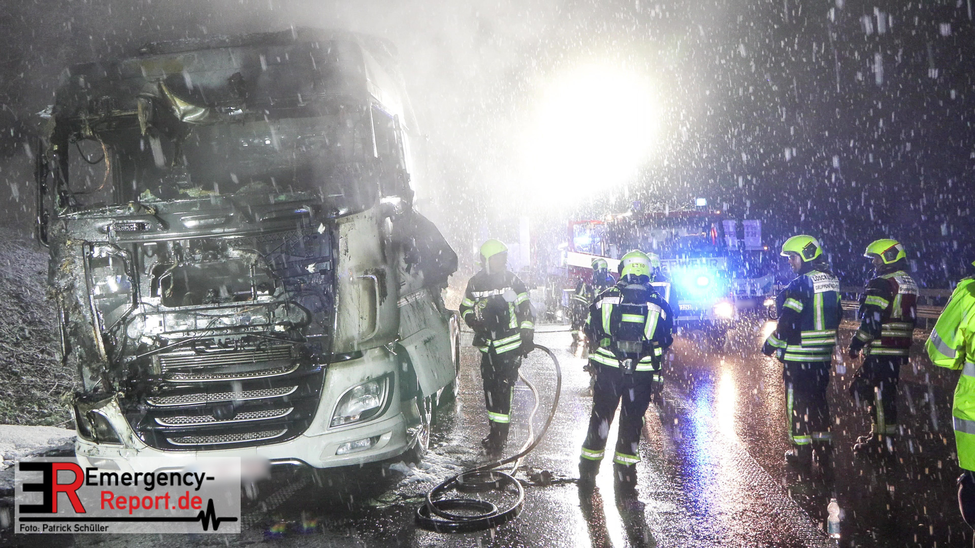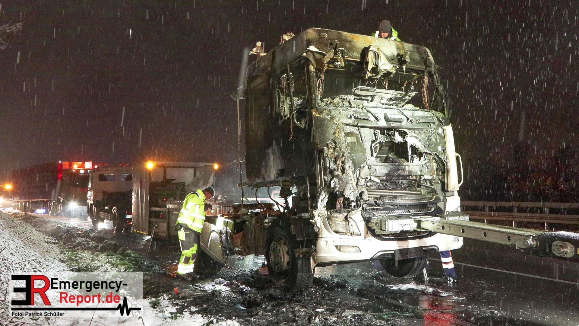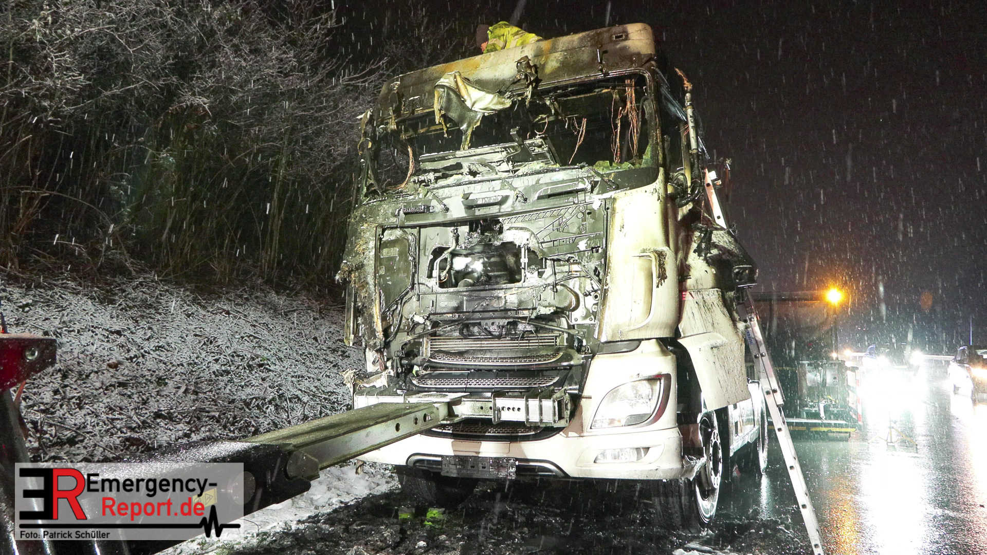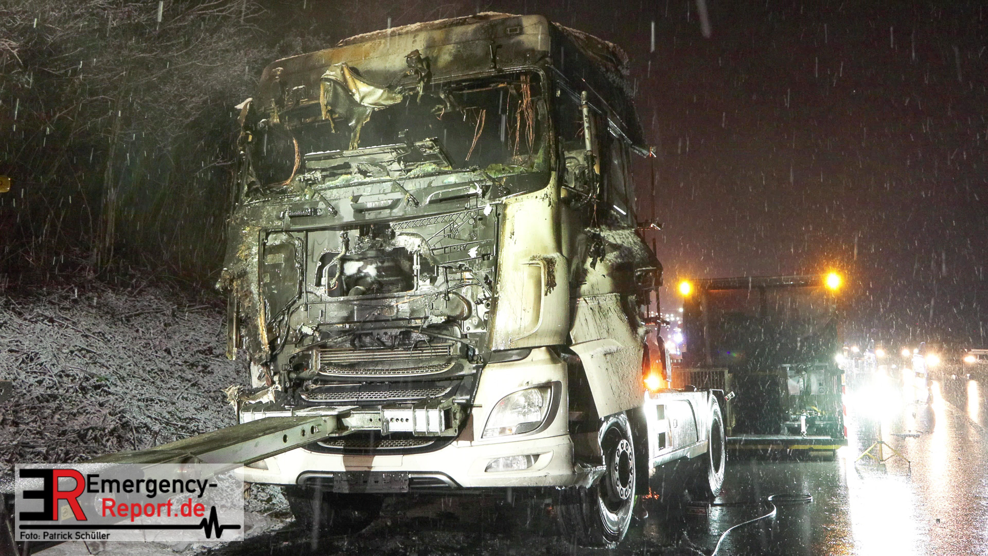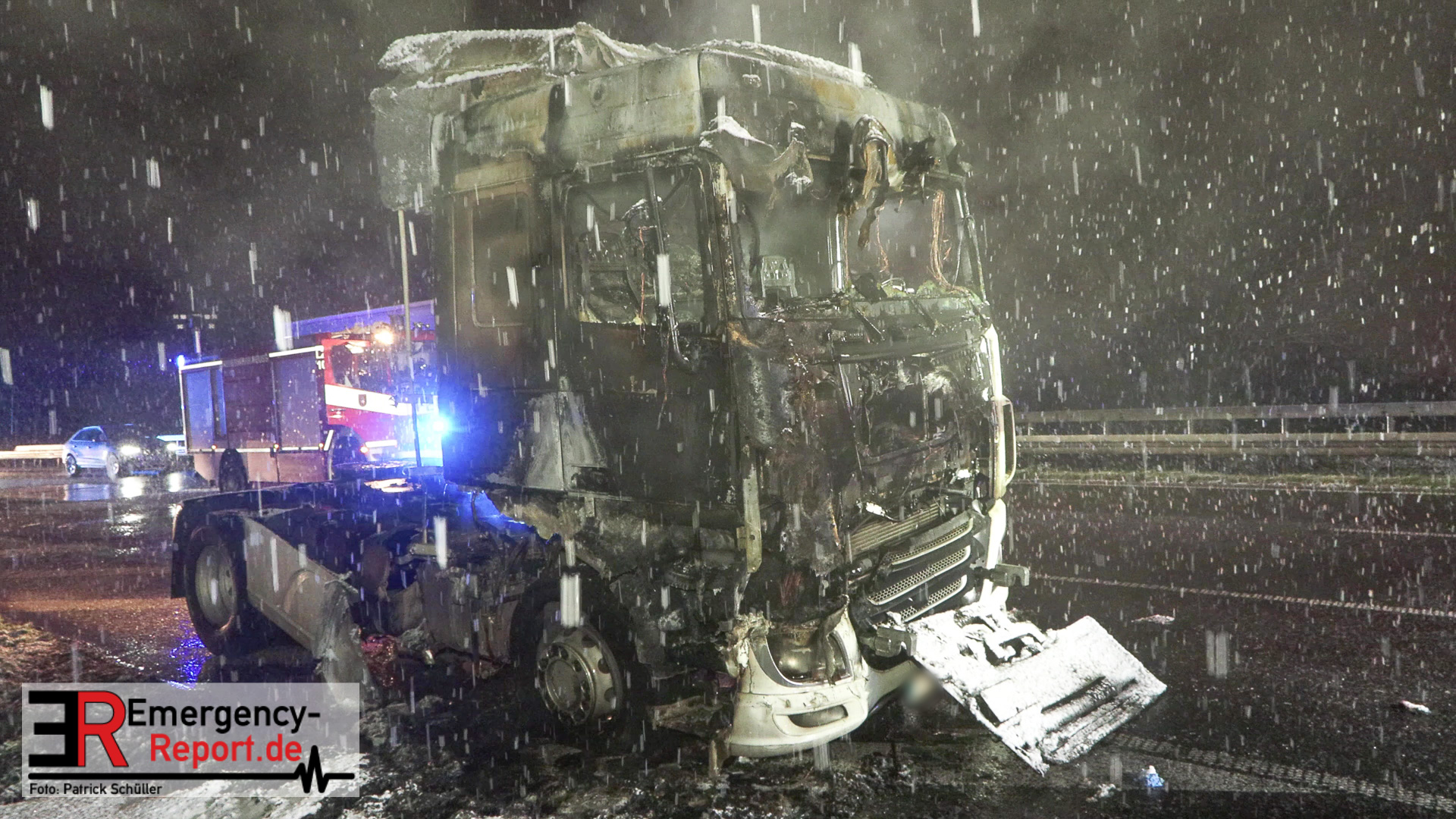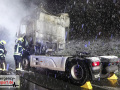 Der Fahrer des LKW bemerkte ebenso den Defekt seines Fahrzeuges und handelte geistesgegenwärtig, bevor schlimmeres passierte. Er stoppte seinen Sattelzug umgehend, kuppelte innerhalb kürzester Zeit den Auflieger von der bereits brennenden Zugmaschine ab und fuhr den Sattelschlepper mit letzter Maschinenkraft weg von dem Auflieger. Kurz danach ging die gesamte Zugmaschine in Flammen auf und stand innerhalb kürzester Zeit in Vollbrand. Der Sattelschlepper musste durch die eintreffende Feuerwehr gelöscht werden. Die Löschmaßnahmen zogen sich aufgrund immer wieder aufflackernder Glutnester über etwa eine Stunde.
