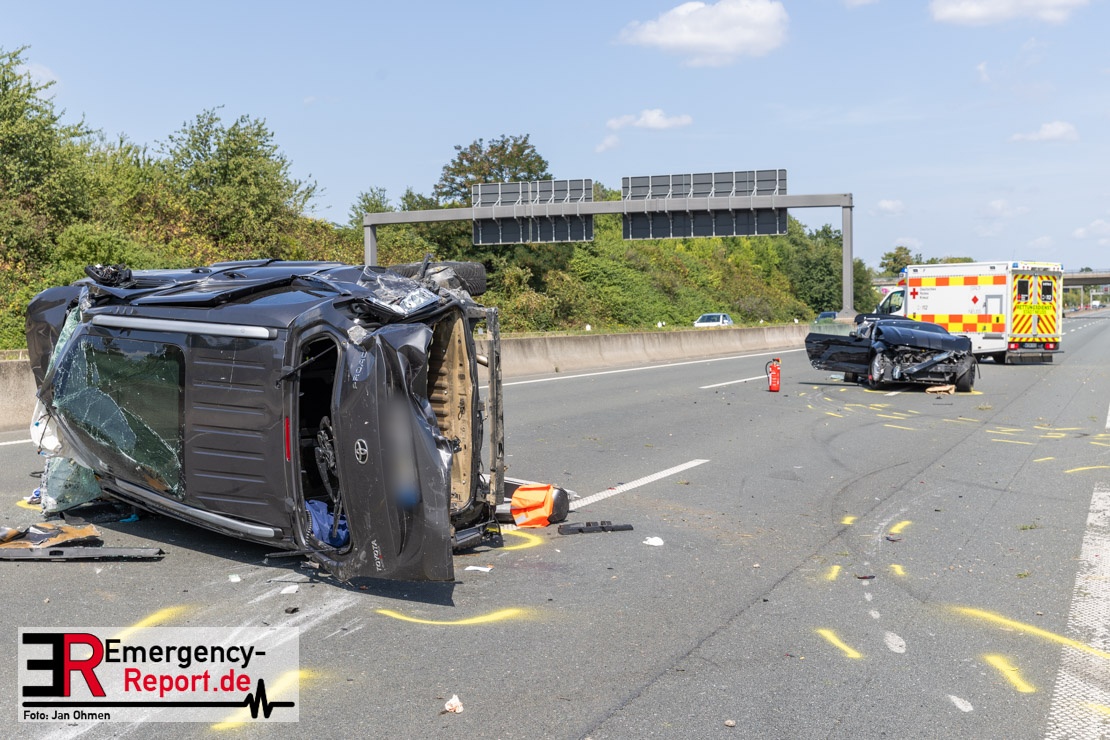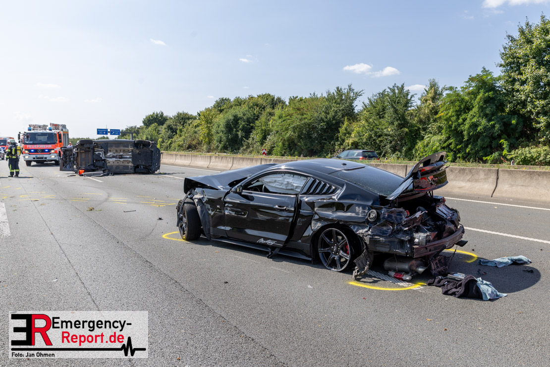 Den ersten Ermittlungen zufolge fuhr zunächst der Fahrer eines nicht näher bezeichneten PKW mit Warnblinklicht langsam auf dem rechten Fahrstreifen in Richtung Nimwegen. Die nachfolgende Fahrerin eines Wohnmobils wechselte, um nicht auf den vorausfahrenden PKW aufzufahren, vom rechten auf den mittleren Streifen. Eine 19-Jährigein einem Pkw Peugeot versuchte daraufhin ebenfalls nach links auszuweichen, bemerkte aber einen sehr schnell nachfolgenden Ford Mustang auf dem linken Fahrstreifen zu spät. Trotz eines leichten Ausweichmanövers in kollidierten der Peugeot und der Ford Mustang. Durch den Zusammenprall schleuderte der Ford Mustang gegen die linksseitige Betonschutzwand, wurde von hier aus auf den mittleren Fahrstreifen abgewiesen, um dort mit dem Toyota eines 65-Jährigen zu kollidieren. Durch die Wucht des Aufpralls schleuderten der Toyota und der Ford Mustang zunächst nach rechts gegen die Schutzplanken. Der Ford blieb entgegengesetzt auf dem mittleren Fahrstreifen stehen. Der Toyota schleuderte quer über die Fahrbahn, überschlug sich und blieb auf seiner linken Fahrzeugseite zum Liegen. Die Beifahrerin des 65-Jährigen musste von der Feuerwehr aus dem Fahrzeugwrack des Toyotas befreit werden und kam mit einem Rettungswagen zur stationären Behandlung in ein Krankenhaus. Der 65-Jährige und ein weiterer Insasse kamen zur ambulanten Behandlung in eine Klinik. Die Fahrerin des Ford Mustang wurde ebenfalls leicht verletzt. Ein mitfahrender Hund aus dem Mustang sprang auf die Fahrbahn, konnte jedoch durch die Führerin des Wohnmobils mit Unterstützung weiterer Verkehrsteilnehmer wieder eingefangen werden. Die Fahrerin des Wohnmobils entfernte sich danach unerlaubt von der Unfallstelle. Während der Bergungs- und Rettungsarbeiten sowie der Landung des Rettungshubschraubers blieb die Richtungsfahrbahn Nimwegen für gut eine Stunde gesperrt. Der Verkehr wurde dabei auf die A 52 abgeleitet. Für die Unfallaufnahme und die Reinigung der Fahrbahn blieben der rechte und der mittlere Fahrstreifen bis gegen 15:00 Uhr gesperrt. Der Verkehr staute sich zeitweilig bis zu sechs Kilometer zurück. Der Sachschaden wird auf 60.000 Euro geschätzt. Die Ermittlungen zur Unfallursache dauern an.