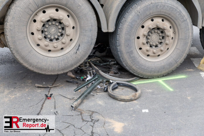 Beim Eintreffen der ersten Einsatzkräfte war die schwer verletzte Radfahrerin unter dem Anhänger des Lkw sowie ihrem Fahrrad eingeklemmt. Der Rettungsdienst leitete umgehend die medizinische Erstversorgung ein, während die Feuerwehr hydraulisches Rettungsgerät einsetzte, um die Frau schonend zu befreien.
