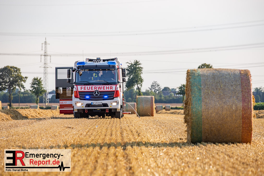Eine brennende Strohballenpresse sorgte am Montag, den 13.07.2020 gegen 18:50 Uhr für einen Einsatz der Feuerwehr auf einem Stoppelfeld am „Gohrer Berg“ zwischen Neuss-Hoisten und Grevenbroich. Bei Eintreffen der Einsatzkräfte brannten bereits ca. 1000m2 Stoppelfeld, sowie die Strohballenpresse in voller Ausdehnung. Aufgrund der Trockenheit war mit einer weiteren Ausbreitung auf weitere Areale des Feldes zu rechnen. Durch einen kräfteintensiven Einsatz der Löschzüge Hoisten, Rosellen und Holzheim sowie des hauptamtlichen Löschzuges mit insgesamt 40 Einsatzkräften, konnte die Presse abgelöscht und eine weitere Ausbreitung des Feldbrandes verhindert werden.