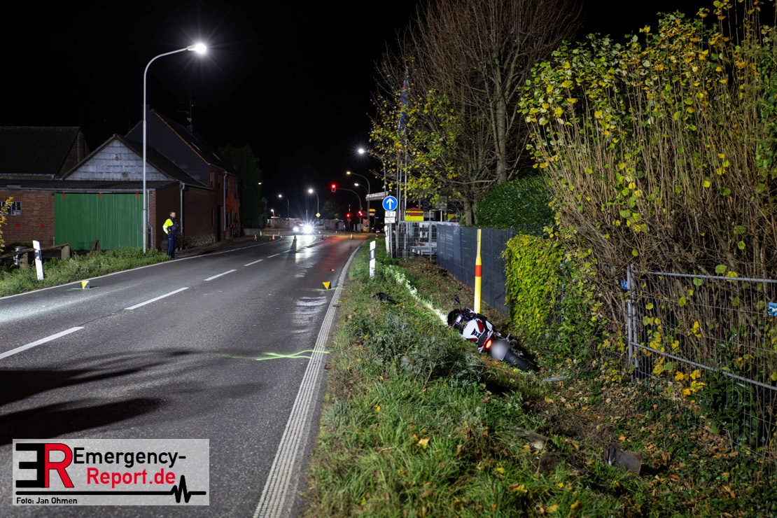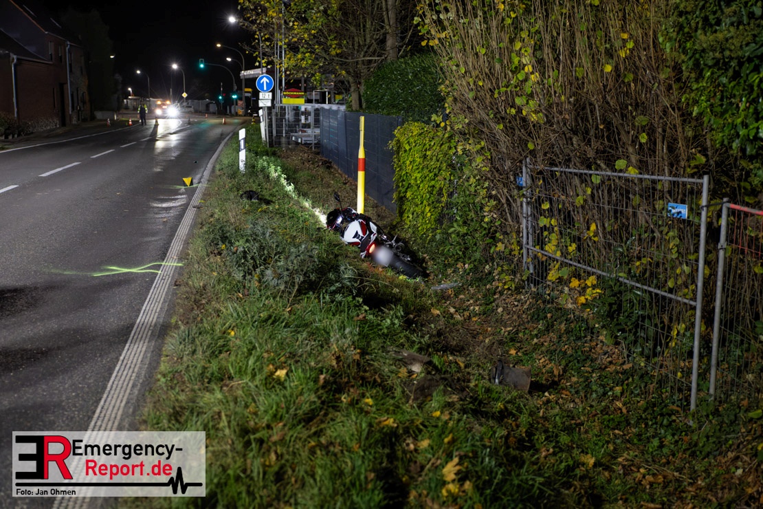 Nach Angaben von Zeugen war der Motorradfahrer in Fahrtrichtung Kloster Langwaden unterwegs, als er etwa 100 Meter vor der Kreuzung Jägerhof das Vorderrad anhob und nur auf dem Hinterrad fuhr. Bei diesem sogenannten Wheelie verlor der Fahrer die Kontrolle über das Motorrad und kam nach rechts von der Fahrbahn ab in einem Straßengraben.