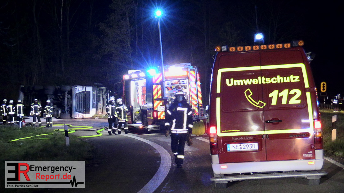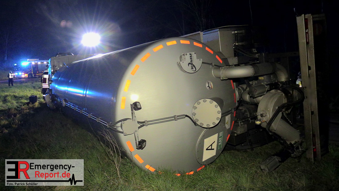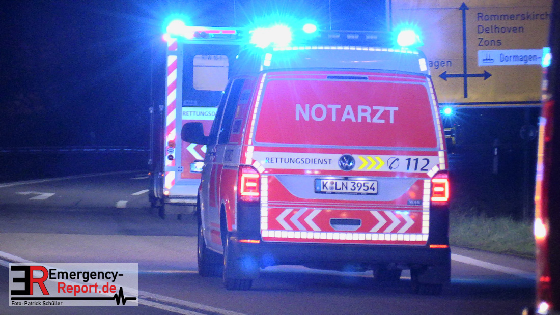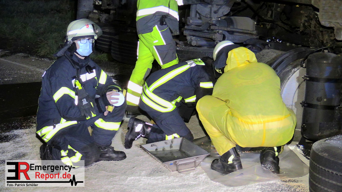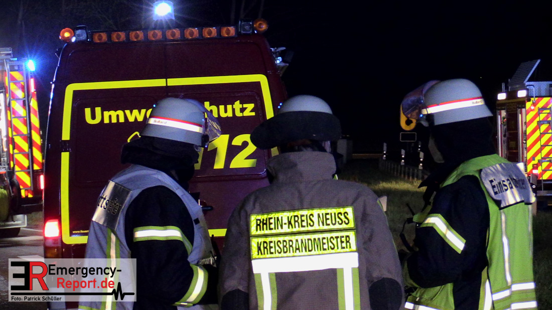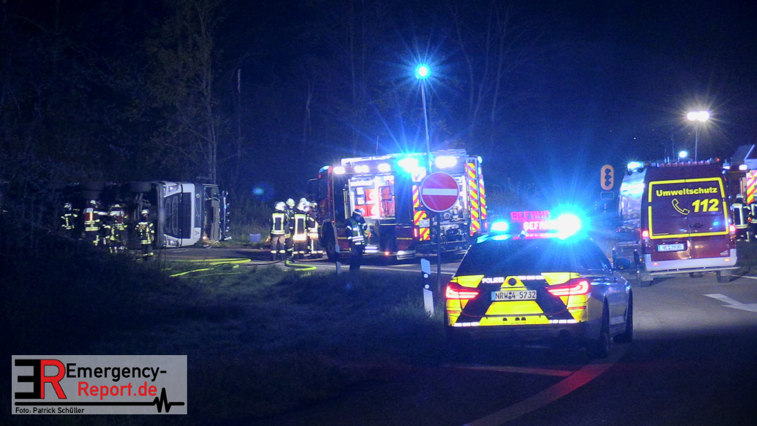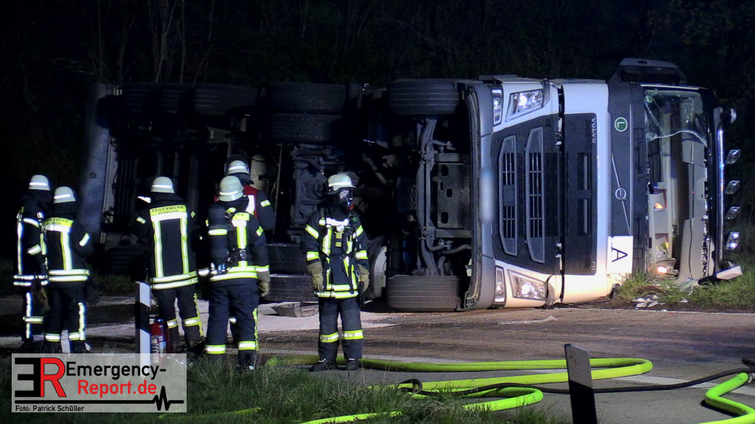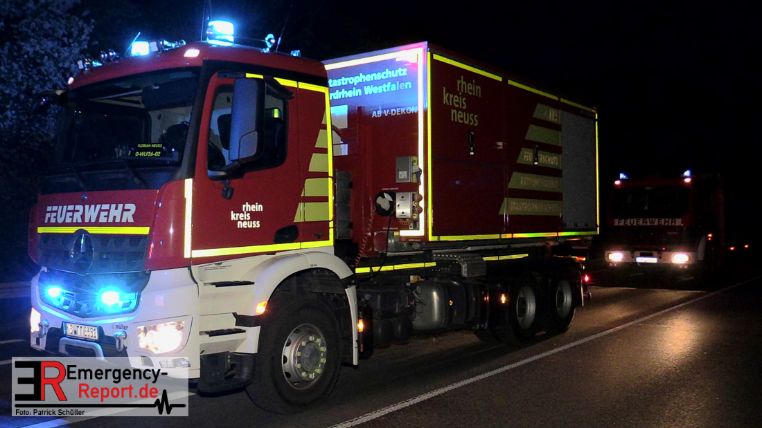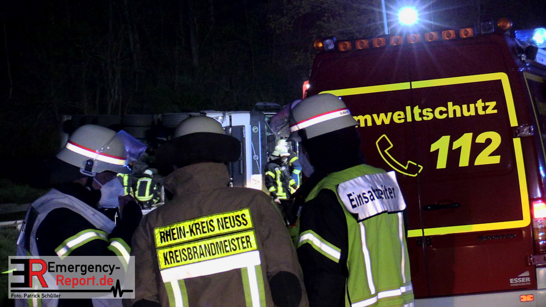 In der Nacht zum Donnerstag (15.04.2021) ereignete sich gegen 3:40 Uhr ein Verkehrsunfall. Ein Sattelzug mit Siloauflieger befuhr die BAB 57 in Richtung Neuss. Beim Verlassen der Autobahn sind Zugmaschine und Auflieger in der Abfahrt Dormagen von der Fahrbahn abgekommen und umgestürzt. Da beim Notruf weder die Örtlichkeit noch das Ereignis klar waren, wurden jeweils Rettungsdienst und Feuerwehreinheiten aus Dormagen und Köln entsandt. Bei Eintreffen an der Einsatzstelle wurde festgestellt, dass der Fahrer verletzt und im Fahrerhaus eingeschlossen war. Betriebsmittel (Diesel- und Hydrauliköl) liefen aus den Fahrzeugen aus. Es kam zu einem geringen Produktaustritt aus dem Sattelauflieger. Während sich ein Teil der eingesetzten Kräfte um die Menschenrettung kümmerte, wurden von anderen Einheiten der Brandschutz sichergestellt, die Einsatzstelle ausgeleuchtet und abgesichert, sowie die auslaufenden Medien eingedämmt. Weitere Erkundungen ergaben, dass es sich bei der Ladung nicht um Gefahrgut, sondern um gekochte Speiseabfälle handelt. Der Fahrer konnte zügig aus dem Fahrzeug befreit und einem Krankenhaus zugeführt werden. Zur Beurteilung einer Grundwassergefährdung wurde die Untere Wasserbehörde (Rhein-Kreis Neuss) an die Einsatzstelle gerufen. Im weiteren Verlauf wird der Inhalt des Aufliegers in ein Ersatzfahrzeug umgepumpt. Dann kann mit der Bergung des verunfallten Fahrzeuges begonnen werden. Zurzeit geht die Polizei davon aus, dass die Abfahrt Dormagen noch bis in den Donnerstagnachmittag hinein gesperrt bleiben muss.
