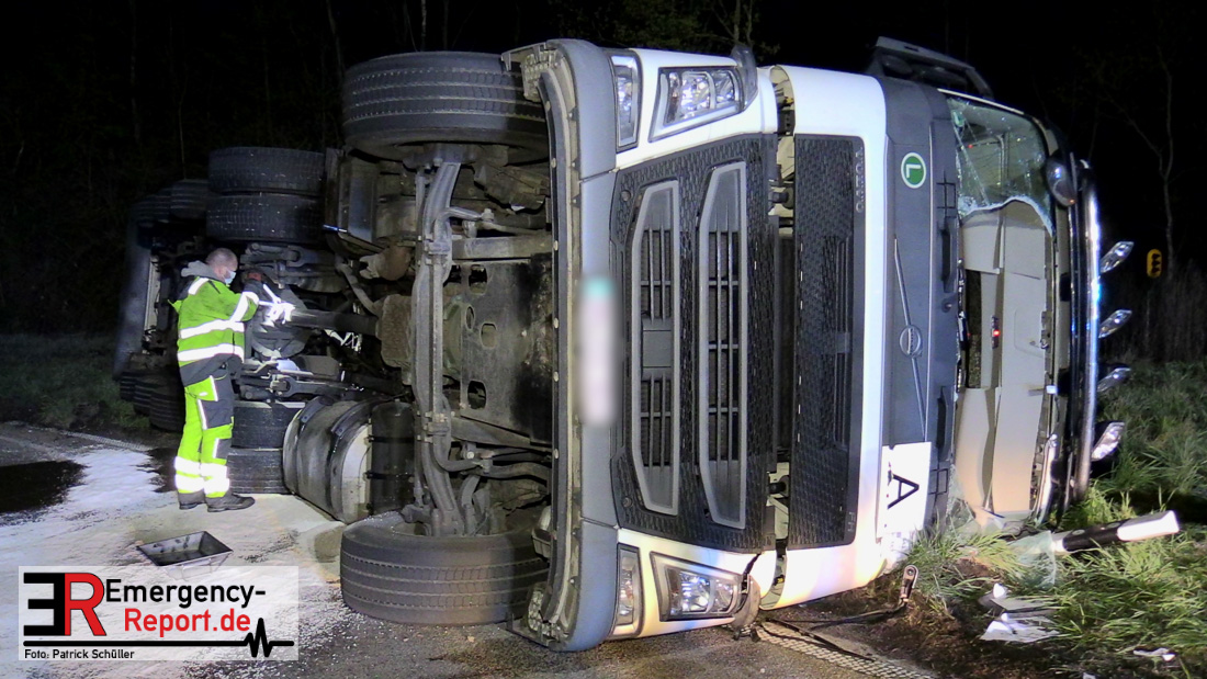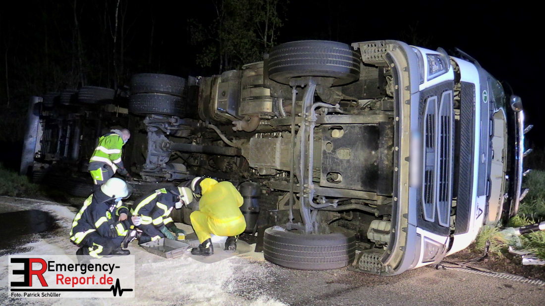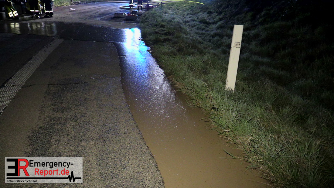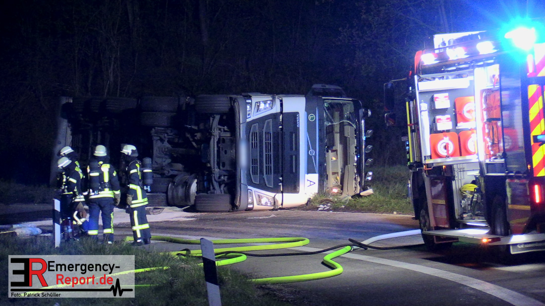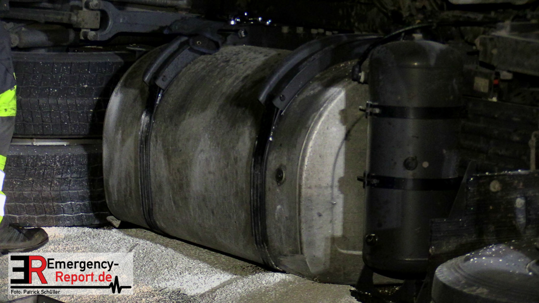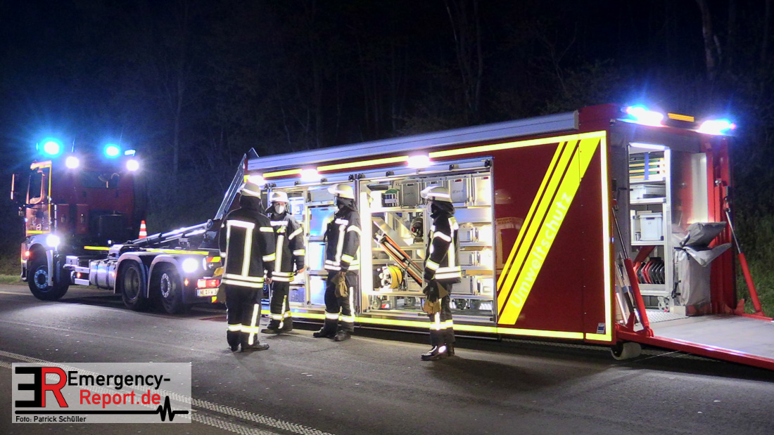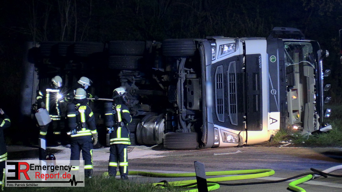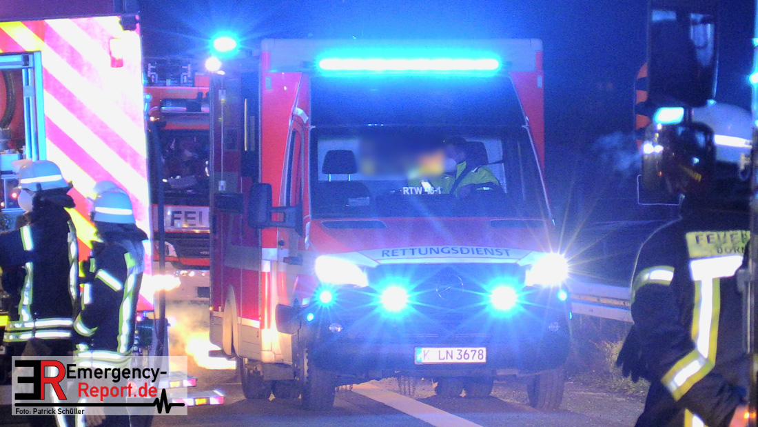In der Nacht zum Donnerstag (15.04.2021) ereignete sich gegen 3:40 Uhr ein Verkehrsunfall. Ein Sattelzug mit Siloauflieger befuhr die BAB 57 in Richtung Neuss. Beim Verlassen der Autobahn sind Zugmaschine und Auflieger in der Abfahrt Dormagen von der Fahrbahn abgekommen und umgestürzt. Da beim Notruf weder die Örtlichkeit noch das Ereignis klar waren, wurden jeweils Rettungsdienst und Feuerwehreinheiten aus Dormagen und Köln entsandt. Bei Eintreffen an der Einsatzstelle wurde festgestellt, dass der Fahrer verletzt und im Fahrerhaus eingeschlossen war. Betriebsmittel (Diesel- und Hydrauliköl) liefen aus den Fahrzeugen aus. Es kam zu einem geringen Produktaustritt aus dem Sattelauflieger. Während sich ein Teil der eingesetzten Kräfte um die Menschenrettung kümmerte, wurden von anderen Einheiten der Brandschutz sichergestellt, die Einsatzstelle ausgeleuchtet und abgesichert, sowie die auslaufenden Medien eingedämmt. Weitere Erkundungen ergaben, dass es sich bei der Ladung nicht um Gefahrgut, sondern um gekochte Speiseabfälle handelt. Der Fahrer konnte zügig aus dem Fahrzeug befreit und einem Krankenhaus zugeführt werden. Zur Beurteilung einer Grundwassergefährdung wurde die Untere Wasserbehörde (Rhein-Kreis Neuss) an die Einsatzstelle gerufen. Im weiteren Verlauf wird der Inhalt des Aufliegers in ein Ersatzfahrzeug umgepumpt. Dann kann mit der Bergung des verunfallten Fahrzeuges begonnen werden. Zurzeit geht die Polizei davon aus, dass die Abfahrt Dormagen noch bis in den Donnerstagnachmittag hinein gesperrt bleiben muss.