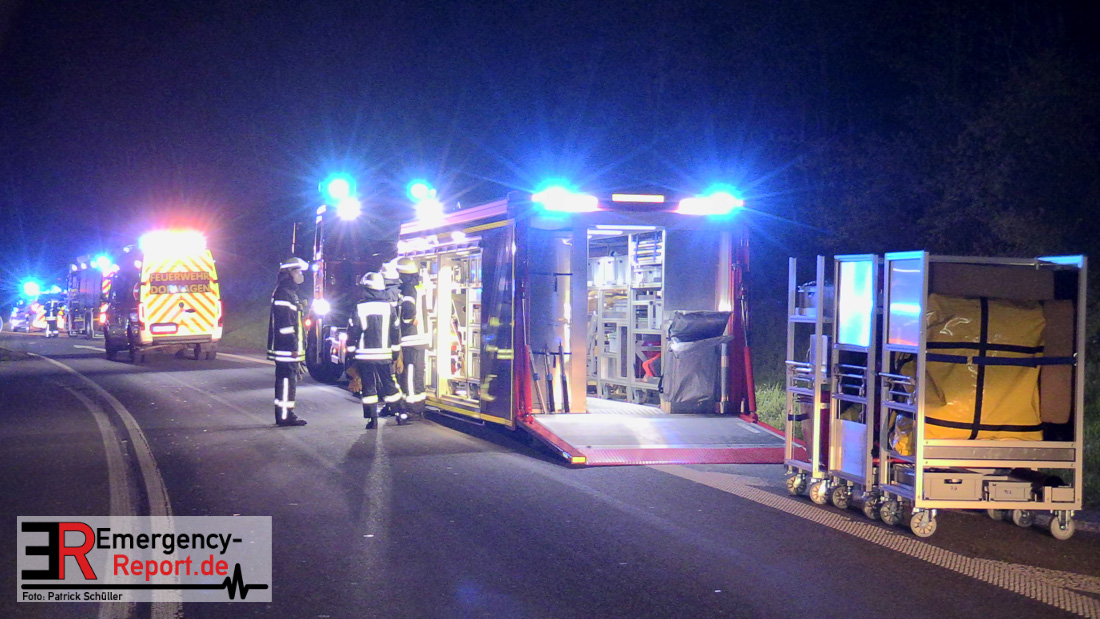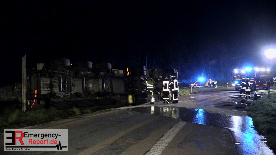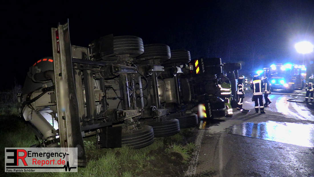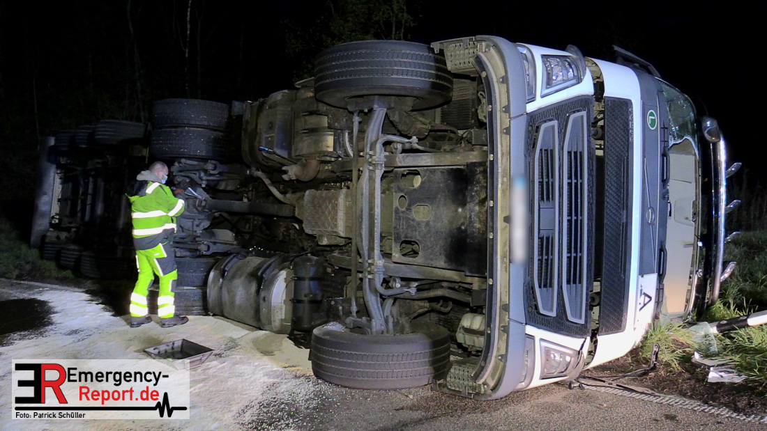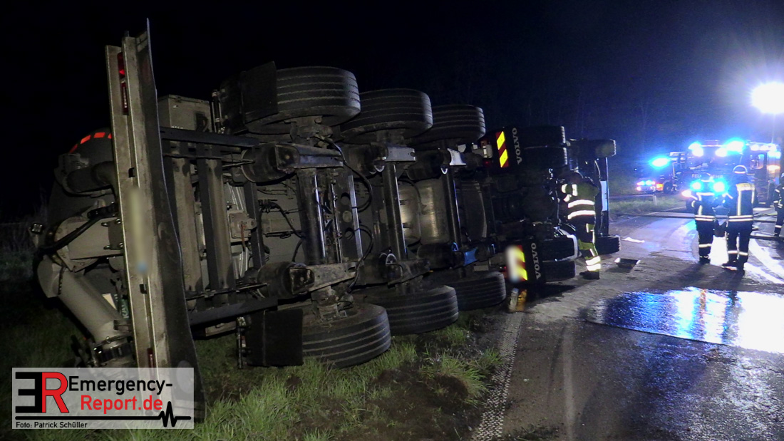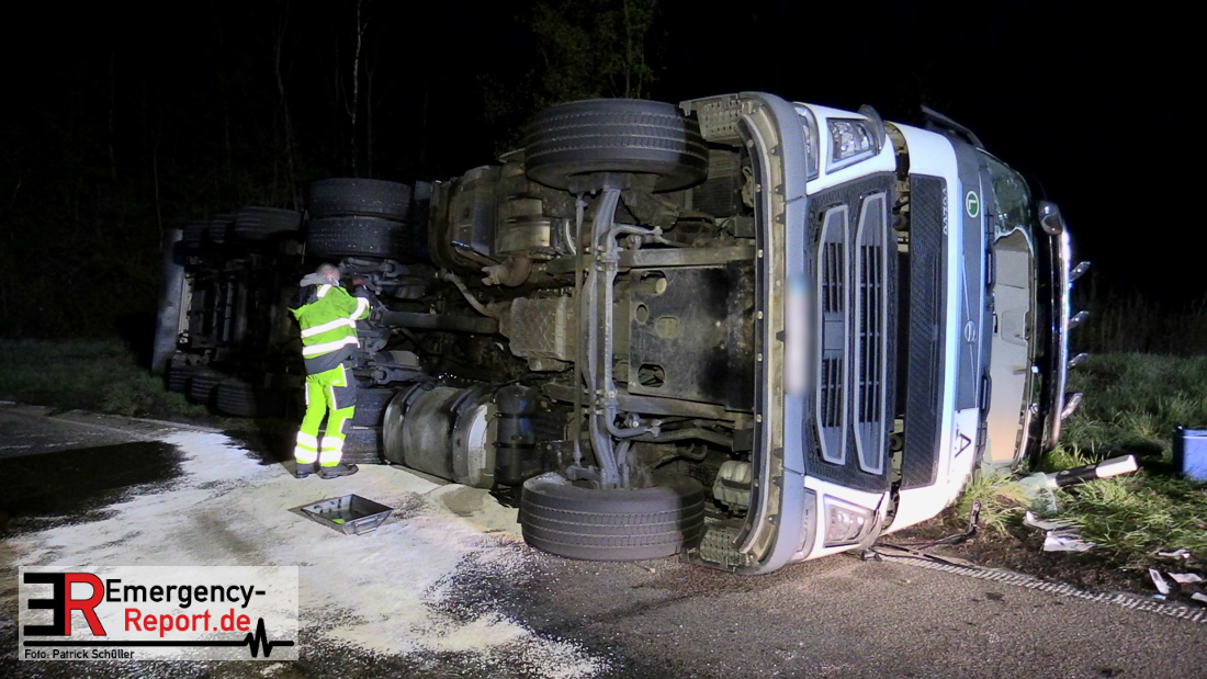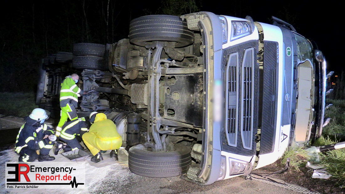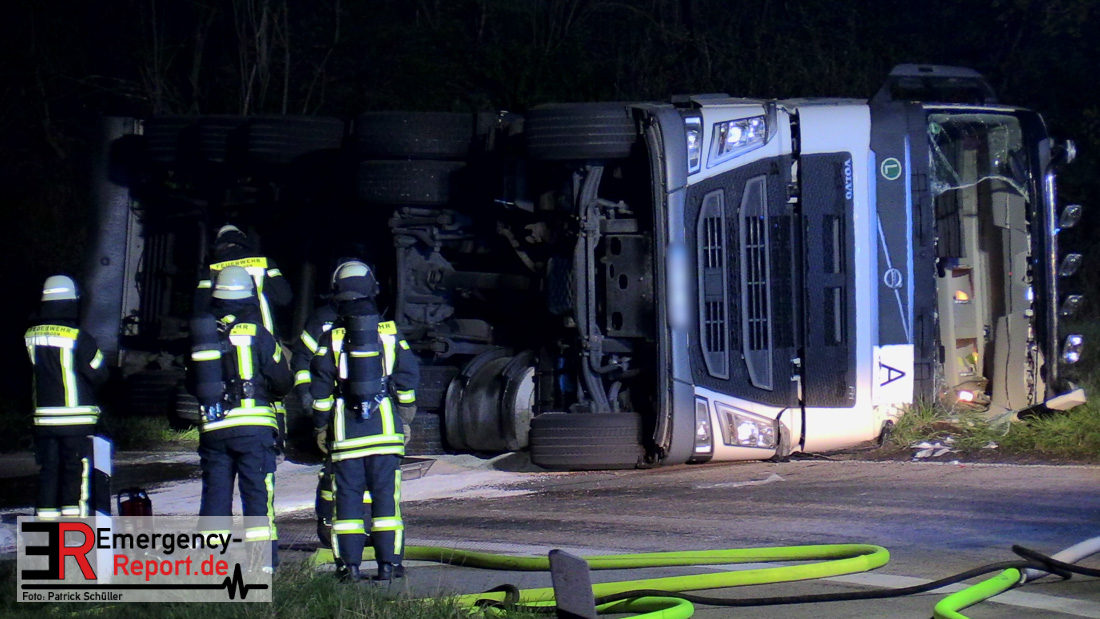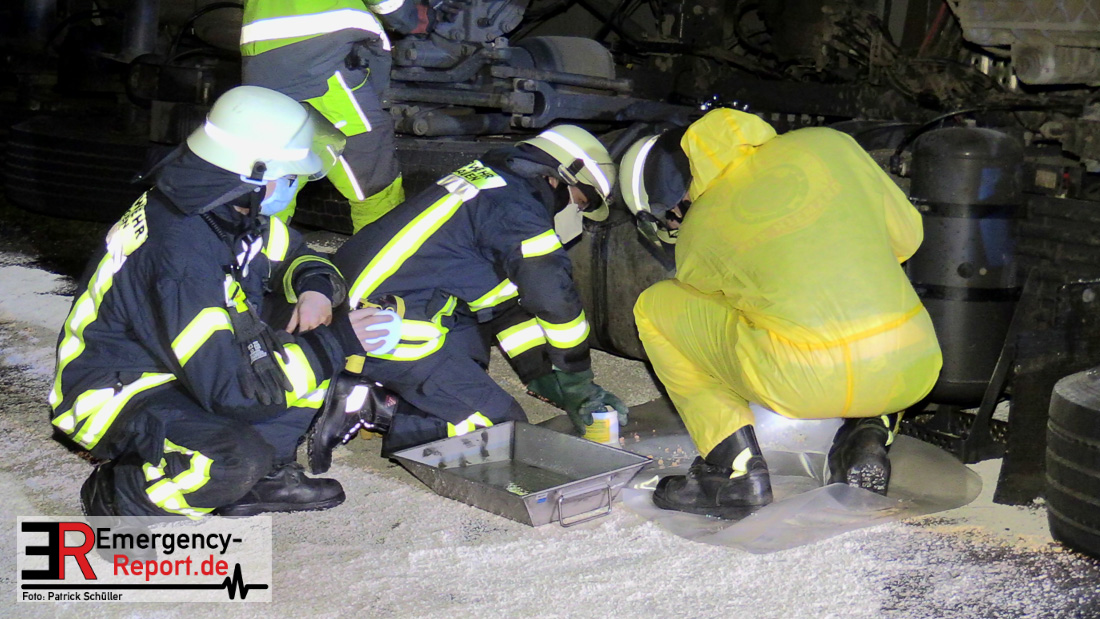 In der Nacht zum Donnerstag (15.04.2021) ereignete sich gegen 3:40 Uhr ein Verkehrsunfall. Ein Sattelzug mit Siloauflieger befuhr die BAB 57 in Richtung Neuss. Beim Verlassen der Autobahn sind Zugmaschine und Auflieger in der Abfahrt Dormagen von der Fahrbahn abgekommen und umgestürzt. Da beim Notruf weder die Örtlichkeit noch das Ereignis klar waren, wurden jeweils Rettungsdienst und Feuerwehreinheiten aus Dormagen und Köln entsandt. Bei Eintreffen an der Einsatzstelle wurde festgestellt, dass der Fahrer verletzt und im Fahrerhaus eingeschlossen war. Betriebsmittel (Diesel- und Hydrauliköl) liefen aus den Fahrzeugen aus. Es kam zu einem geringen Produktaustritt aus dem Sattelauflieger. Während sich ein Teil der eingesetzten Kräfte um die Menschenrettung kümmerte, wurden von anderen Einheiten der Brandschutz sichergestellt, die Einsatzstelle ausgeleuchtet und abgesichert, sowie die auslaufenden Medien eingedämmt. Weitere Erkundungen ergaben, dass es sich bei der Ladung nicht um Gefahrgut, sondern um gekochte Speiseabfälle handelt. Der Fahrer konnte zügig aus dem Fahrzeug befreit und einem Krankenhaus zugeführt werden. Zur Beurteilung einer Grundwassergefährdung wurde die Untere Wasserbehörde (Rhein-Kreis Neuss) an die Einsatzstelle gerufen. Im weiteren Verlauf wird der Inhalt des Aufliegers in ein Ersatzfahrzeug umgepumpt. Dann kann mit der Bergung des verunfallten Fahrzeuges begonnen werden. Zurzeit geht die Polizei davon aus, dass die Abfahrt Dormagen noch bis in den Donnerstagnachmittag hinein gesperrt bleiben muss.