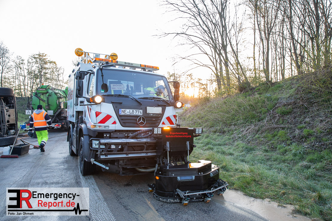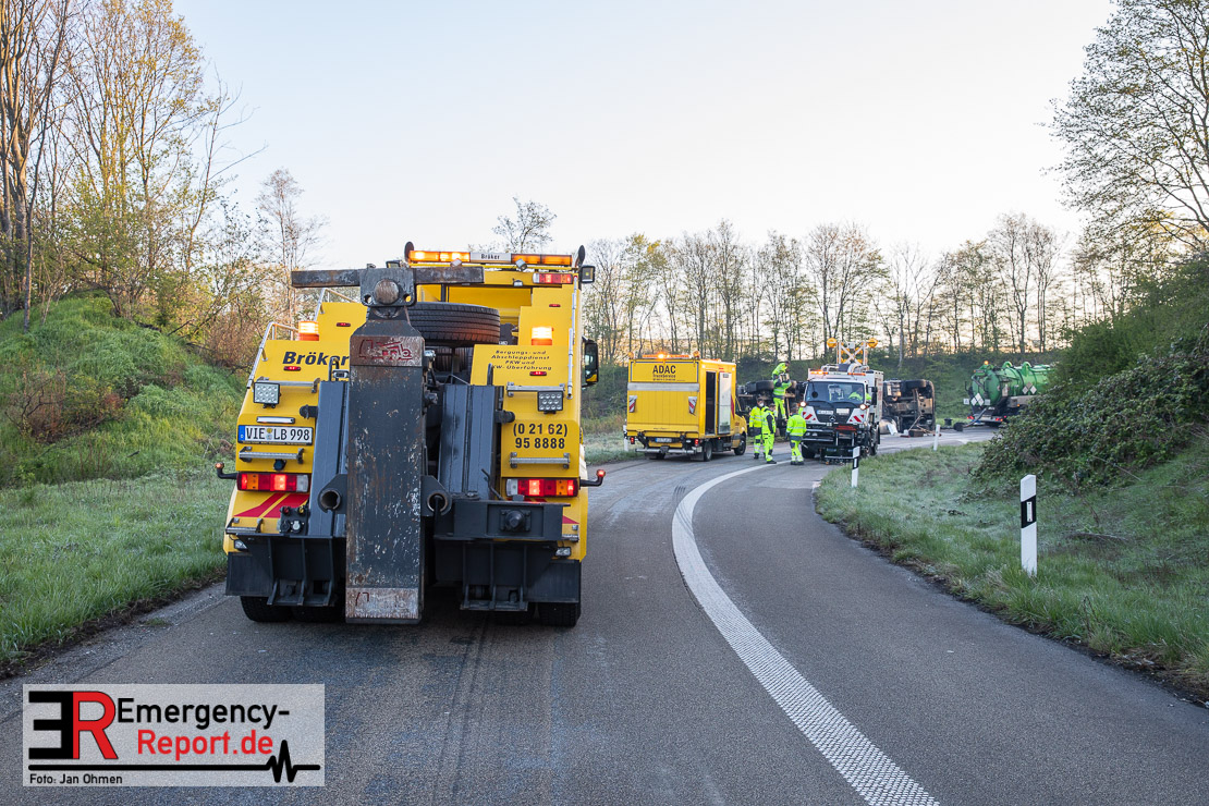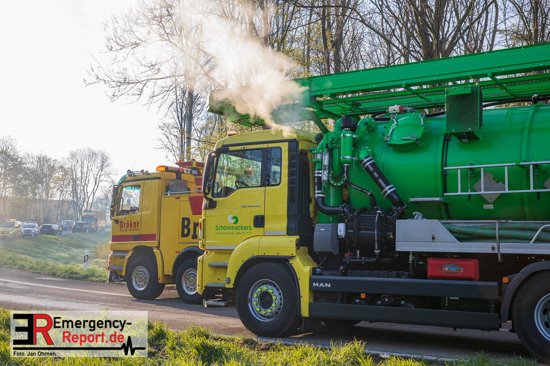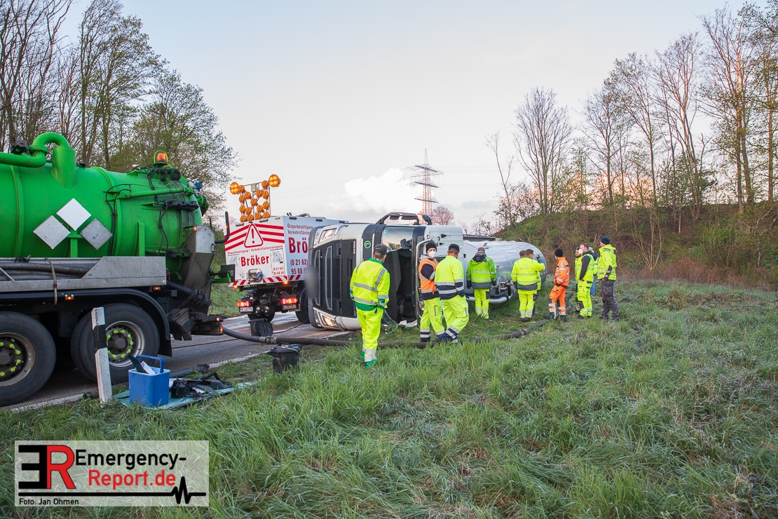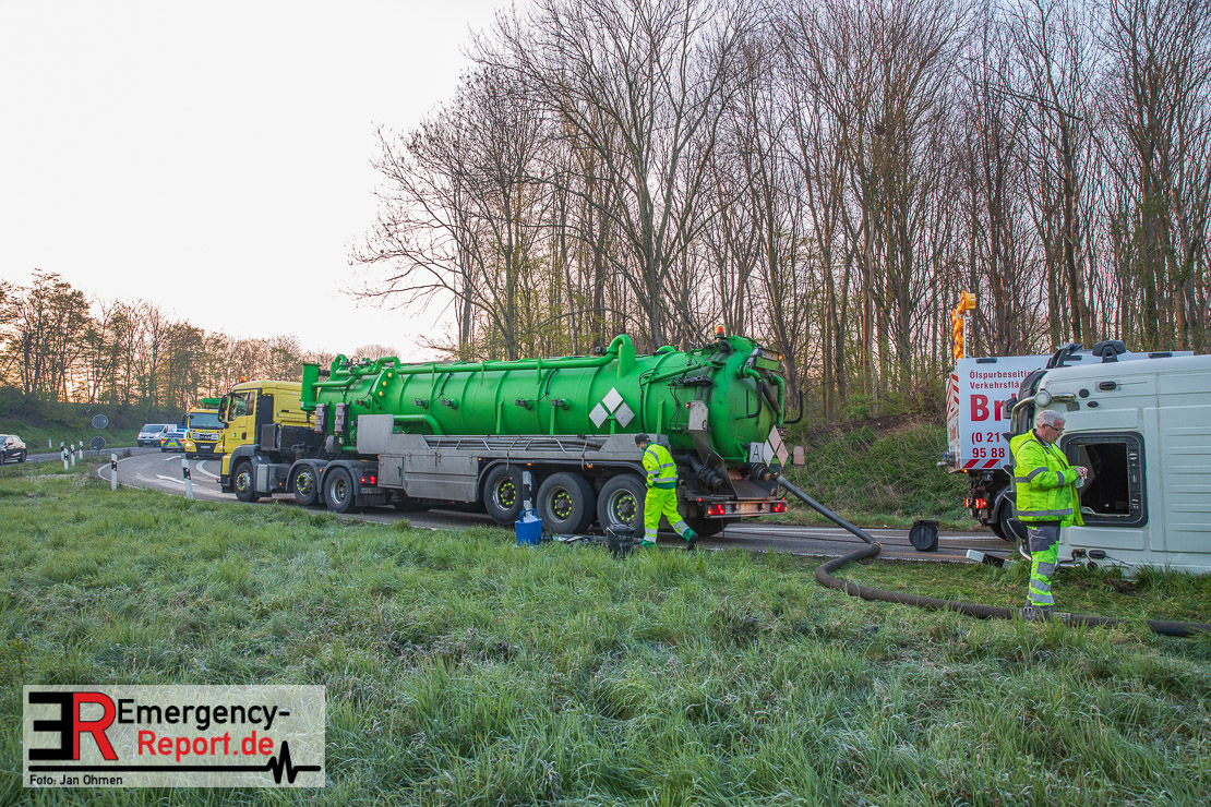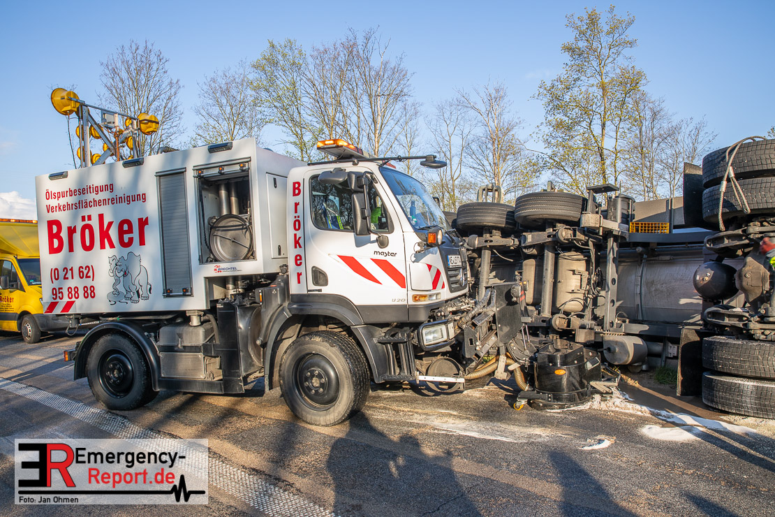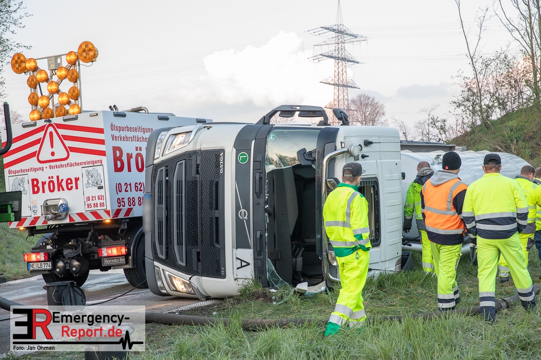 In der Nacht zum Donnerstag (15.04.2021) ereignete sich gegen 3:40 Uhr ein Verkehrsunfall. Ein Sattelzug mit Siloauflieger befuhr die BAB 57 in Richtung Neuss. Beim Verlassen der Autobahn sind Zugmaschine und Auflieger in der Abfahrt Dormagen von der Fahrbahn abgekommen und umgestürzt. Da beim Notruf weder die Örtlichkeit noch das Ereignis klar waren, wurden jeweils Rettungsdienst und Feuerwehreinheiten aus Dormagen und Köln entsandt. Bei Eintreffen an der Einsatzstelle wurde festgestellt, dass der Fahrer verletzt und im Fahrerhaus eingeschlossen war. Betriebsmittel (Diesel- und Hydrauliköl) liefen aus den Fahrzeugen aus. Es kam zu einem geringen Produktaustritt aus dem Sattelauflieger. Während sich ein Teil der eingesetzten Kräfte um die Menschenrettung kümmerte, wurden von anderen Einheiten der Brandschutz sichergestellt, die Einsatzstelle ausgeleuchtet und abgesichert, sowie die auslaufenden Medien eingedämmt. Weitere Erkundungen ergaben, dass es sich bei der Ladung nicht um Gefahrgut, sondern um gekochte Speiseabfälle handelt. Der Fahrer konnte zügig aus dem Fahrzeug befreit und einem Krankenhaus zugeführt werden. Zur Beurteilung einer Grundwassergefährdung wurde die Untere Wasserbehörde (Rhein-Kreis Neuss) an die Einsatzstelle gerufen. Im weiteren Verlauf wird der Inhalt des Aufliegers in ein Ersatzfahrzeug umgepumpt. Dann kann mit der Bergung des verunfallten Fahrzeuges begonnen werden. Zurzeit geht die Polizei davon aus, dass die Abfahrt Dormagen noch bis in den Donnerstagnachmittag hinein gesperrt bleiben muss.