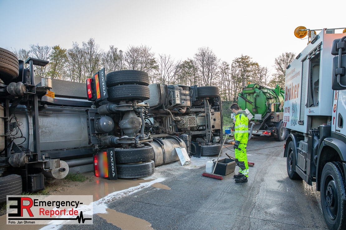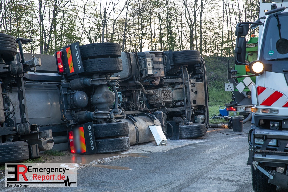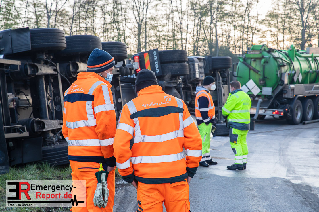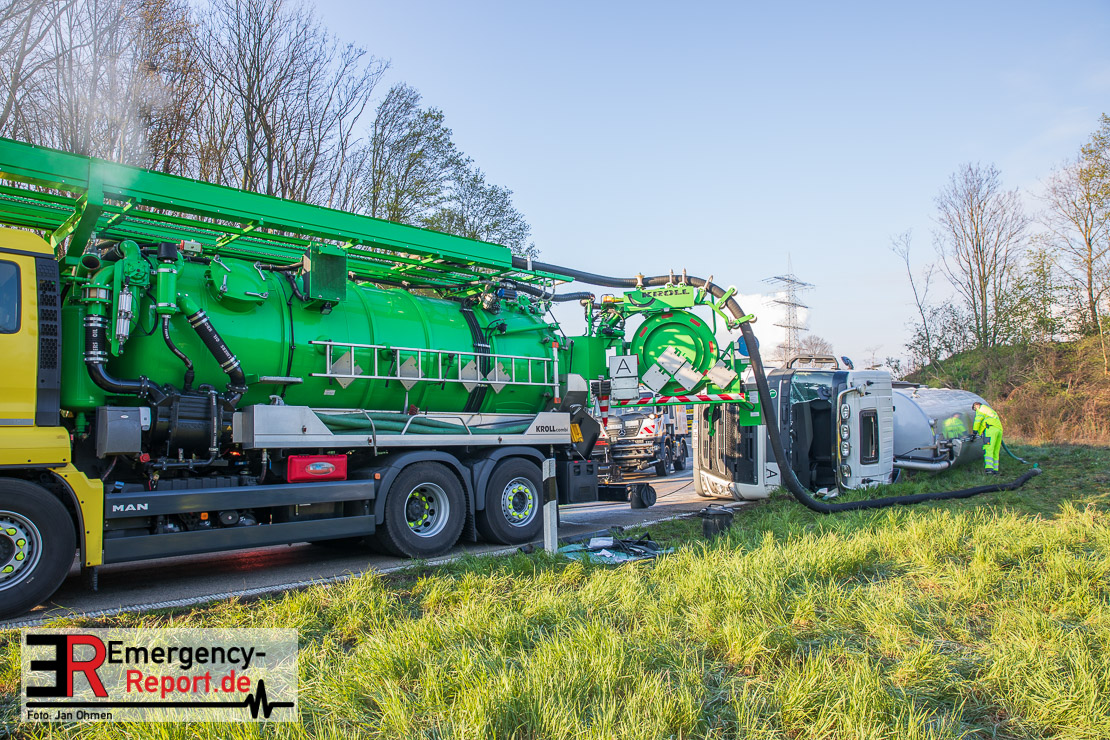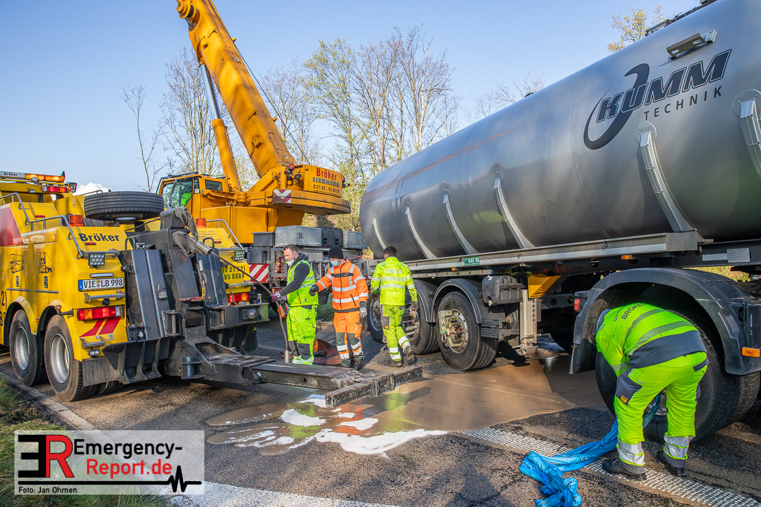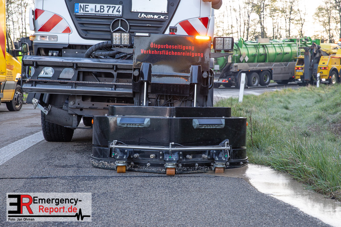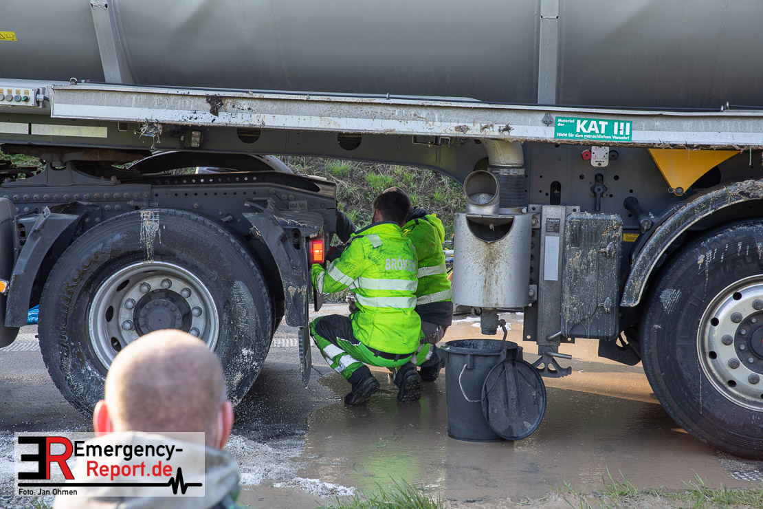 In der Nacht zum Donnerstag (15.04.2021) ereignete sich gegen 3:40 Uhr ein Verkehrsunfall. Ein Sattelzug mit Siloauflieger befuhr die BAB 57 in Richtung Neuss. Beim Verlassen der Autobahn sind Zugmaschine und Auflieger in der Abfahrt Dormagen von der Fahrbahn abgekommen und umgestürzt. Da beim Notruf weder die Örtlichkeit noch das Ereignis klar waren, wurden jeweils Rettungsdienst und Feuerwehreinheiten aus Dormagen und Köln entsandt. Bei Eintreffen an der Einsatzstelle wurde festgestellt, dass der Fahrer verletzt und im Fahrerhaus eingeschlossen war. Betriebsmittel (Diesel- und Hydrauliköl) liefen aus den Fahrzeugen aus. Es kam zu einem geringen Produktaustritt aus dem Sattelauflieger. Während sich ein Teil der eingesetzten Kräfte um die Menschenrettung kümmerte, wurden von anderen Einheiten der Brandschutz sichergestellt, die Einsatzstelle ausgeleuchtet und abgesichert, sowie die auslaufenden Medien eingedämmt. Weitere Erkundungen ergaben, dass es sich bei der Ladung nicht um Gefahrgut, sondern um gekochte Speiseabfälle handelt. Der Fahrer konnte zügig aus dem Fahrzeug befreit und einem Krankenhaus zugeführt werden. Zur Beurteilung einer Grundwassergefährdung wurde die Untere Wasserbehörde (Rhein-Kreis Neuss) an die Einsatzstelle gerufen. Im weiteren Verlauf wird der Inhalt des Aufliegers in ein Ersatzfahrzeug umgepumpt. Dann kann mit der Bergung des verunfallten Fahrzeuges begonnen werden. Zurzeit geht die Polizei davon aus, dass die Abfahrt Dormagen noch bis in den Donnerstagnachmittag hinein gesperrt bleiben muss.