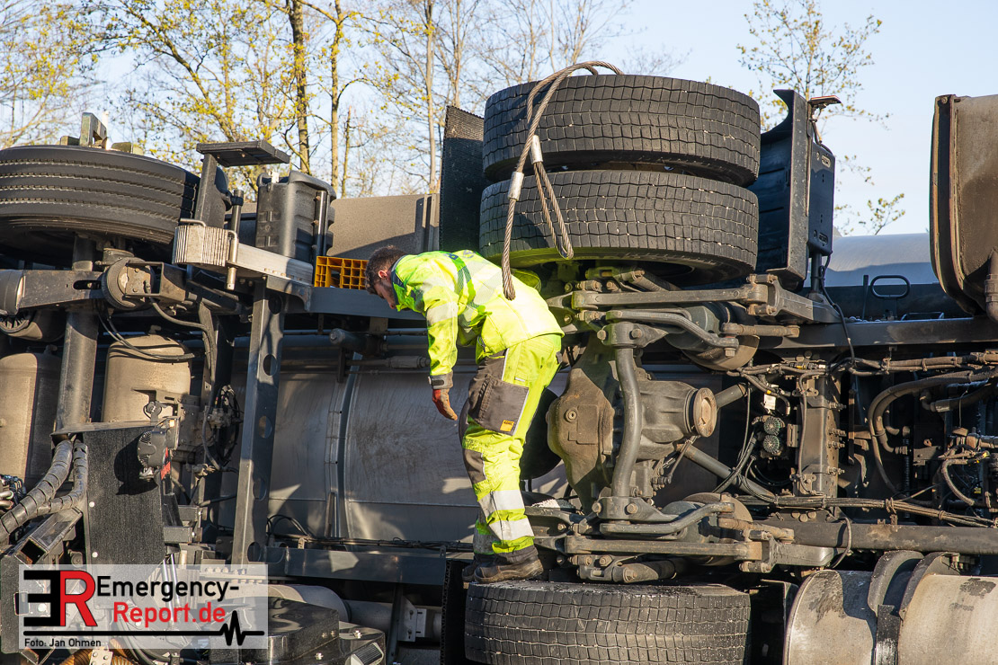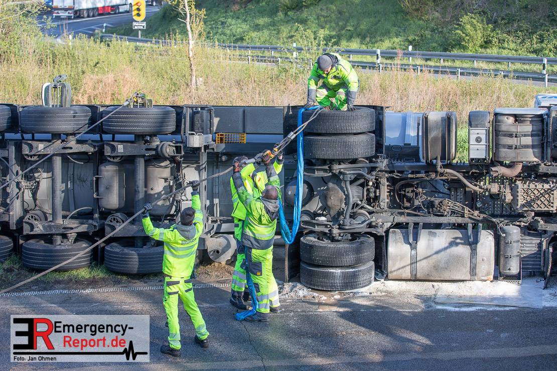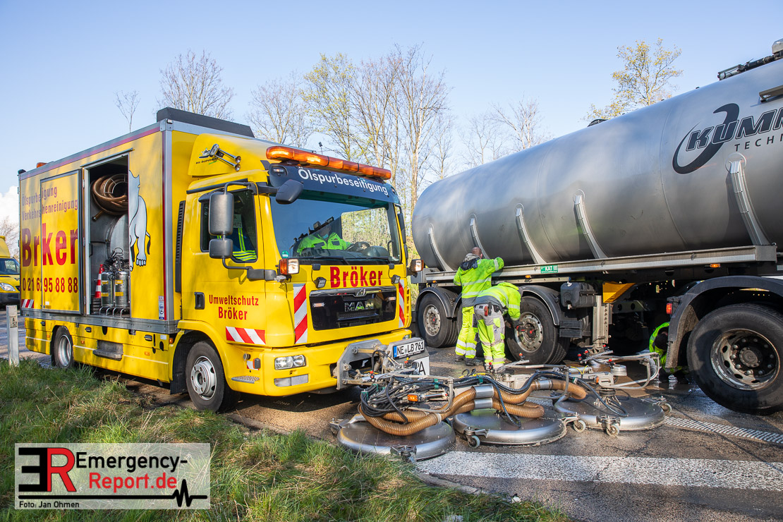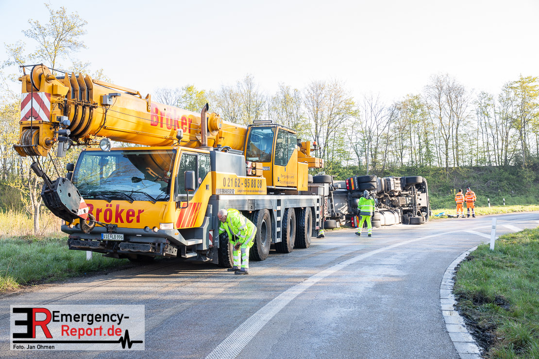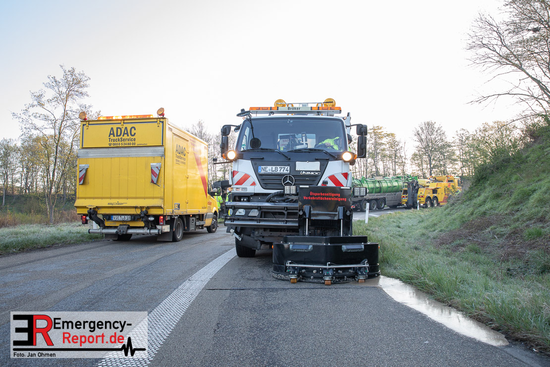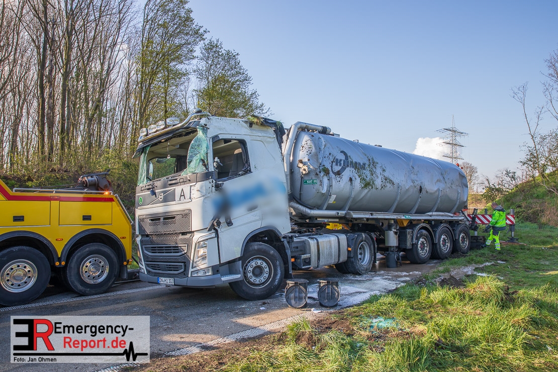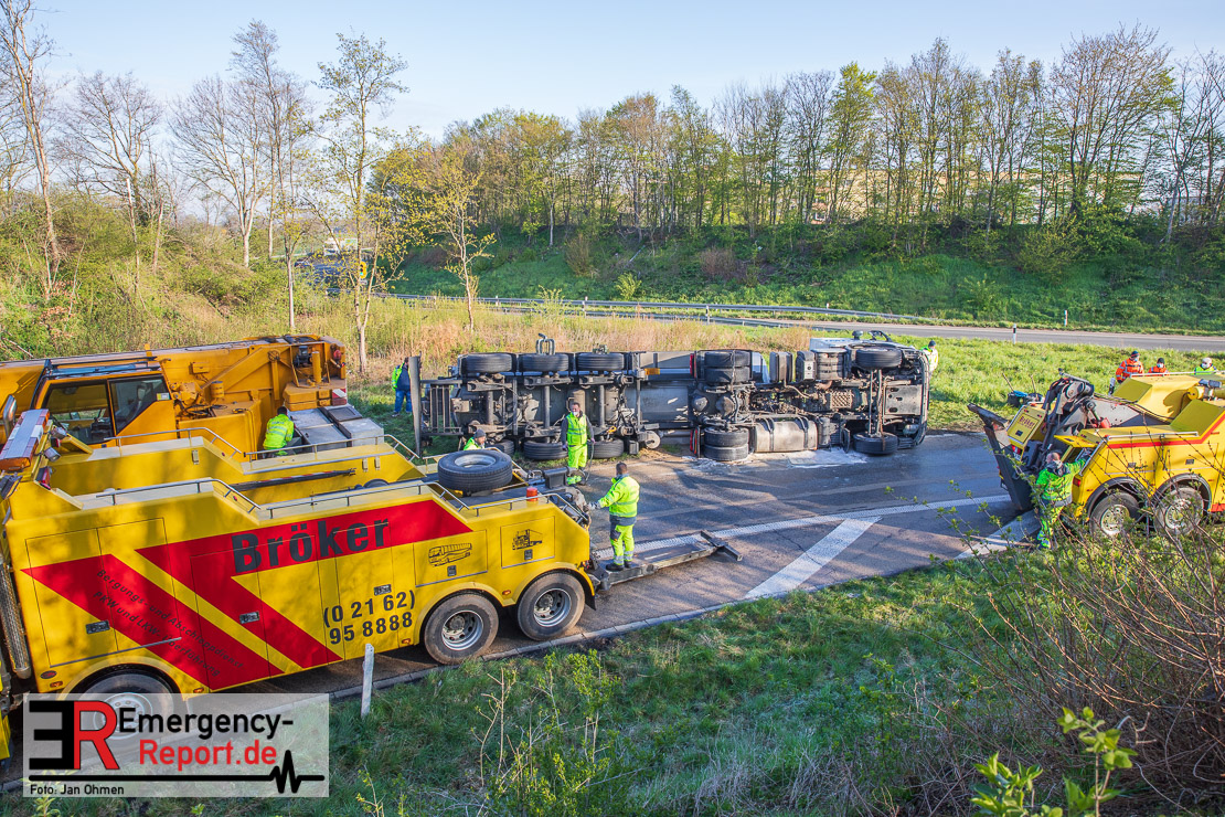 In der Nacht zum Donnerstag (15.04.2021) ereignete sich gegen 3:40 Uhr ein Verkehrsunfall. Ein Sattelzug mit Siloauflieger befuhr die BAB 57 in Richtung Neuss. Beim Verlassen der Autobahn sind Zugmaschine und Auflieger in der Abfahrt Dormagen von der Fahrbahn abgekommen und umgestürzt. Da beim Notruf weder die Örtlichkeit noch das Ereignis klar waren, wurden jeweils Rettungsdienst und Feuerwehreinheiten aus Dormagen und Köln entsandt. Bei Eintreffen an der Einsatzstelle wurde festgestellt, dass der Fahrer verletzt und im Fahrerhaus eingeschlossen war. Betriebsmittel (Diesel- und Hydrauliköl) liefen aus den Fahrzeugen aus. Es kam zu einem geringen Produktaustritt aus dem Sattelauflieger. Während sich ein Teil der eingesetzten Kräfte um die Menschenrettung kümmerte, wurden von anderen Einheiten der Brandschutz sichergestellt, die Einsatzstelle ausgeleuchtet und abgesichert, sowie die auslaufenden Medien eingedämmt. Weitere Erkundungen ergaben, dass es sich bei der Ladung nicht um Gefahrgut, sondern um gekochte Speiseabfälle handelt. Der Fahrer konnte zügig aus dem Fahrzeug befreit und einem Krankenhaus zugeführt werden. Zur Beurteilung einer Grundwassergefährdung wurde die Untere Wasserbehörde (Rhein-Kreis Neuss) an die Einsatzstelle gerufen. Im weiteren Verlauf wird der Inhalt des Aufliegers in ein Ersatzfahrzeug umgepumpt. Dann kann mit der Bergung des verunfallten Fahrzeuges begonnen werden. Zurzeit geht die Polizei davon aus, dass die Abfahrt Dormagen noch bis in den Donnerstagnachmittag hinein gesperrt bleiben muss.