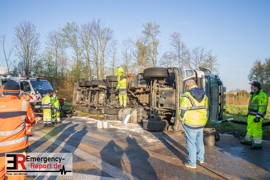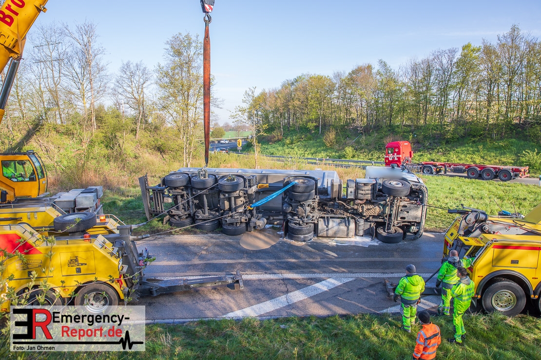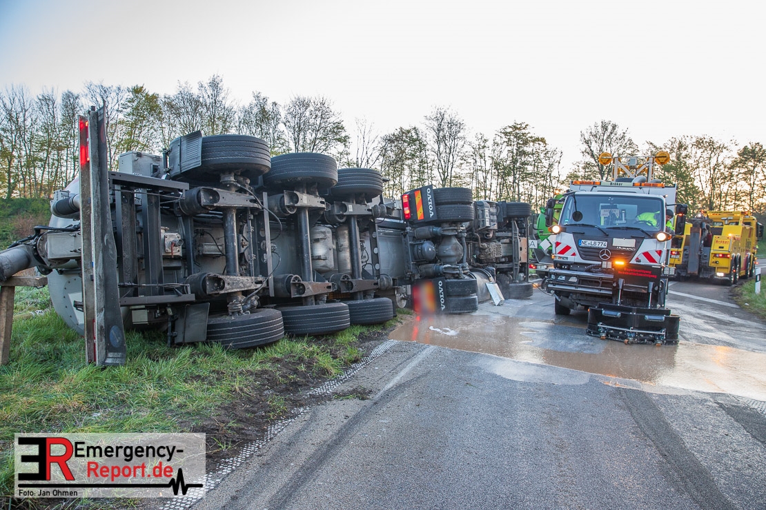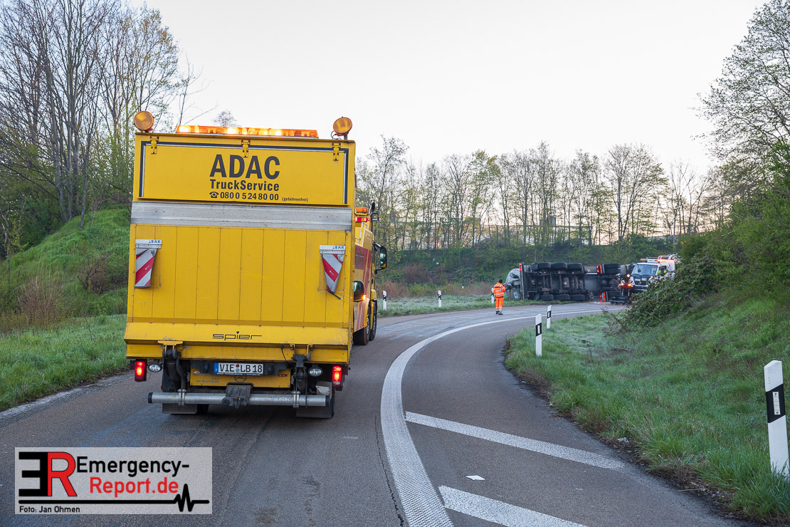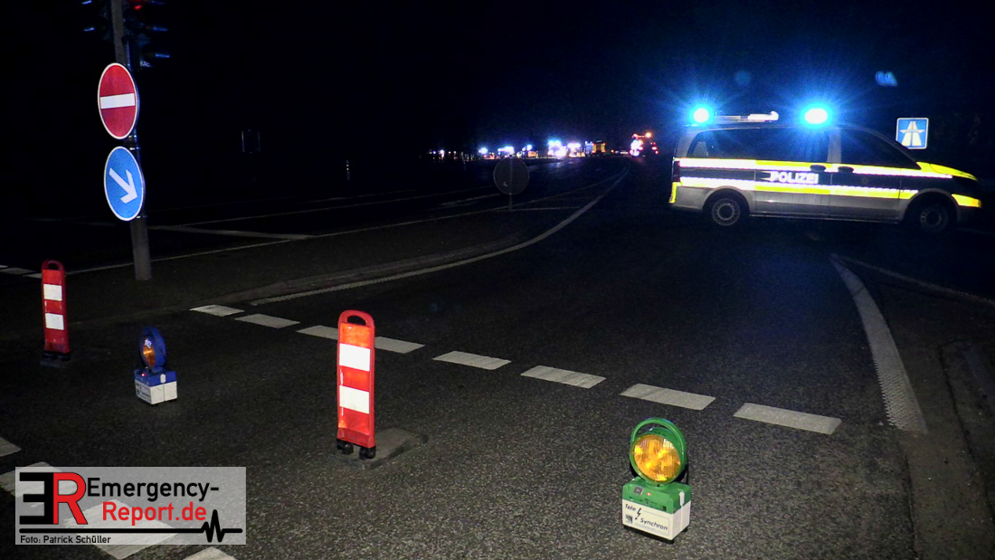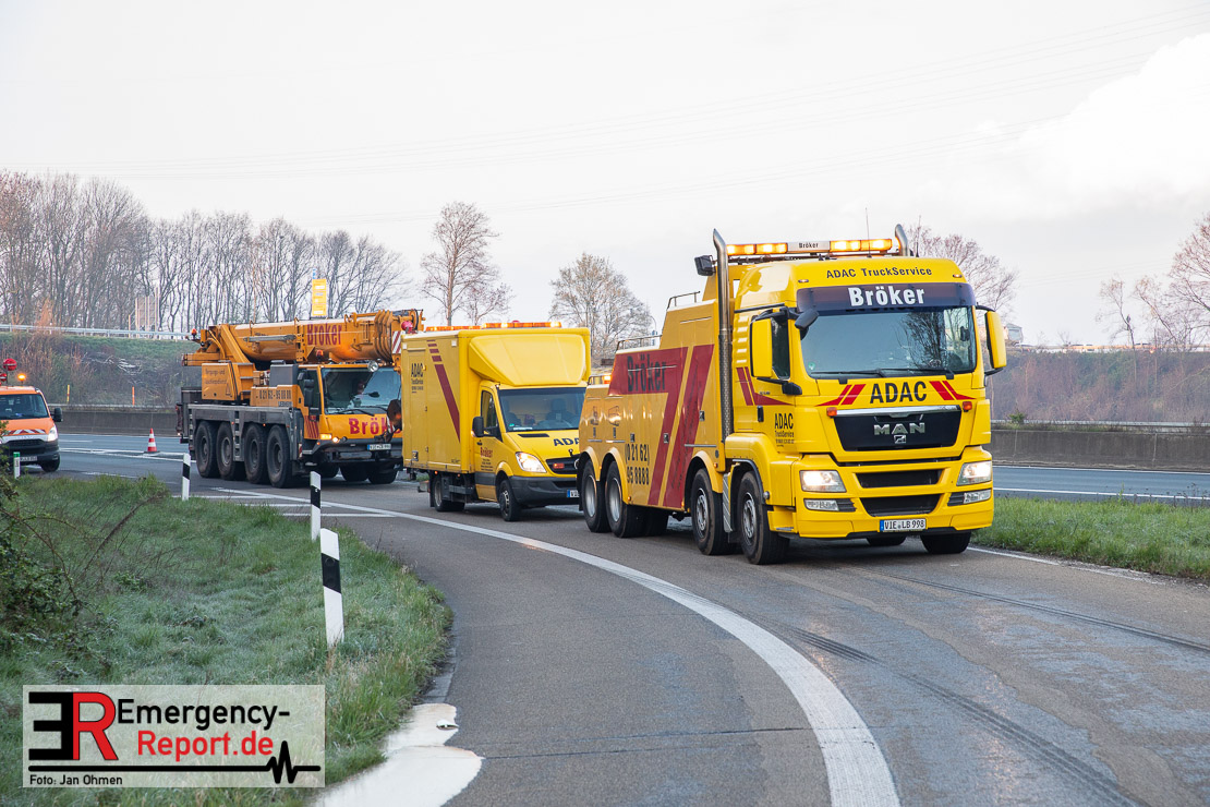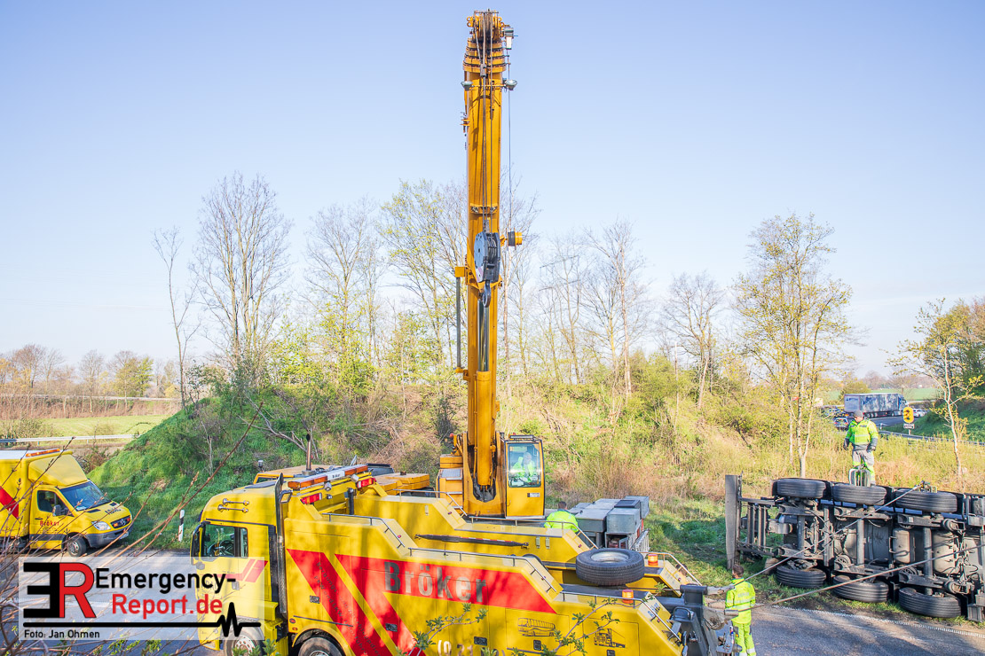 In der Nacht zum Donnerstag (15.04.2021) ereignete sich gegen 3:40 Uhr ein Verkehrsunfall. Ein Sattelzug mit Siloauflieger befuhr die BAB 57 in Richtung Neuss. Beim Verlassen der Autobahn sind Zugmaschine und Auflieger in der Abfahrt Dormagen von der Fahrbahn abgekommen und umgestürzt. Da beim Notruf weder die Örtlichkeit noch das Ereignis klar waren, wurden jeweils Rettungsdienst und Feuerwehreinheiten aus Dormagen und Köln entsandt. Bei Eintreffen an der Einsatzstelle wurde festgestellt, dass der Fahrer verletzt und im Fahrerhaus eingeschlossen war. Betriebsmittel (Diesel- und Hydrauliköl) liefen aus den Fahrzeugen aus. Es kam zu einem geringen Produktaustritt aus dem Sattelauflieger. Während sich ein Teil der eingesetzten Kräfte um die Menschenrettung kümmerte, wurden von anderen Einheiten der Brandschutz sichergestellt, die Einsatzstelle ausgeleuchtet und abgesichert, sowie die auslaufenden Medien eingedämmt. Weitere Erkundungen ergaben, dass es sich bei der Ladung nicht um Gefahrgut, sondern um gekochte Speiseabfälle handelt. Der Fahrer konnte zügig aus dem Fahrzeug befreit und einem Krankenhaus zugeführt werden. Zur Beurteilung einer Grundwassergefährdung wurde die Untere Wasserbehörde (Rhein-Kreis Neuss) an die Einsatzstelle gerufen. Im weiteren Verlauf wird der Inhalt des Aufliegers in ein Ersatzfahrzeug umgepumpt. Dann kann mit der Bergung des verunfallten Fahrzeuges begonnen werden. Zurzeit geht die Polizei davon aus, dass die Abfahrt Dormagen noch bis in den Donnerstagnachmittag hinein gesperrt bleiben muss.