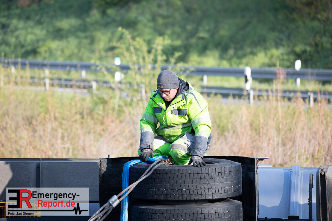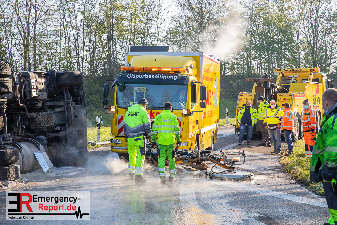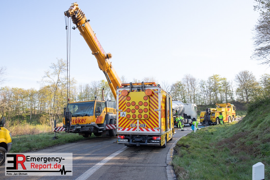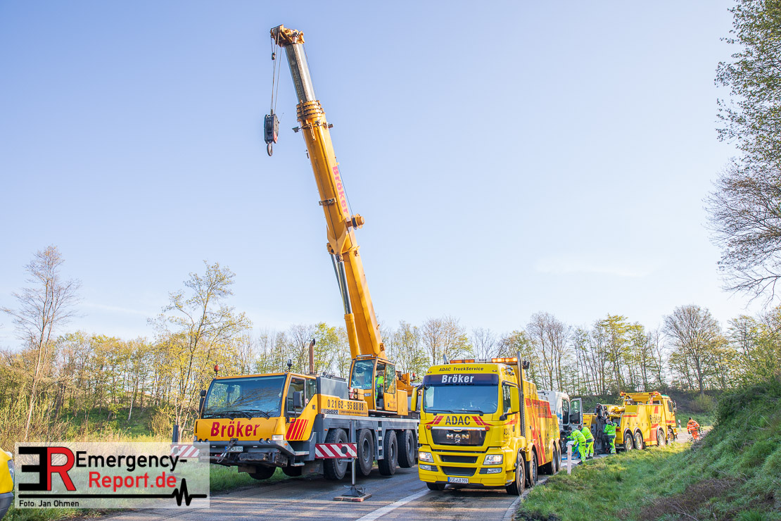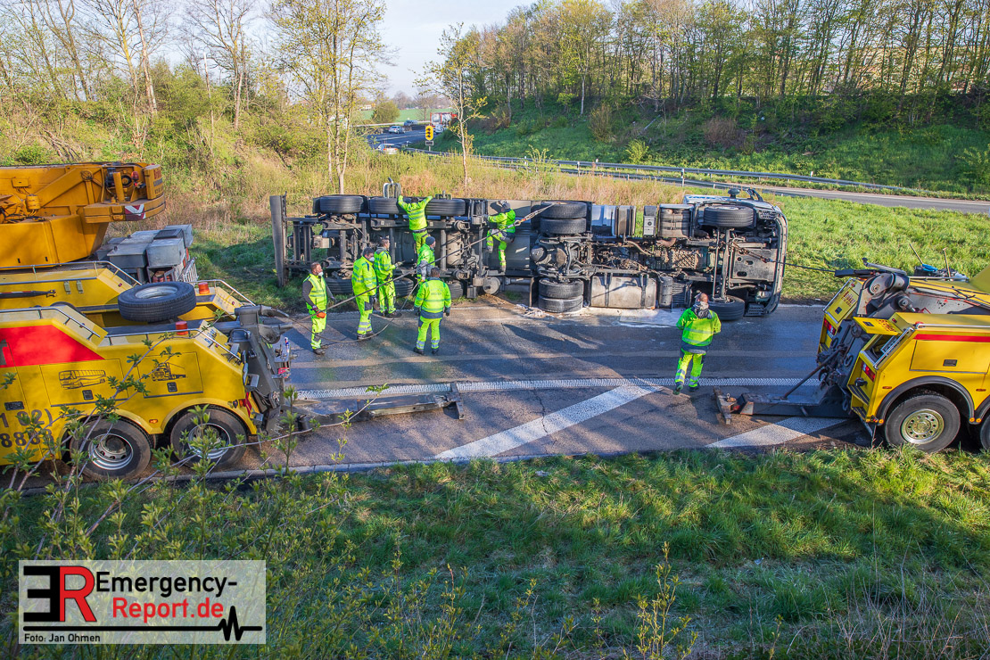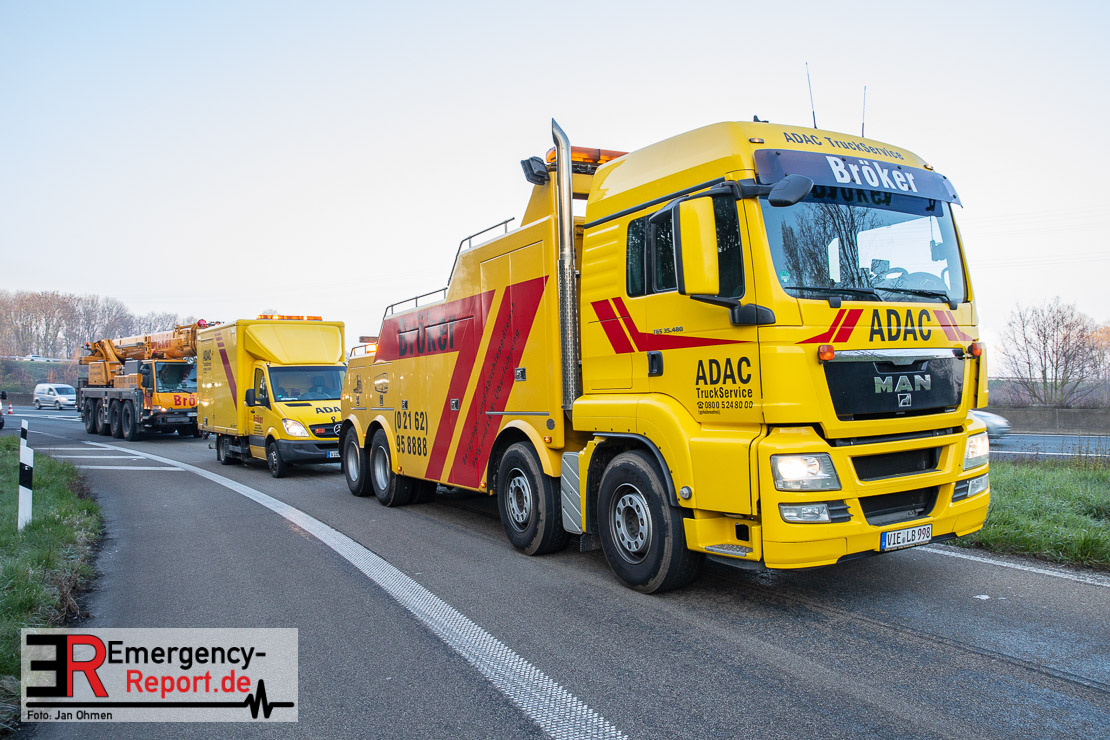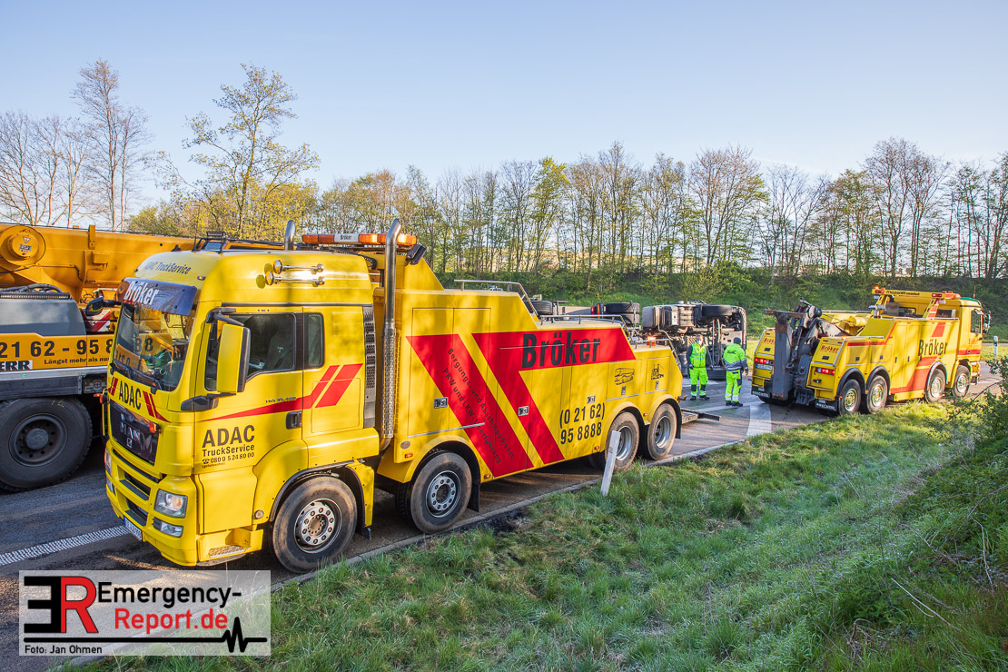 In der Nacht zum Donnerstag (15.04.2021) ereignete sich gegen 3:40 Uhr ein Verkehrsunfall. Ein Sattelzug mit Siloauflieger befuhr die BAB 57 in Richtung Neuss. Beim Verlassen der Autobahn sind Zugmaschine und Auflieger in der Abfahrt Dormagen von der Fahrbahn abgekommen und umgestürzt. Da beim Notruf weder die Örtlichkeit noch das Ereignis klar waren, wurden jeweils Rettungsdienst und Feuerwehreinheiten aus Dormagen und Köln entsandt. Bei Eintreffen an der Einsatzstelle wurde festgestellt, dass der Fahrer verletzt und im Fahrerhaus eingeschlossen war. Betriebsmittel (Diesel- und Hydrauliköl) liefen aus den Fahrzeugen aus. Es kam zu einem geringen Produktaustritt aus dem Sattelauflieger. Während sich ein Teil der eingesetzten Kräfte um die Menschenrettung kümmerte, wurden von anderen Einheiten der Brandschutz sichergestellt, die Einsatzstelle ausgeleuchtet und abgesichert, sowie die auslaufenden Medien eingedämmt. Weitere Erkundungen ergaben, dass es sich bei der Ladung nicht um Gefahrgut, sondern um gekochte Speiseabfälle handelt. Der Fahrer konnte zügig aus dem Fahrzeug befreit und einem Krankenhaus zugeführt werden. Zur Beurteilung einer Grundwassergefährdung wurde die Untere Wasserbehörde (Rhein-Kreis Neuss) an die Einsatzstelle gerufen. Im weiteren Verlauf wird der Inhalt des Aufliegers in ein Ersatzfahrzeug umgepumpt. Dann kann mit der Bergung des verunfallten Fahrzeuges begonnen werden. Zurzeit geht die Polizei davon aus, dass die Abfahrt Dormagen noch bis in den Donnerstagnachmittag hinein gesperrt bleiben muss.