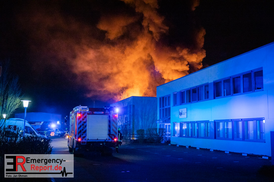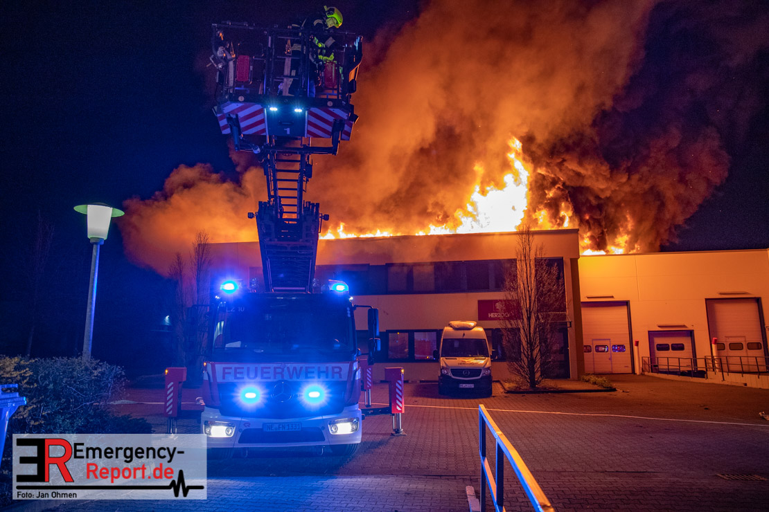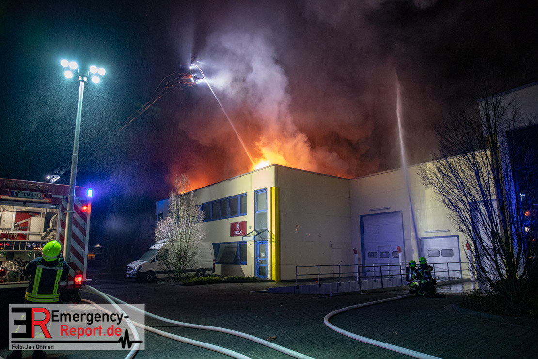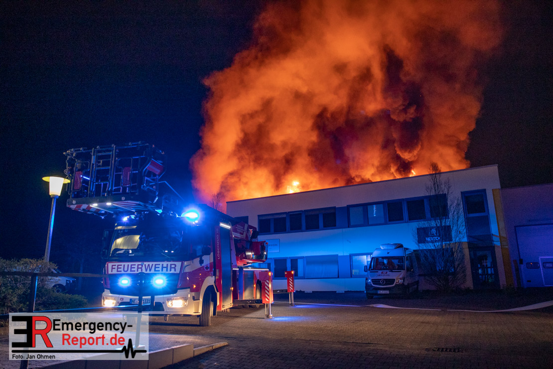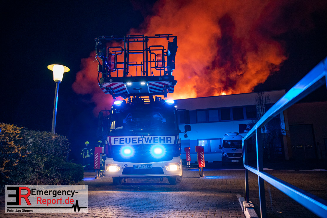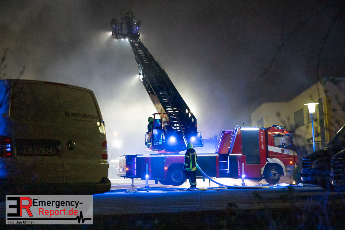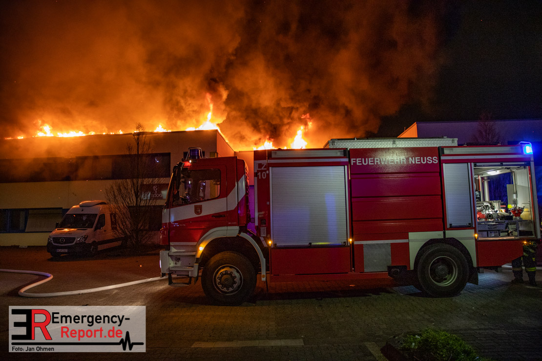 Am Sperberweg in Neuss kam es heute Nacht (17.03.2020) zu einem Brand in einer 40m x 10m großen Produktionshalle. Gegen Mitternacht bemerkten Passanten Feuerschein und alarmierten die Feuerwehr. Auf der Anfahrt war bereits eine massive Rauchsäule zu sehen, daraufhin wurden durch den Einsatzleiter direkt weitere Kräfte nachgefordert.