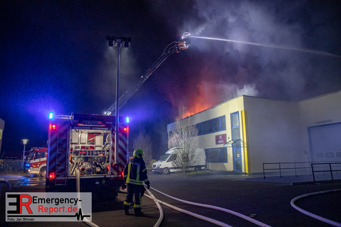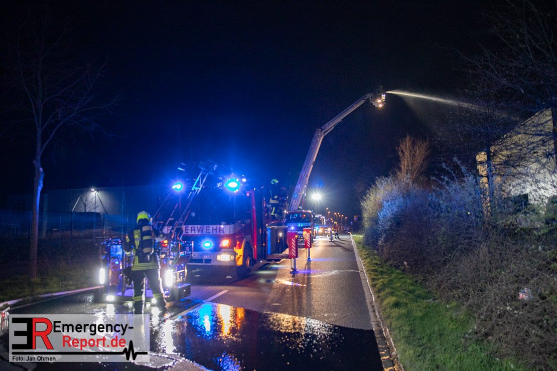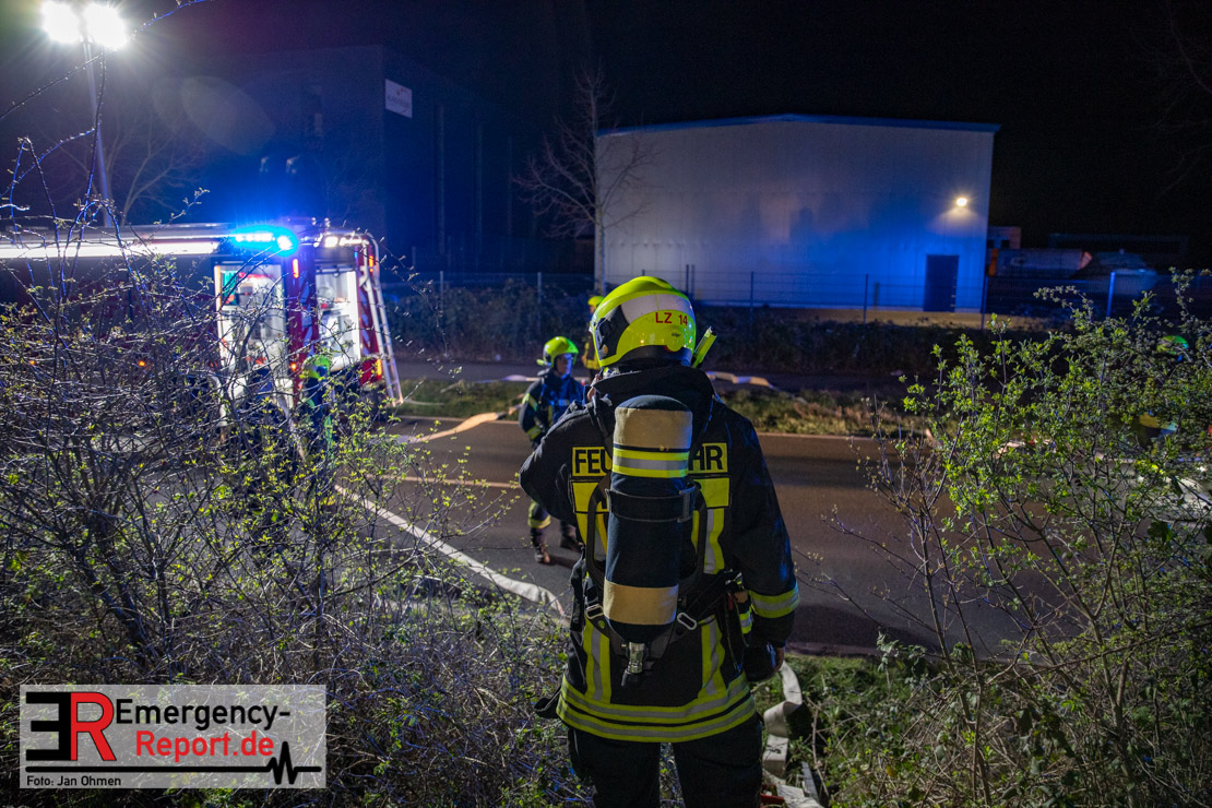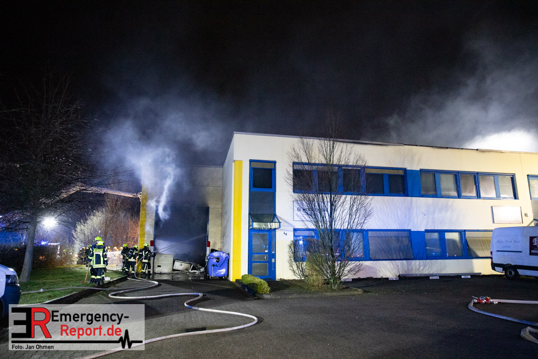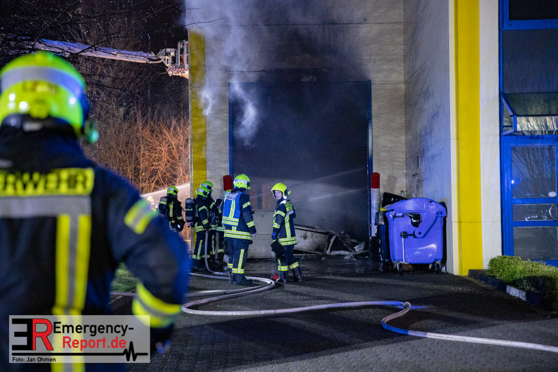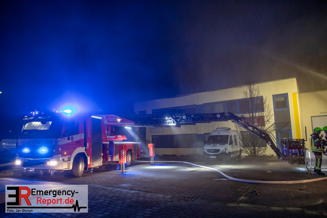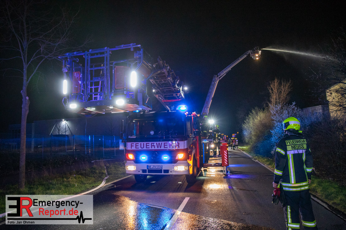 Am Sperberweg in Neuss kam es heute Nacht (17.03.2020) zu einem Brand in einer 40m x 10m großen Produktionshalle. Gegen Mitternacht bemerkten Passanten Feuerschein und alarmierten die Feuerwehr. Auf der Anfahrt war bereits eine massive Rauchsäule zu sehen, daraufhin wurden durch den Einsatzleiter direkt weitere Kräfte nachgefordert.