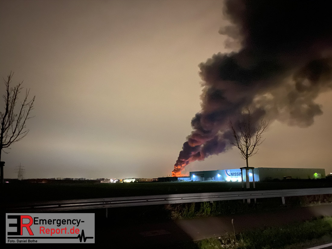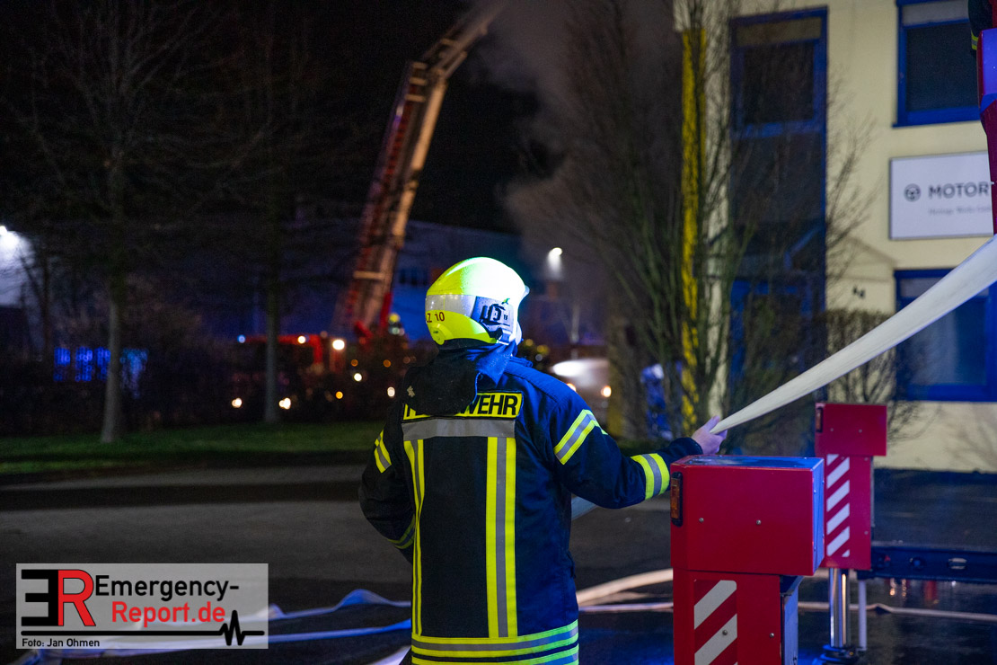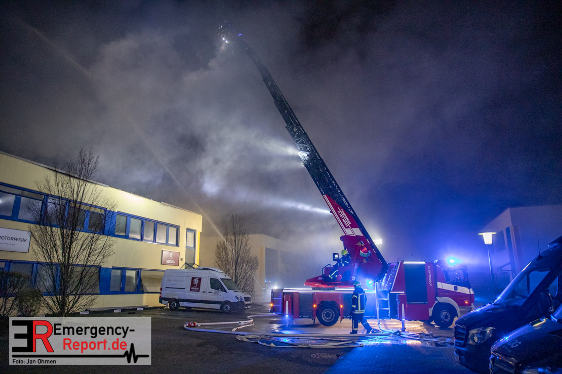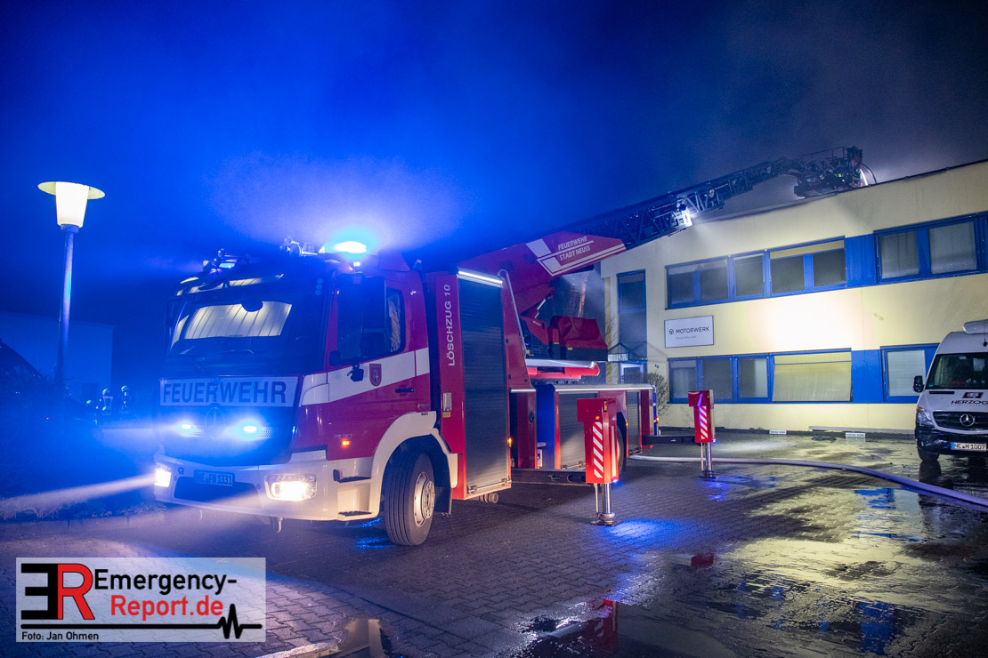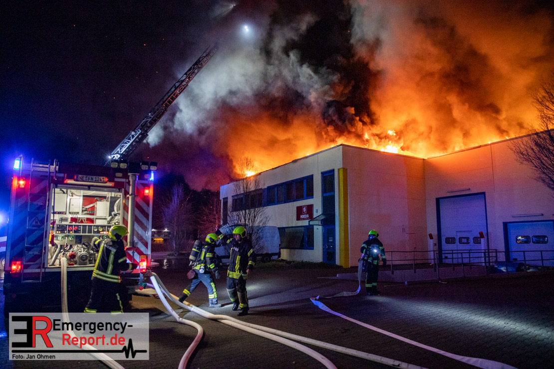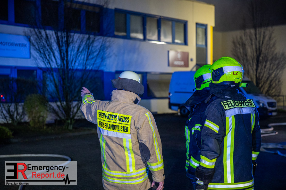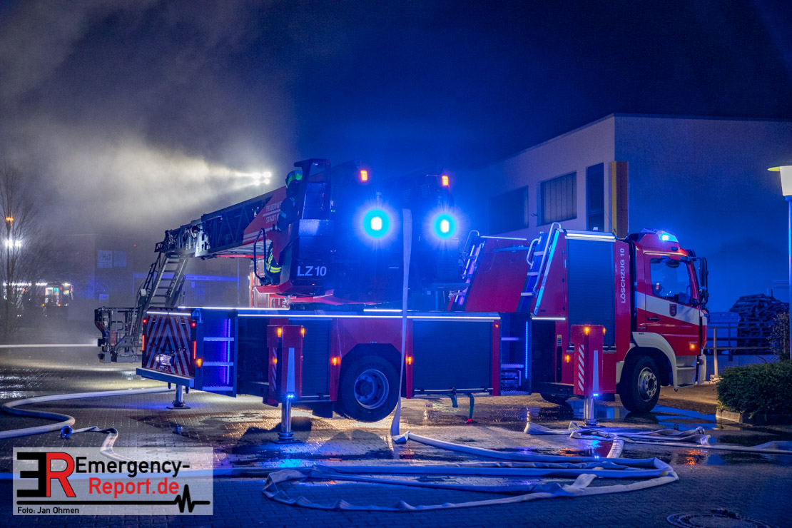 Am Sperberweg in Neuss kam es heute Nacht (17.03.2020) zu einem Brand in einer 40m x 10m großen Produktionshalle. Gegen Mitternacht bemerkten Passanten Feuerschein und alarmierten die Feuerwehr. Auf der Anfahrt war bereits eine massive Rauchsäule zu sehen, daraufhin wurden durch den Einsatzleiter direkt weitere Kräfte nachgefordert.