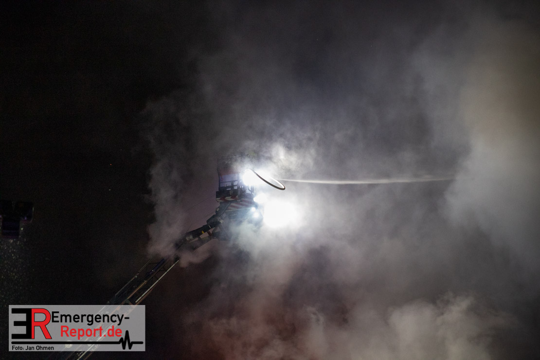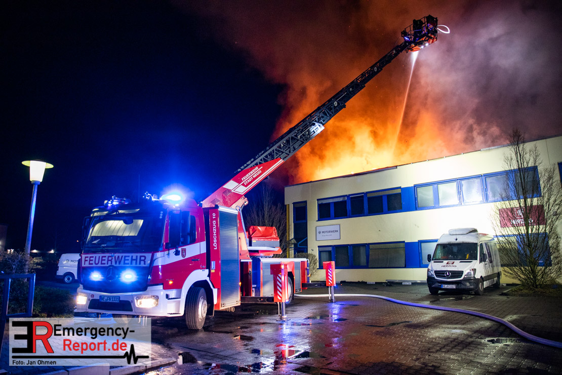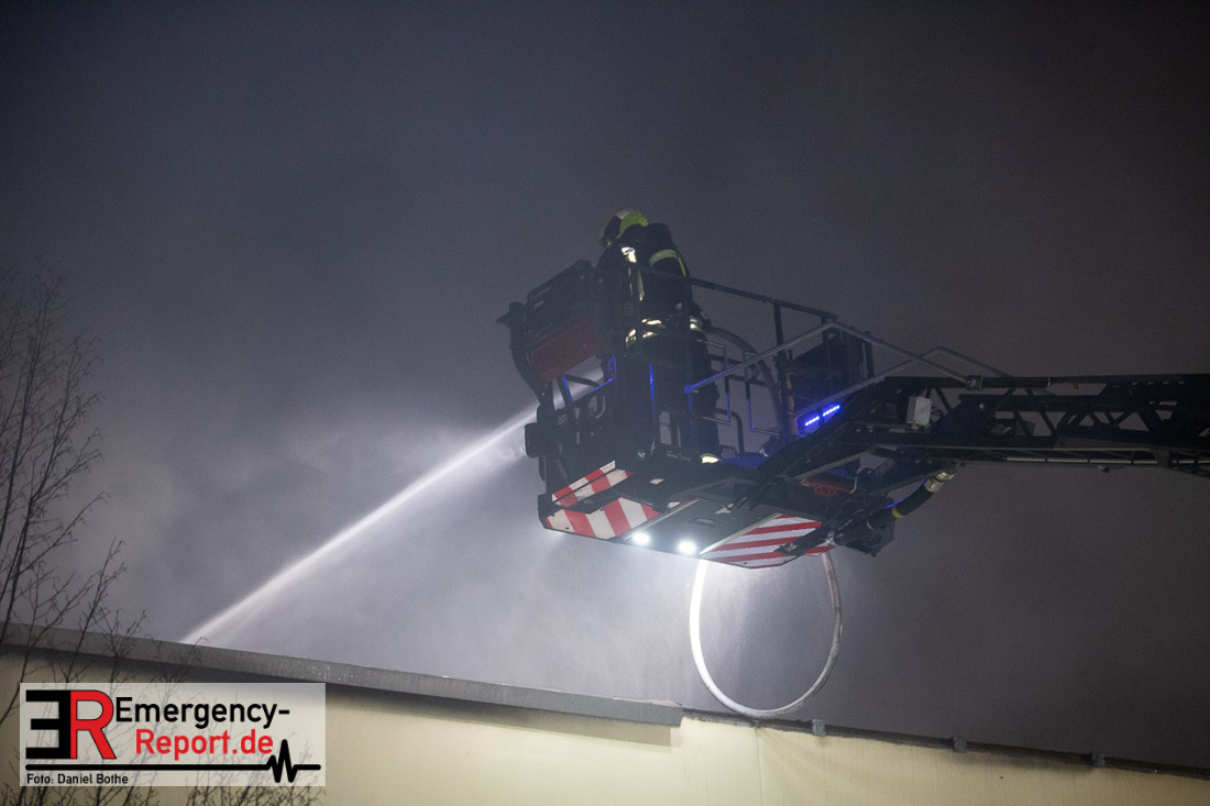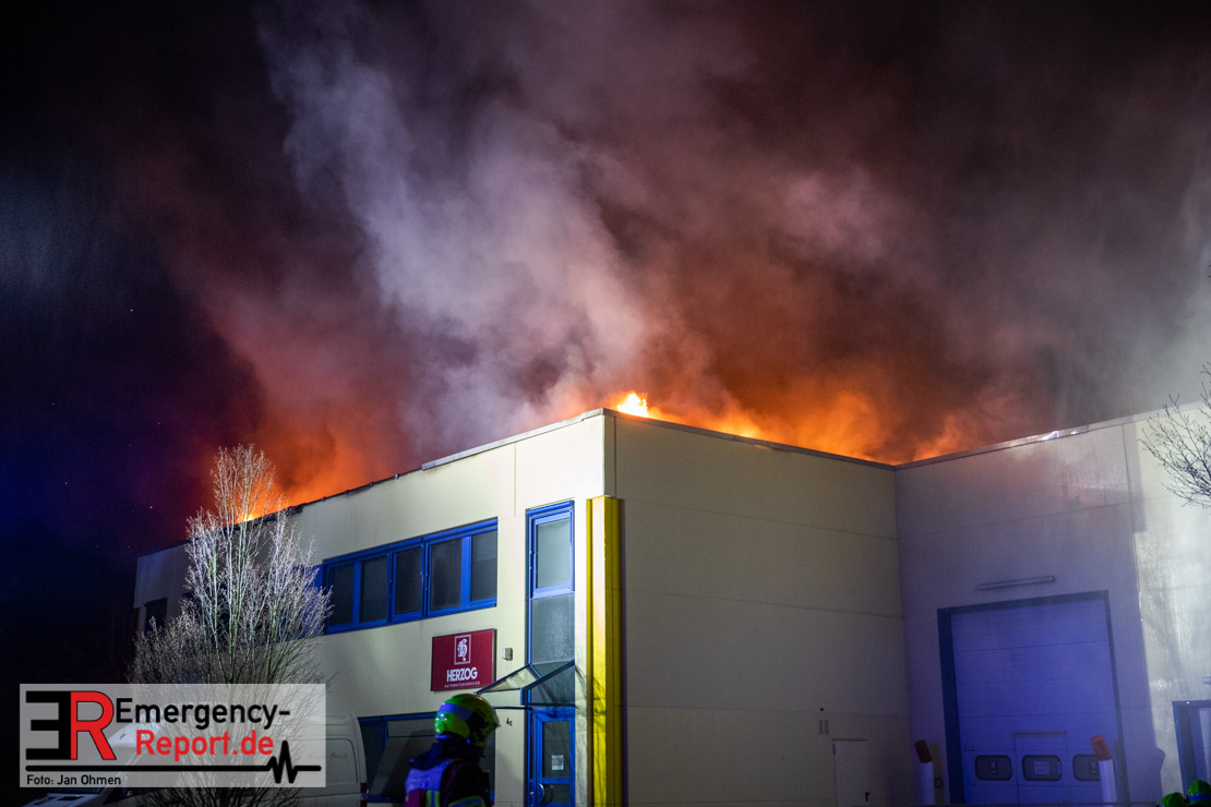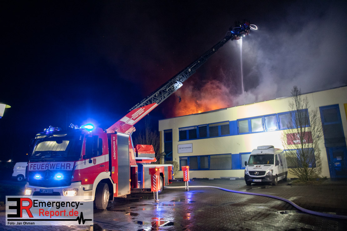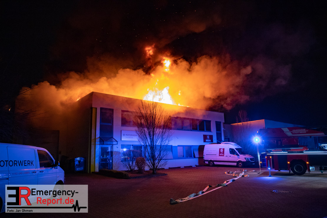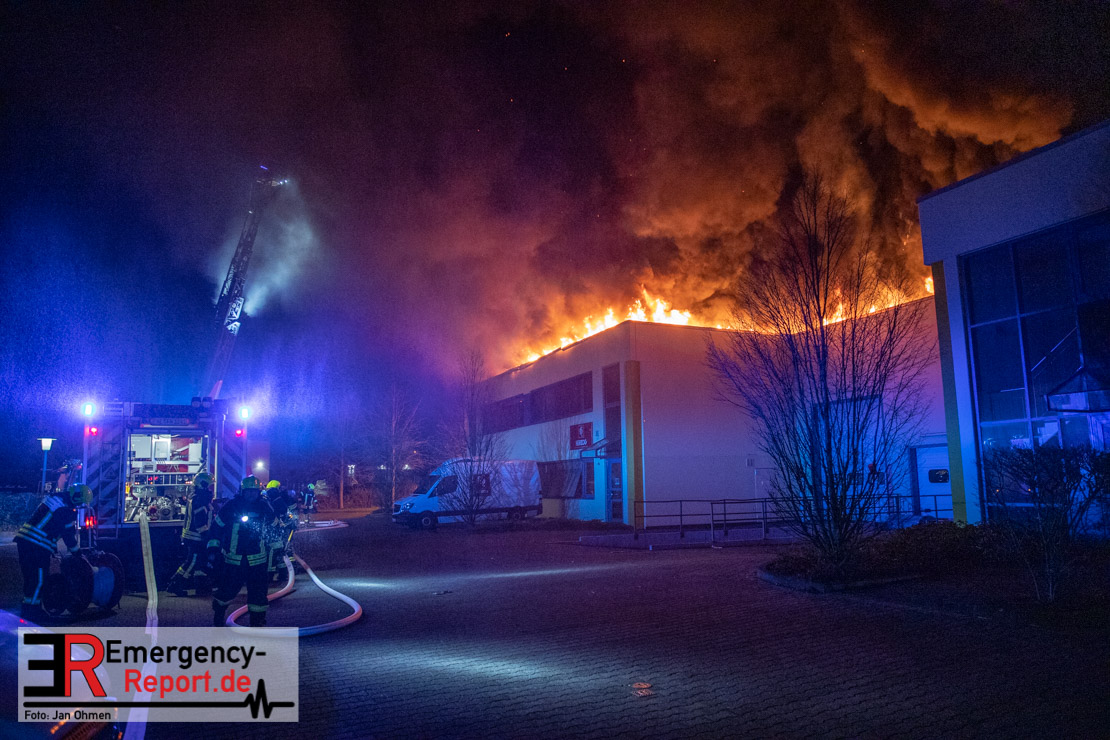 Am Sperberweg in Neuss kam es heute Nacht (17.03.2020) zu einem Brand in einer 40m x 10m großen Produktionshalle. Gegen Mitternacht bemerkten Passanten Feuerschein und alarmierten die Feuerwehr. Auf der Anfahrt war bereits eine massive Rauchsäule zu sehen, daraufhin wurden durch den Einsatzleiter direkt weitere Kräfte nachgefordert.