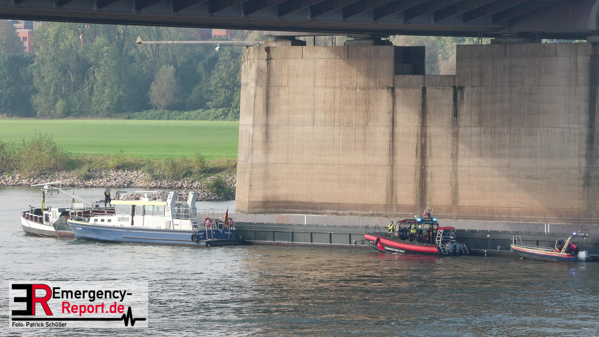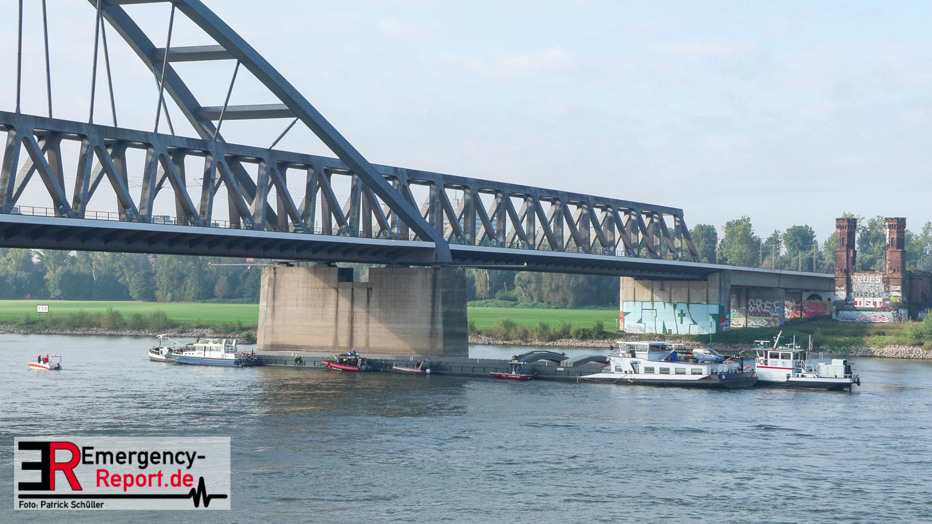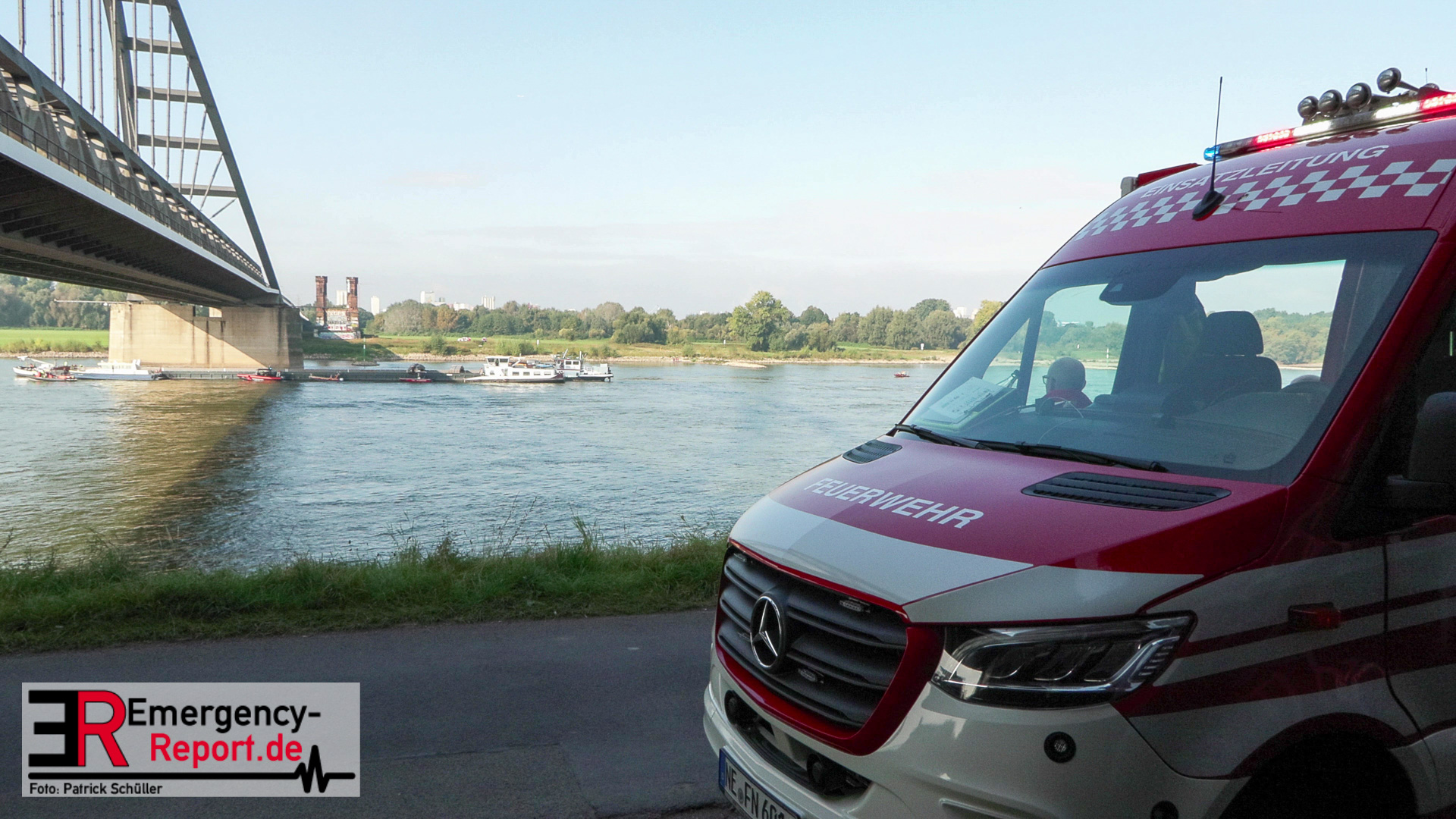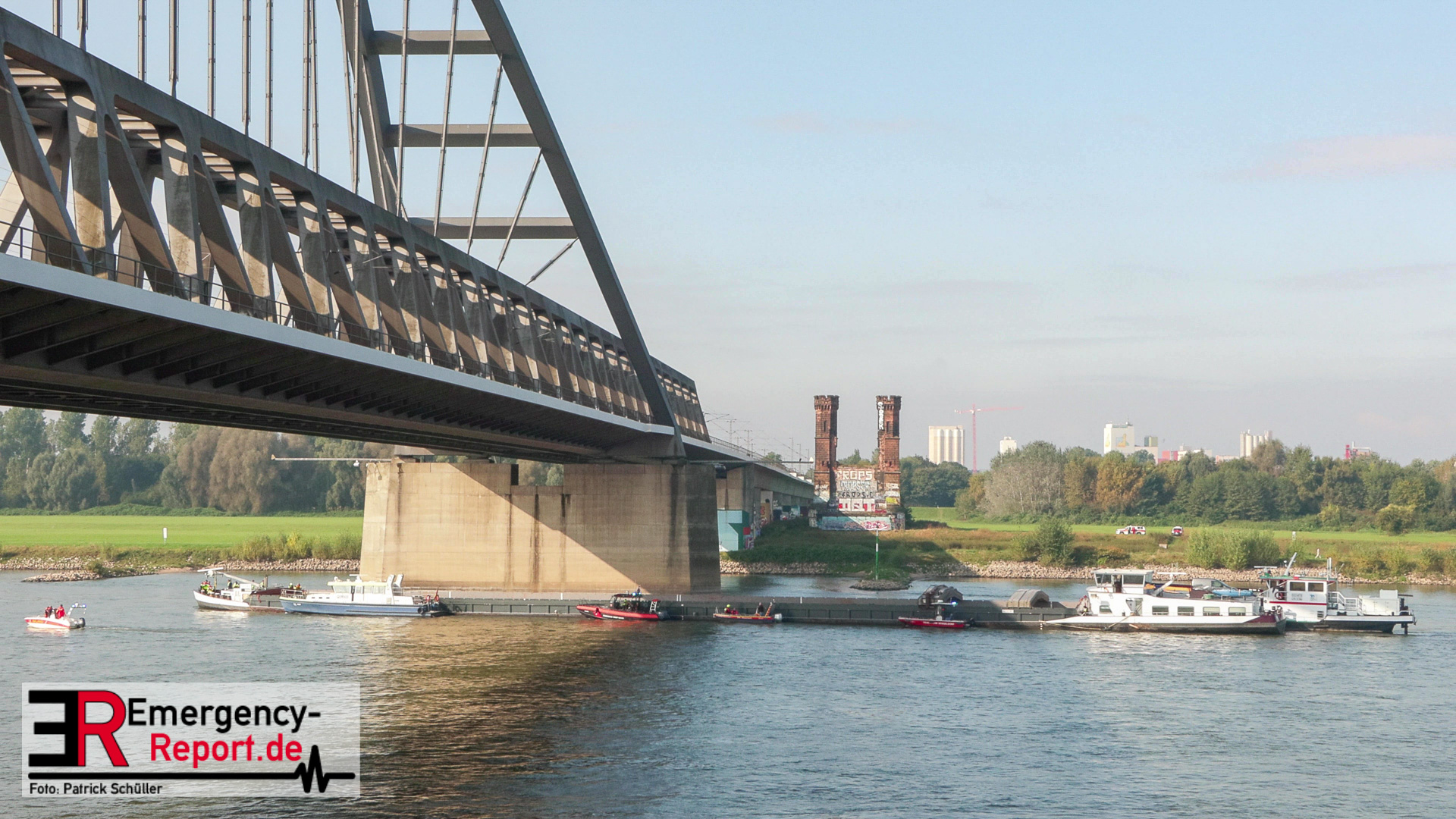 Am Montag, den 16.09.2024, wurden die Feuerwehr Neuss gemeinsam mit der Feuerwehr Düsseldorf auf den Rhein in Höhe des Neusser Rheinparkcenters alarmiert. Dort hatte aus bisher ungeklärter Ursache ein 110 Meter langes und rund 2700 Tonnen schweres Binnenschiff den Pfeiler der Hammer-Eisenbahnbrücke mit der rechten Schiffsseite gerammt. Aufgrund des Aufpralls drang Wasser in das Schiff ein und es drohte vollzulaufen und zu sinken.