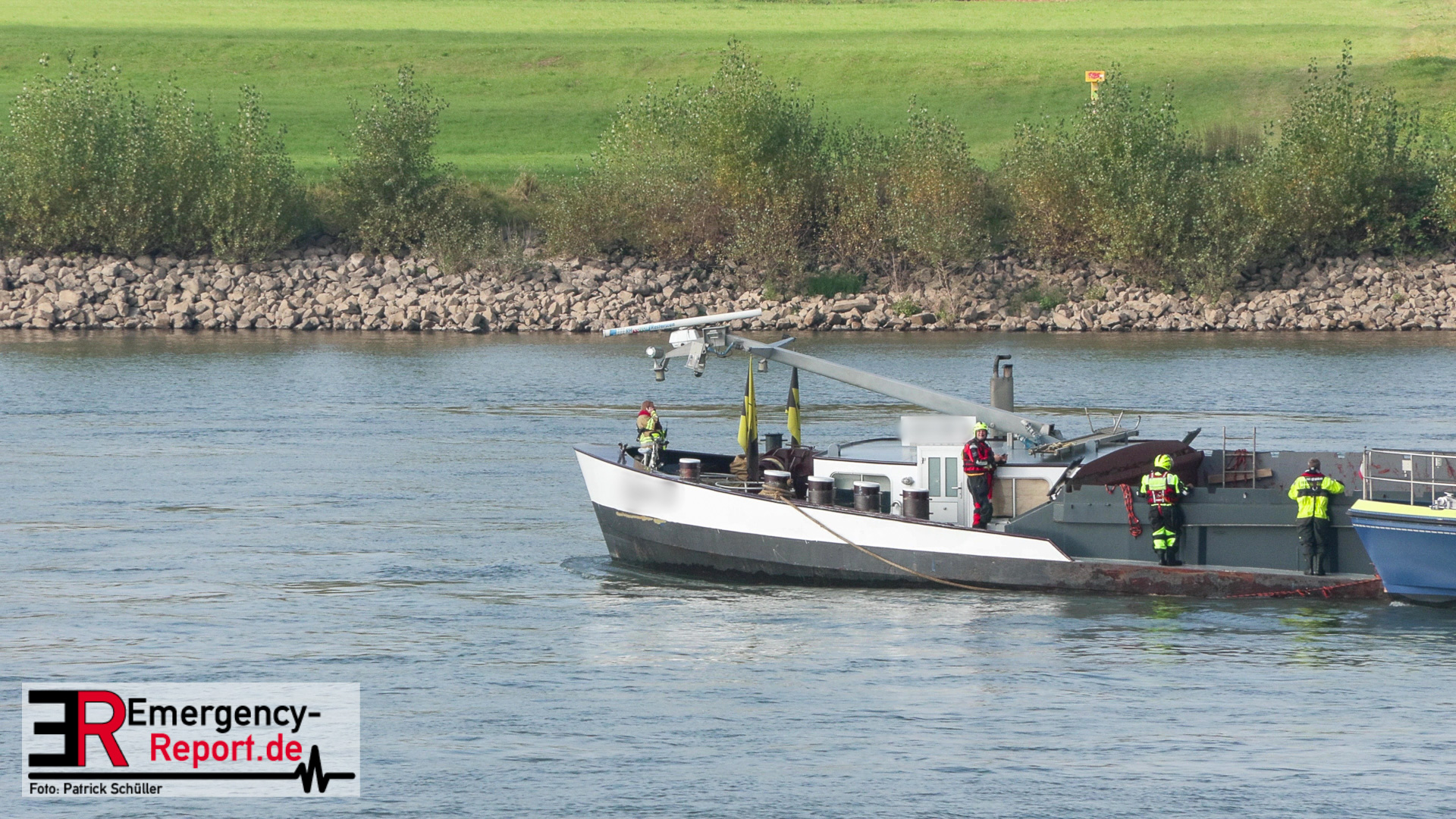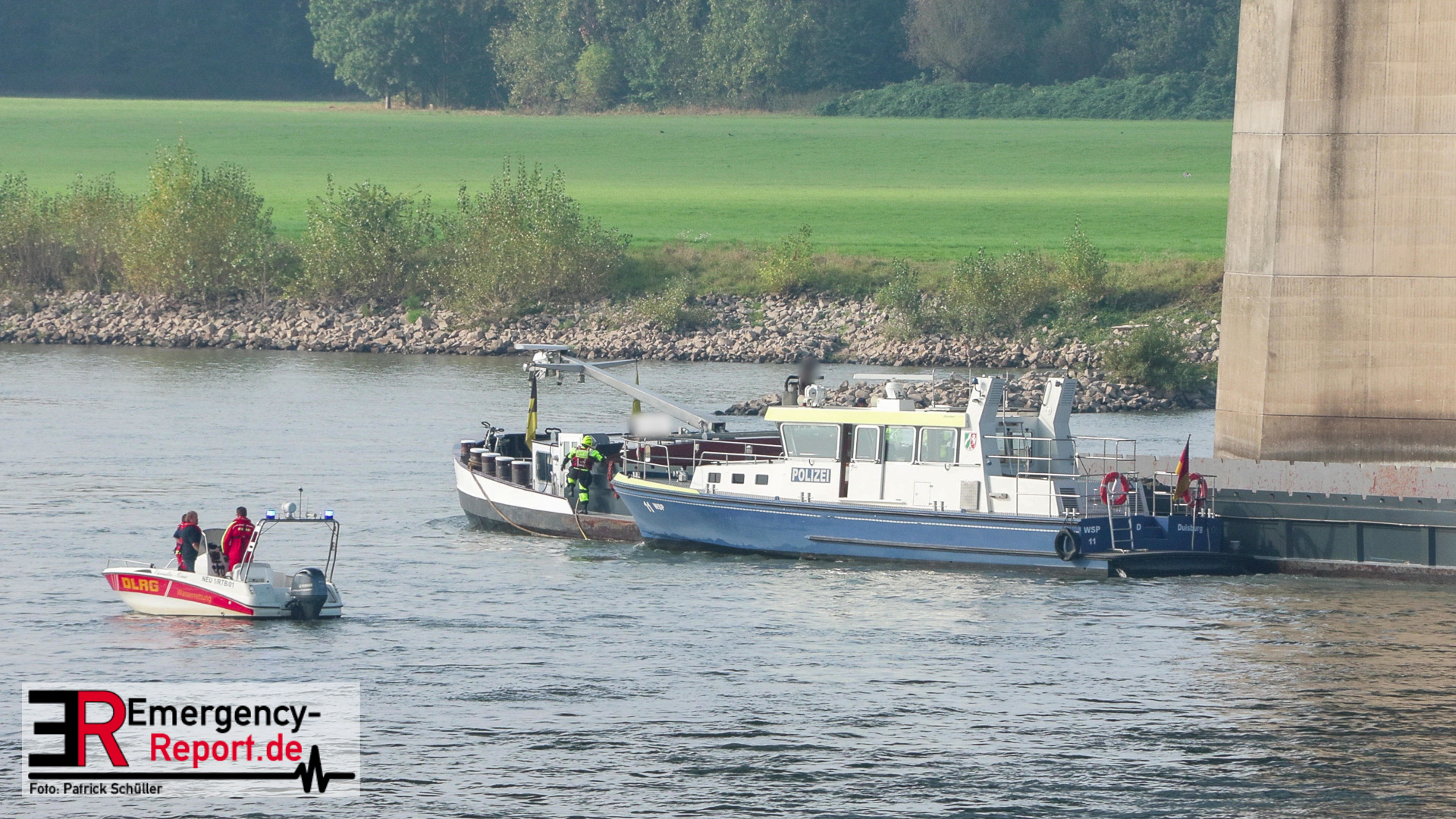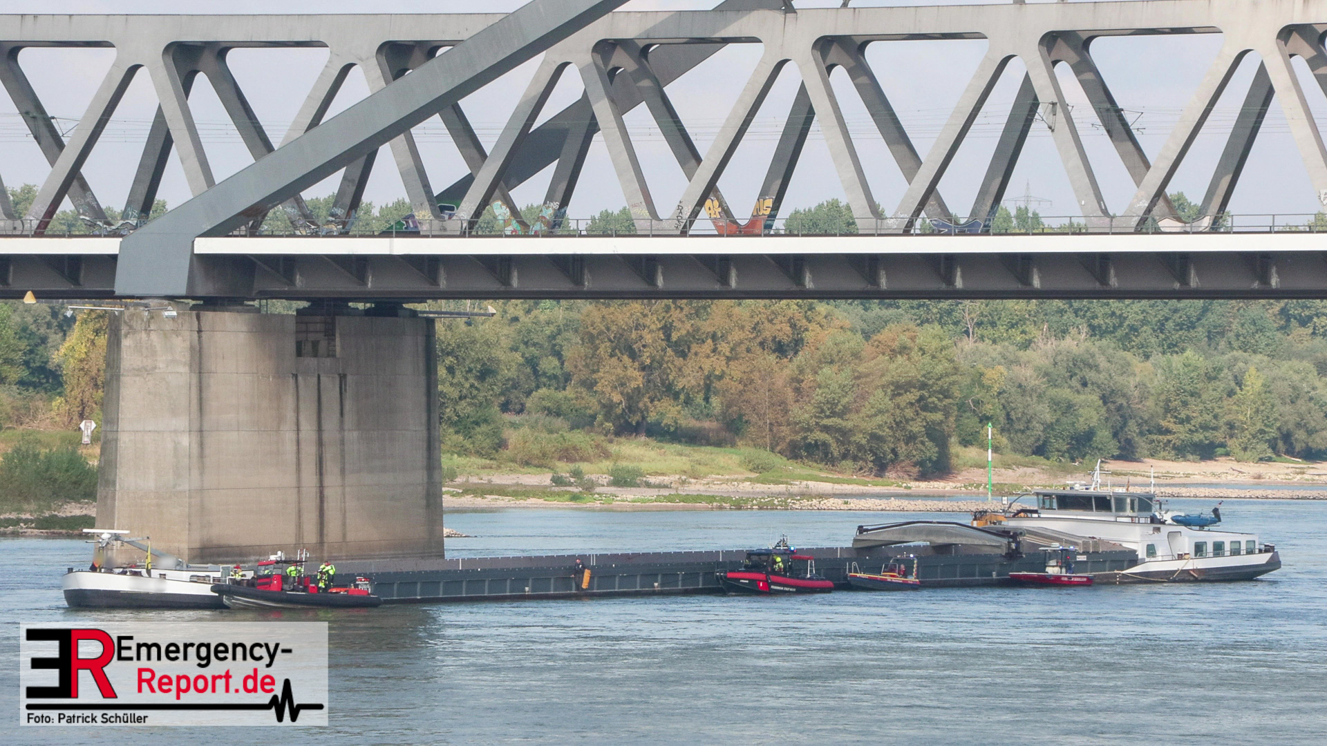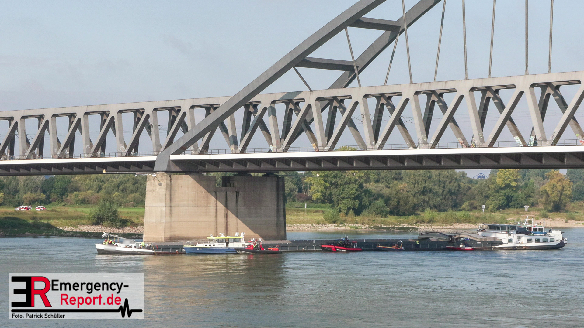 Am Montag, den 16.09.2024, wurden die Feuerwehr Neuss gemeinsam mit der Feuerwehr Düsseldorf auf den Rhein in Höhe des Neusser Rheinparkcenters alarmiert. Dort hatte aus bisher ungeklärter Ursache ein 110 Meter langes und rund 2700 Tonnen schweres Binnenschiff den Pfeiler der Hammer-Eisenbahnbrücke mit der rechten Schiffsseite gerammt. Aufgrund des Aufpralls drang Wasser in das Schiff ein und es drohte vollzulaufen und zu sinken.