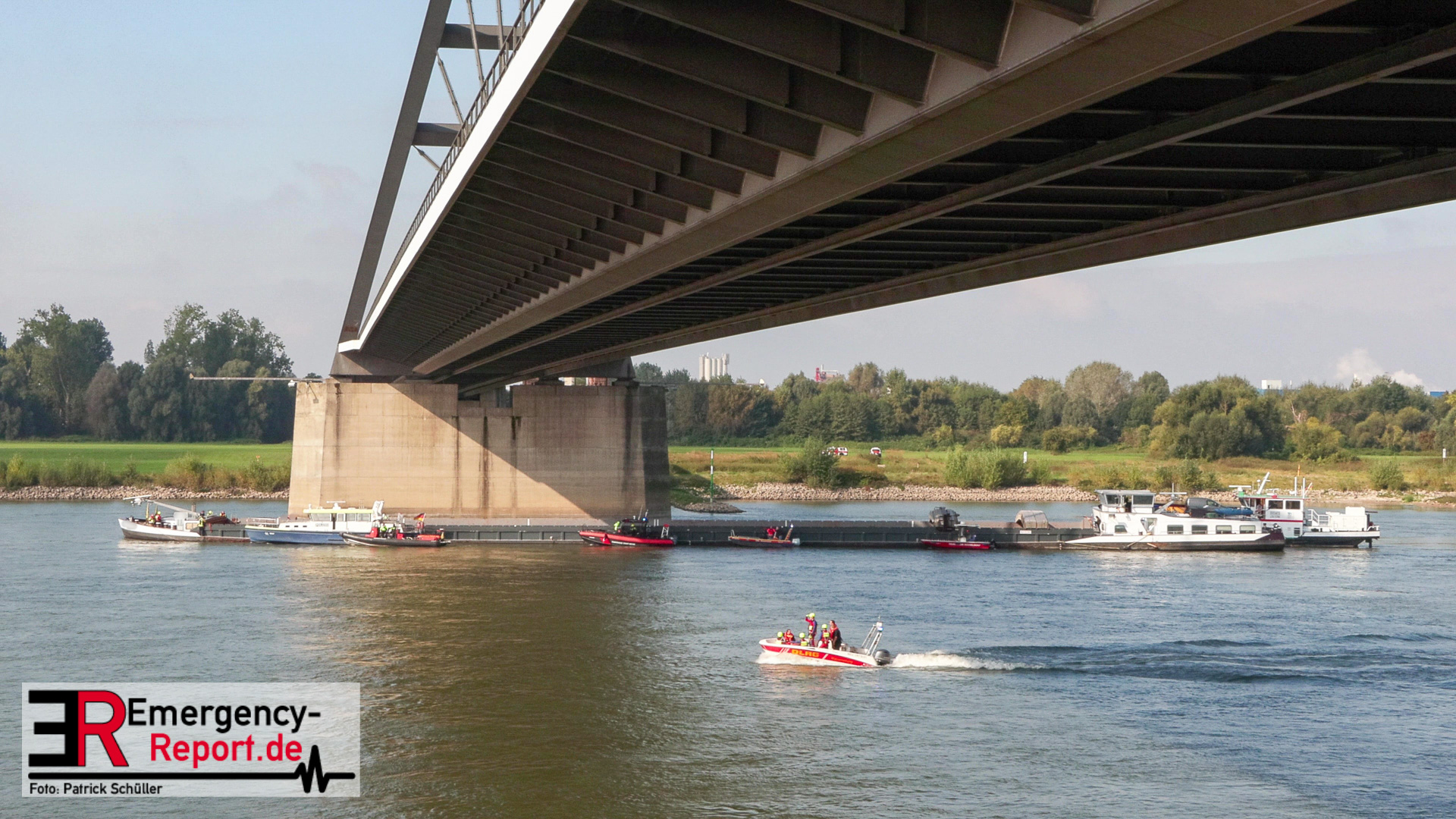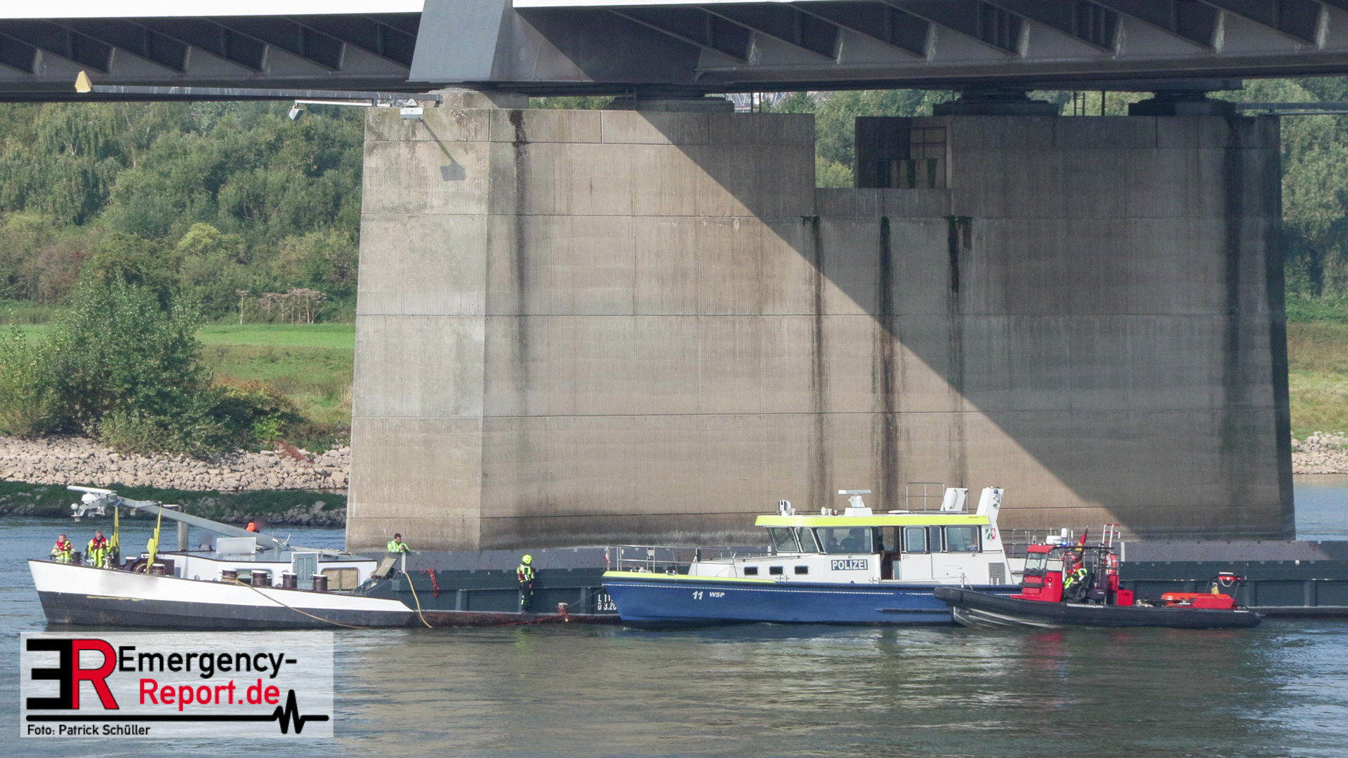 Die ersteintreffenden Kräfte der Feuerwehren Düsseldorf und Neuss fanden das Schiff schräg hinter dem Brückenpfeiler in Fließrichtung vor und konnten die ersten Meldungen bestätigen. Durch den Aufprall waren einige Schweißnähte in der doppelwandigen Hülle des Binnenschiffs gebrochen. Es drangen mehrere Kubikmeter Wasser in den Frachtraum ein, was zu einer Schieflage des Schiffs führte. Die Brücke bzw. der Brückenpfeiler zeigte hingegen keine offensichtlichen Schäden.