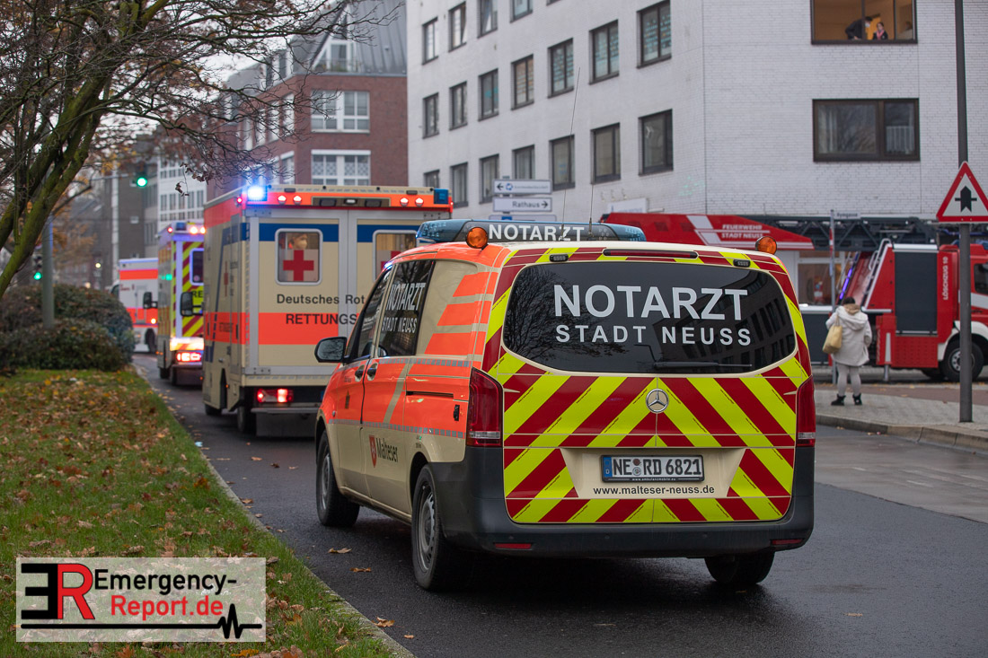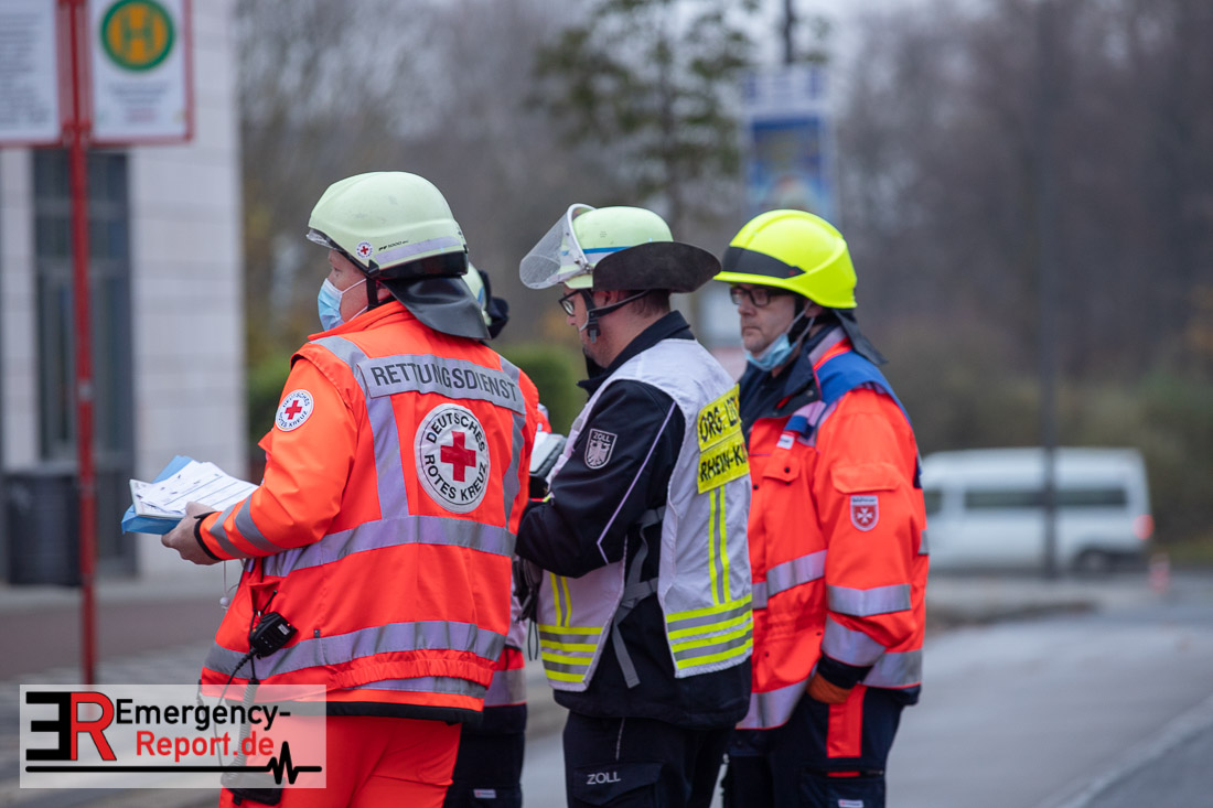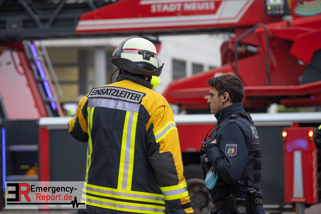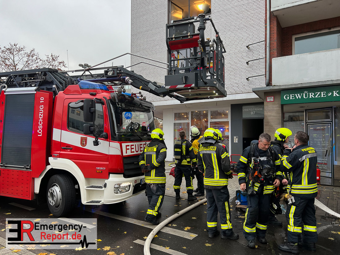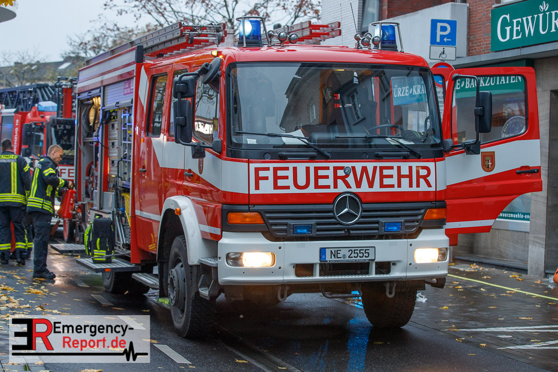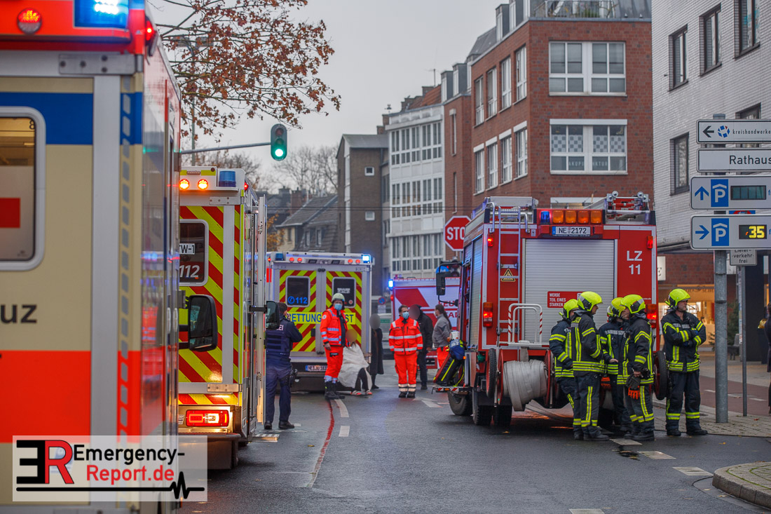 Am 17.11.2021 wurde die Feuerwehr um 15:10 Uhr zu einem Geschäftshaus an der Oberstraße gerufen. Dort war im Keller ein Feuer ausgebrochen. Bei Eintreffen der Einsatzkräfte gab es eine Rauchentwicklung aus der Eingangstüre des Gebäudes, erste Erkundungen ergaben einen Brand im Kellerbereich des Treppenraumes. Noch während der Erkundung flüchteten einige Personen aus den oberen Geschossen über den Treppenraum ins Freie, diese wurden durch die Feuerwehr gesammelt betreut. Der Brand wurde von einem Trupp unter schwerem Atemschutz gelöscht, gebrannt hatte eine Papiertonne im Keller unter dem Treppenabsatz. Aufwändig gestaltete sich die anschließende Kontrolle und Entrauchung des Gebäudes, da für viele Bereiche zunächst keine Schlüssel verfügbar waren. Am Ende konnten aber alle Räumlichkeiten kontrolliert und maschinell entraucht werden. Die betroffenen Personen, deren Anzahl mit der Zeit immer weiter anwuchs, wurden in der Zwischenzeit vom Rettungsdienst gesichtet. Insgesamt wurden 17 Personen untersucht und rettungsdienstlich betreut. Zur Bewältigung der rettungsdienstlichen Lage wurde zwischenzeitlich der Leitende Notarzt und der organisatorische Leiter Rettungsdienst sowie eine Rettungsdienstkomponente aus Düsseldorf, die aus mehreren Rettungswagen und einem Notarzt besteht, hinzugezogen. Glücklicherweise konnten alle 17 Personen nach einer Untersuchung nach Hause entlassen werden.