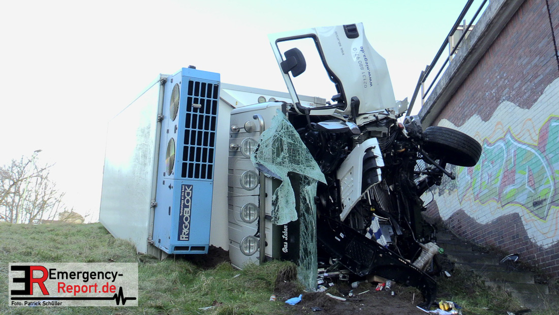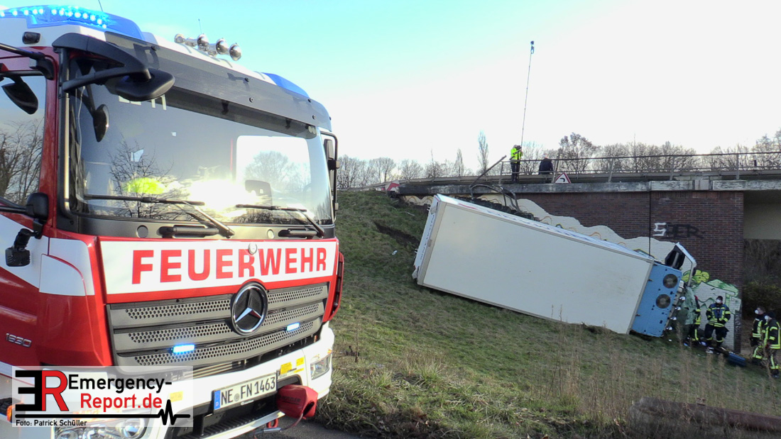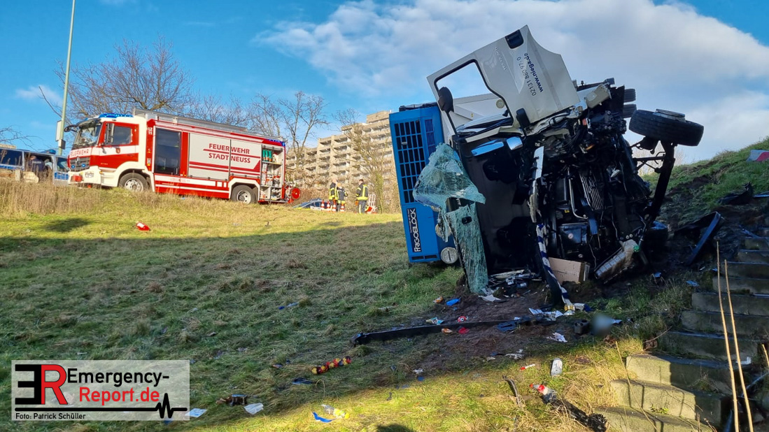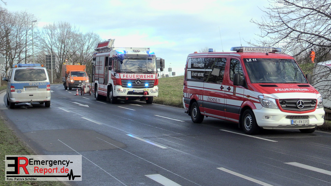 Am Donnerstag (20.01.2022), gegen 13:25 Uhr, kam es auf der Bundesstraße 1 aus Richtung Düsseldorf kommend zu einem Verkehrsunfall. Ein LKW war aus noch ungeklärter Ursache etwa 150 Meter hinter der Ausfahrt Rheinparkcenter nach rechts von der Fahrbahn abgekommen; das Fahrzeug stürzte etwa 6 Meter in die Tiefe. Der Fahrer wurde dabei schwer verletzt, der Beifahrer leicht. Beide wurden in ein Krankenhaus gebracht. Lebensgefahr besteht nicht. Während der Verkehrsunfallaufnahme musste die Bundesstraße 1 gesperrt werden. Für die Unfallaufnahme ist zusätzlich das zentrale Verkehrsunfallaufnahmeteam im Einsatz.